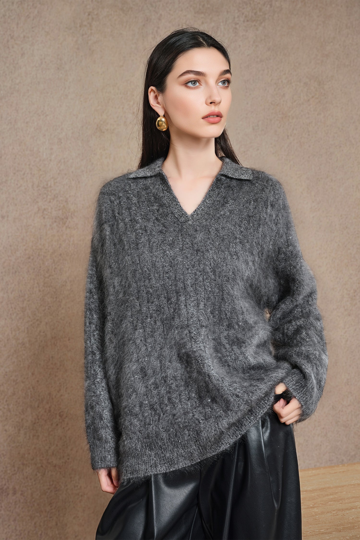Brushed Cashmere Sequin Cable Polo Sweater in Top-Tier Italian Yarn