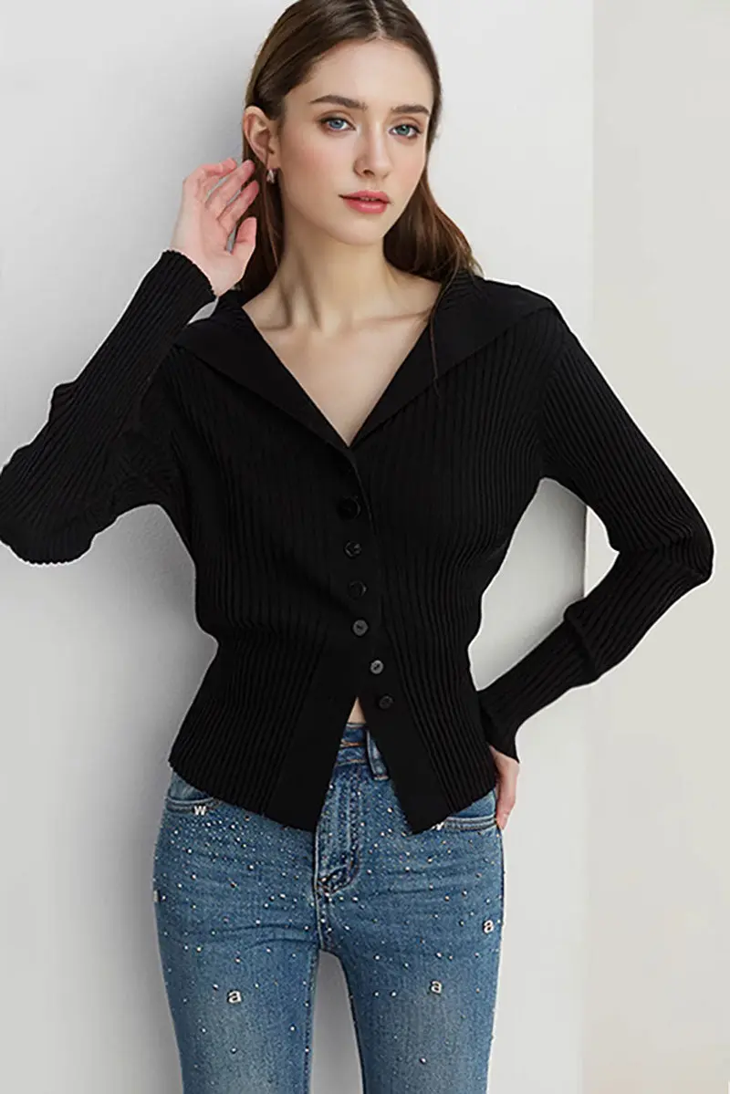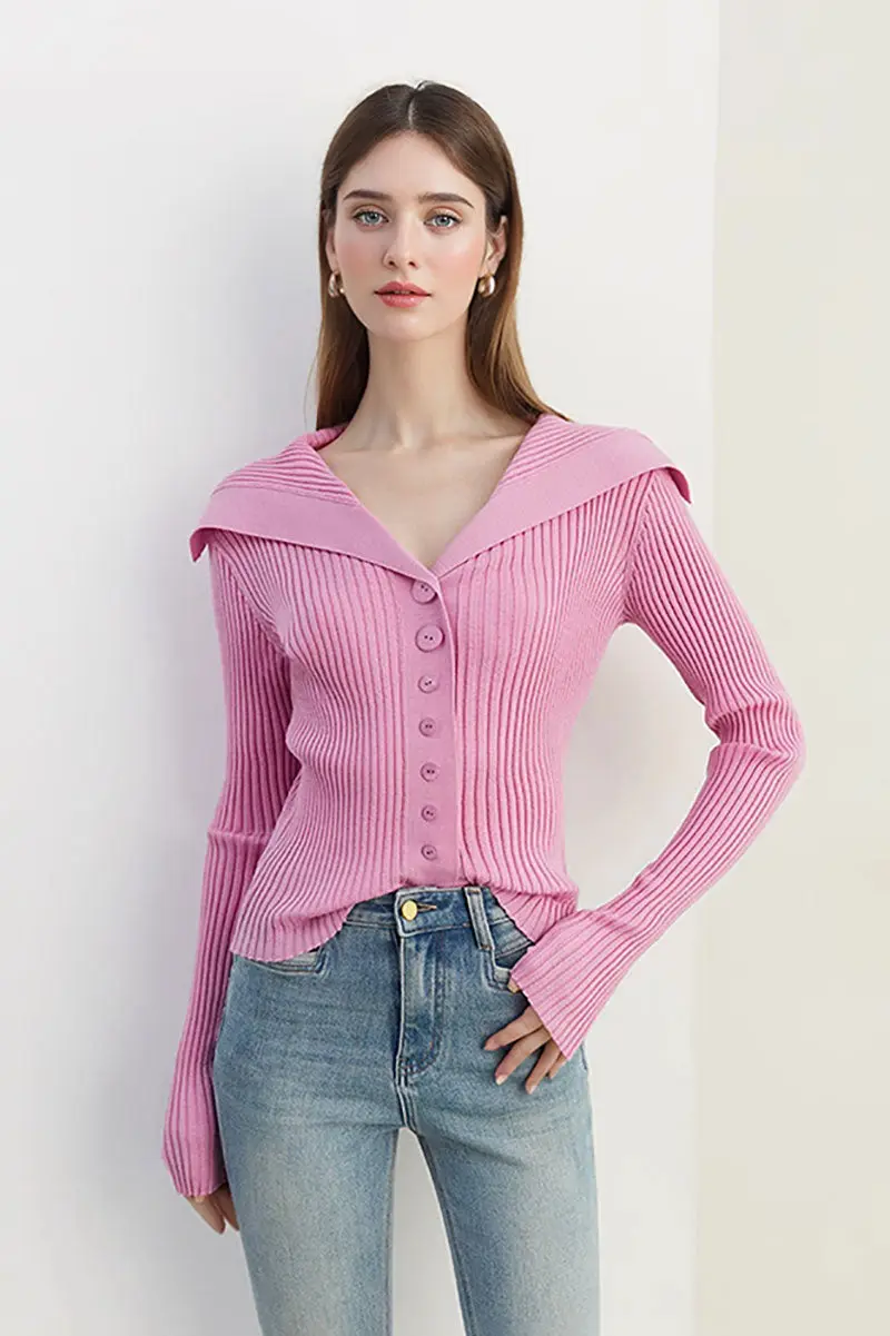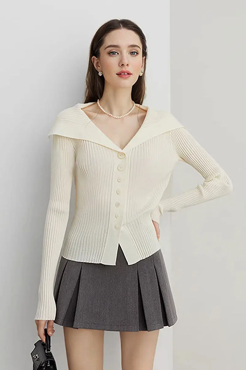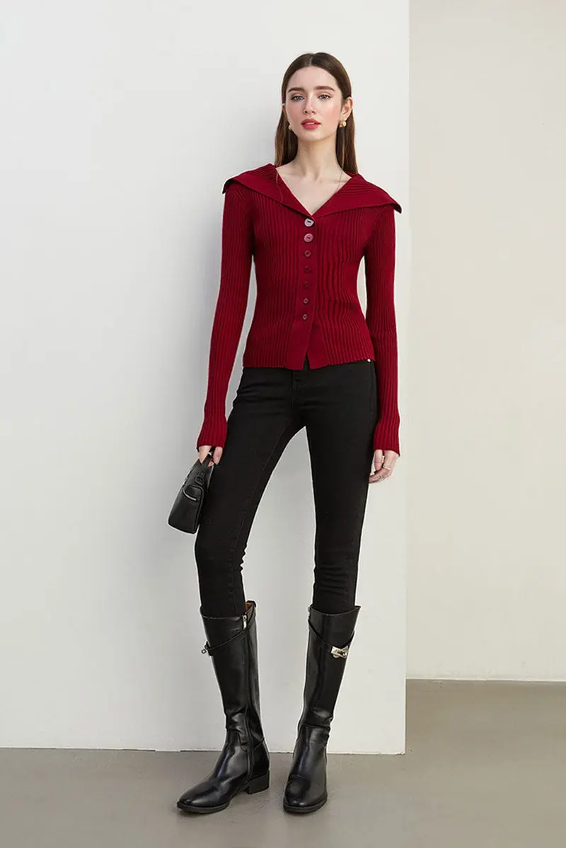 100 Washable Wool Ribbed Cardigan with Oversized Collar