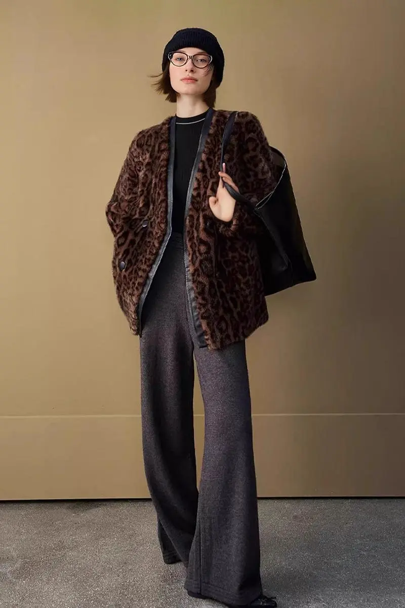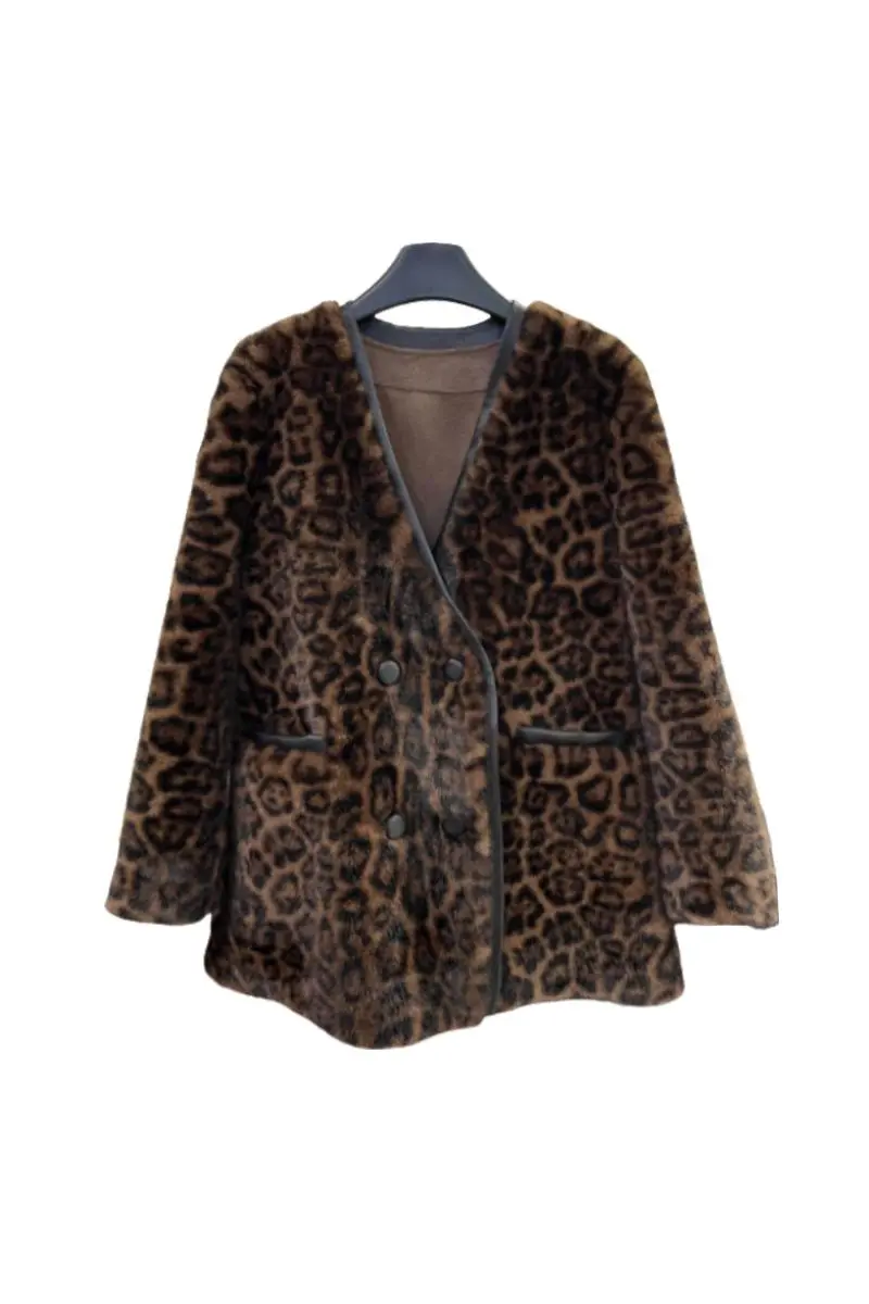 Vintage Leopard Print Collarless Mid-Length Faux Fur Coat