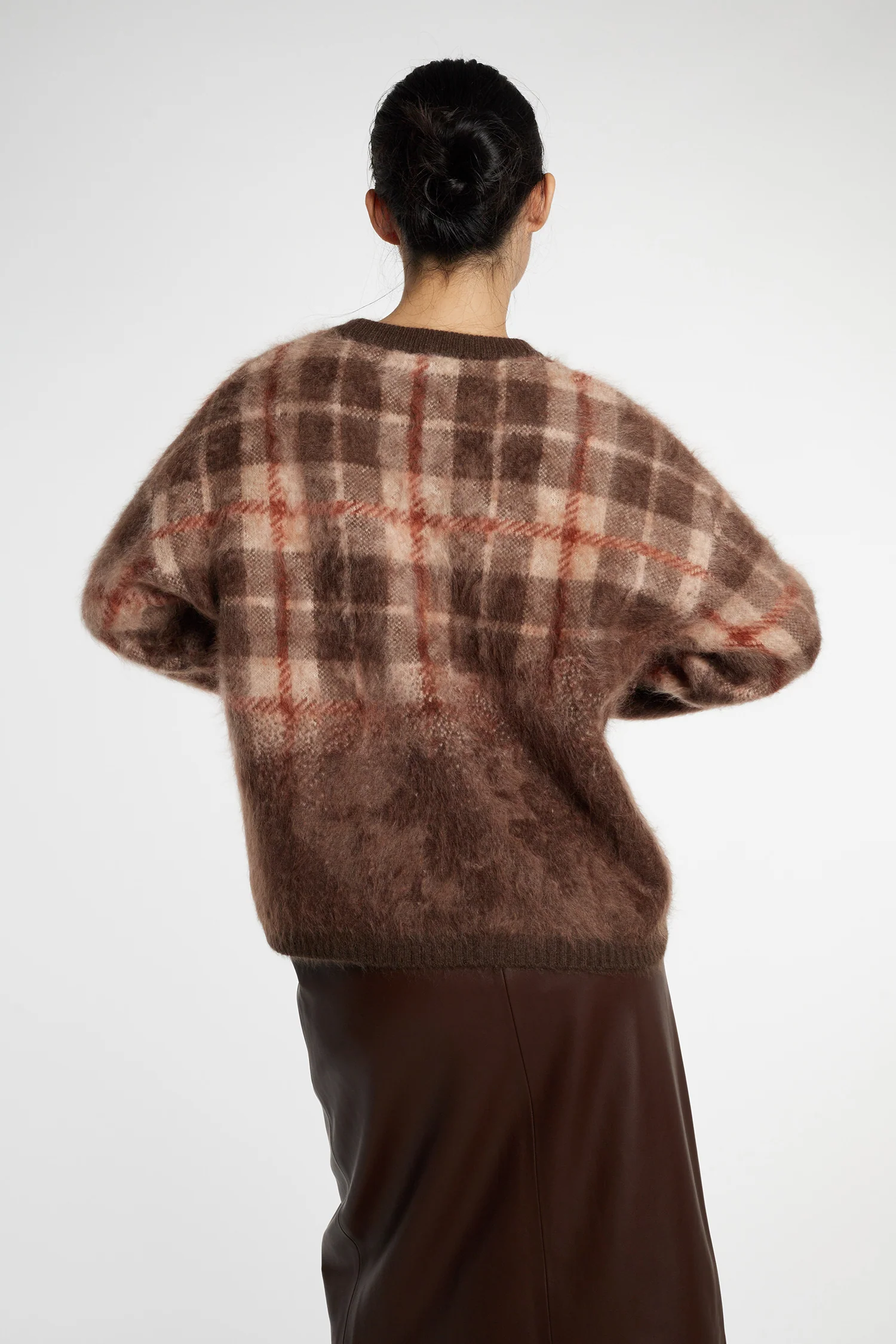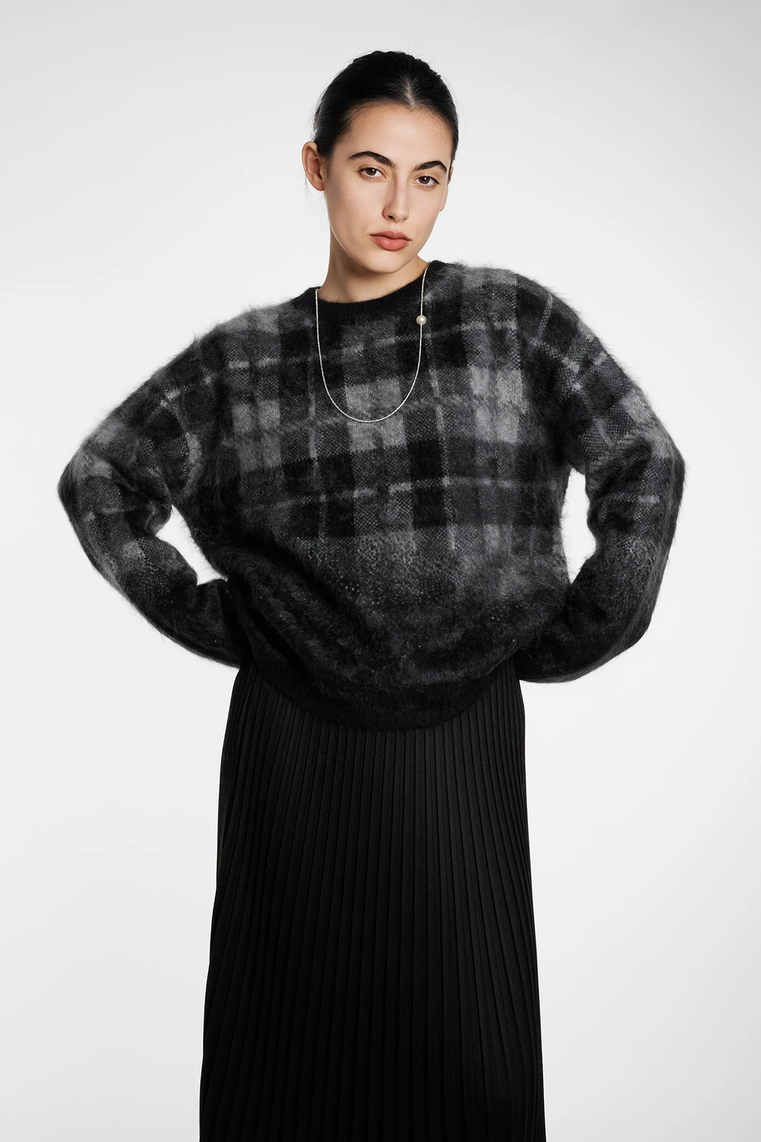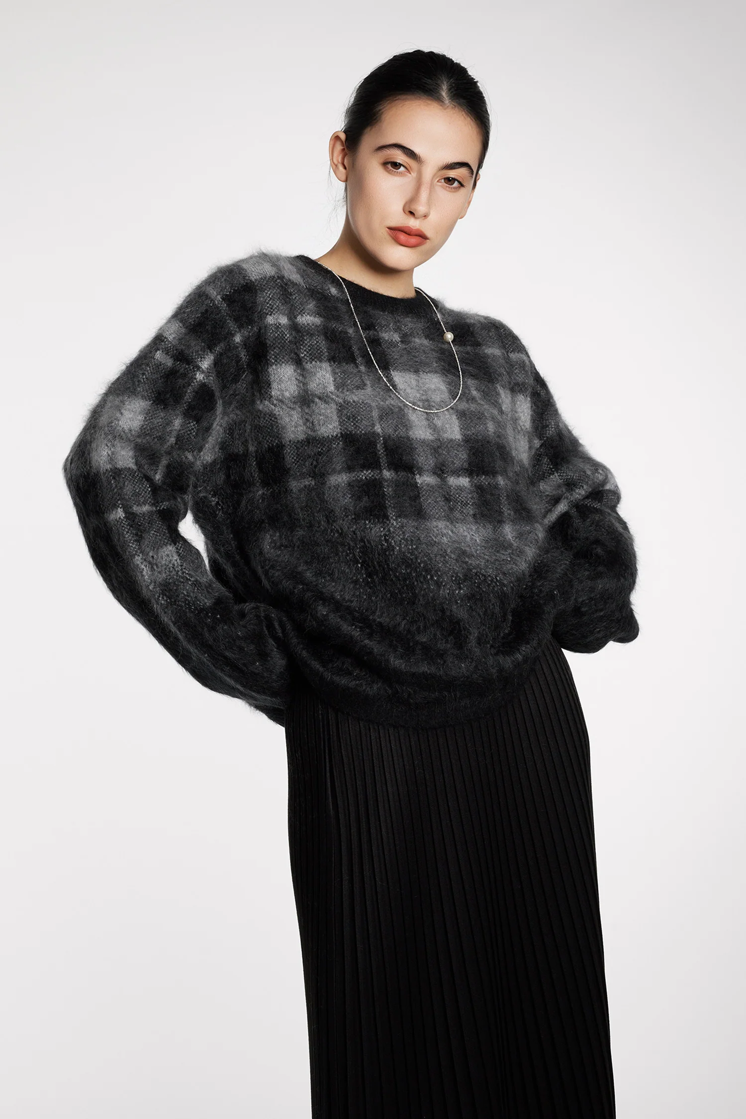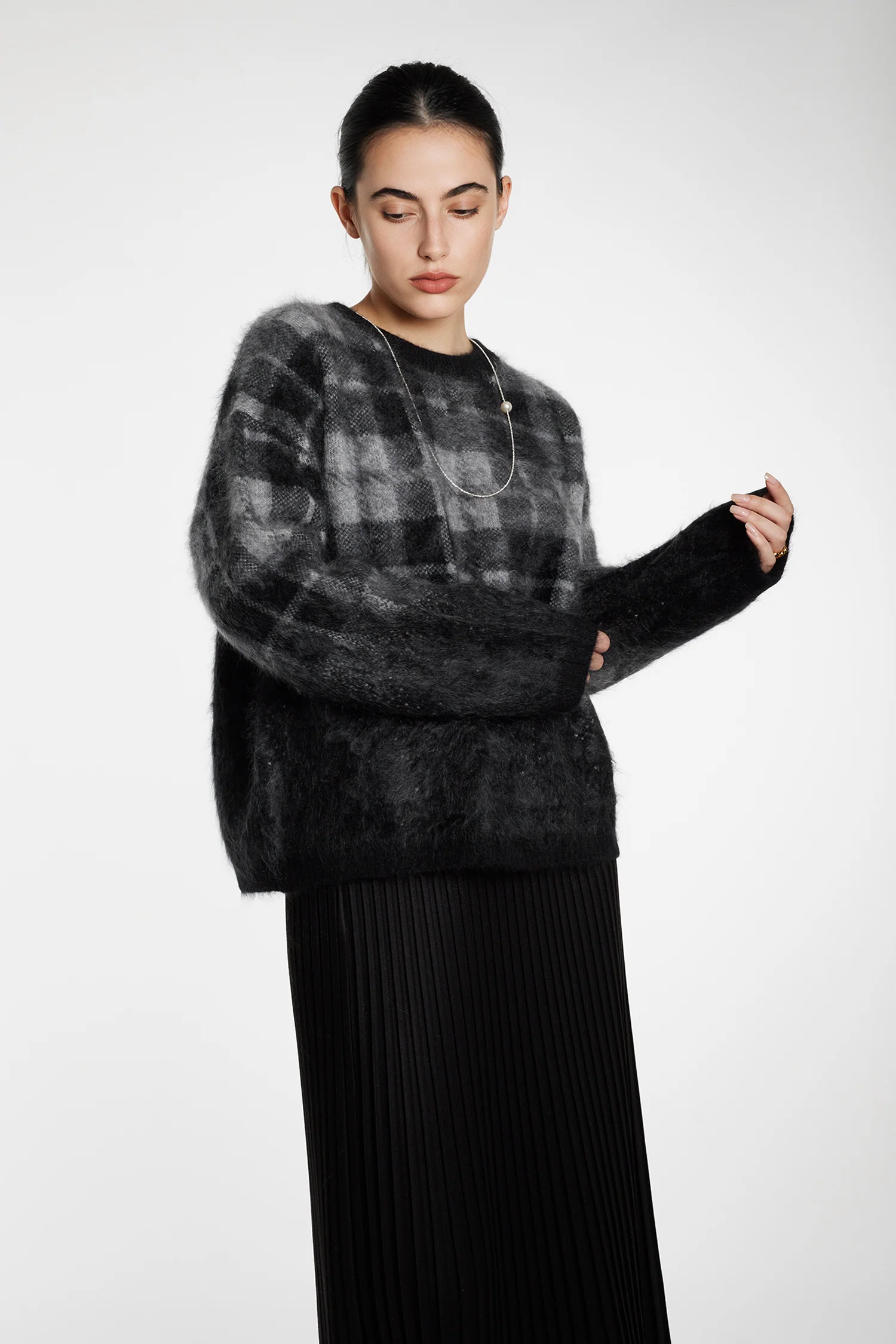 Fuzzy Brushed Cashmere Plaid Pullover Sweater