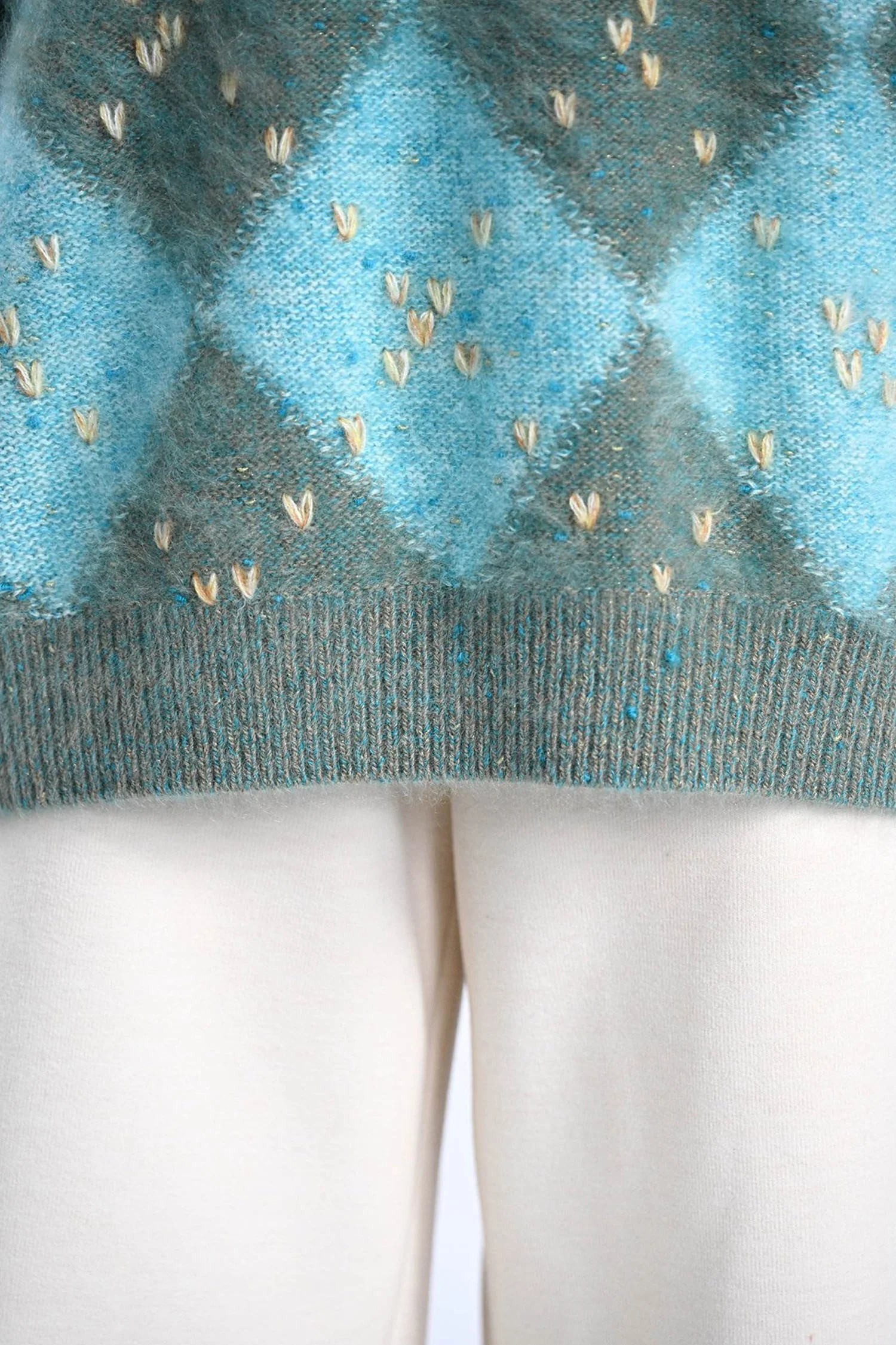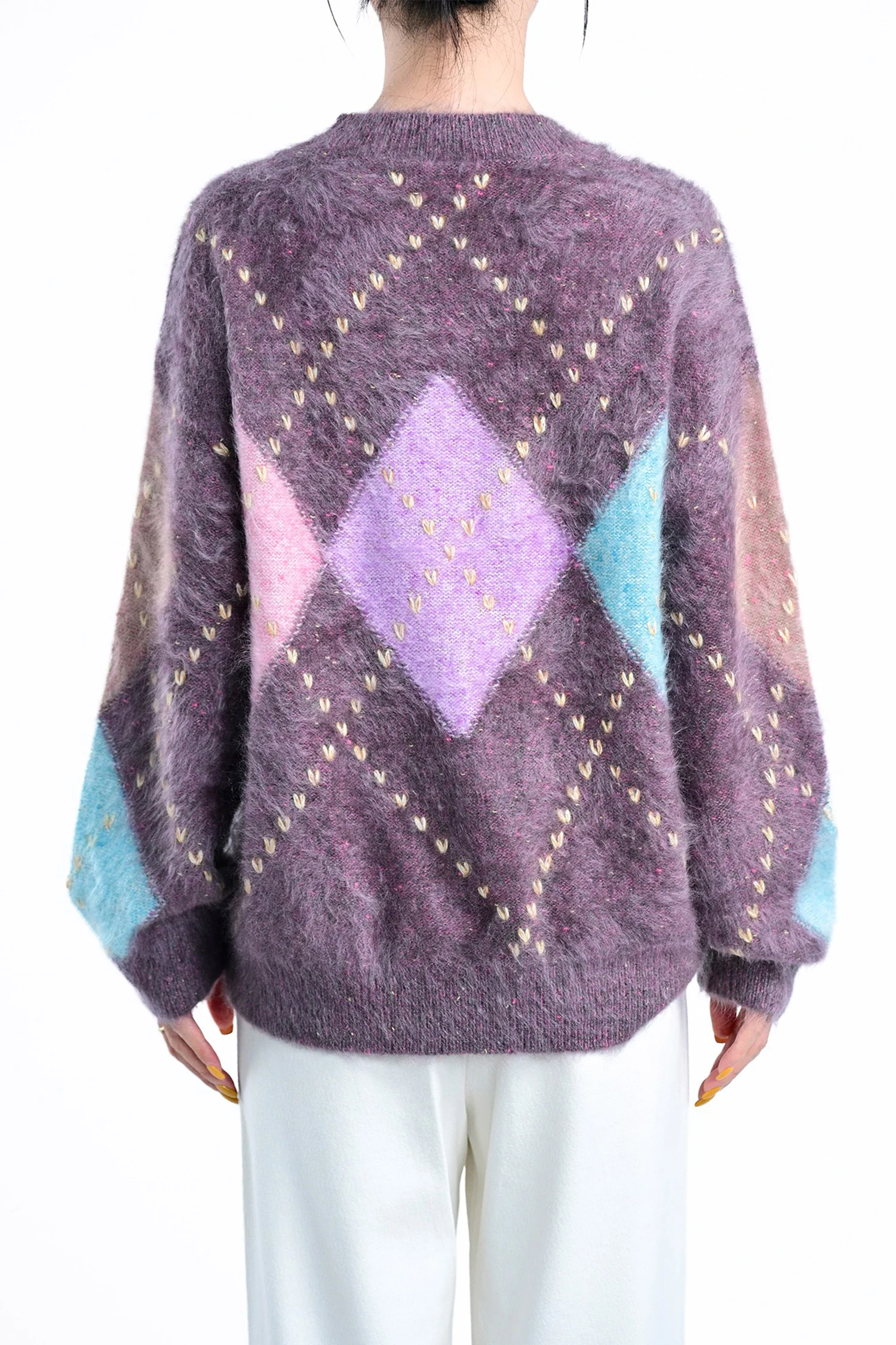 Chunky Brushed Cashmere Hand-Embroidered Argyle Sweater