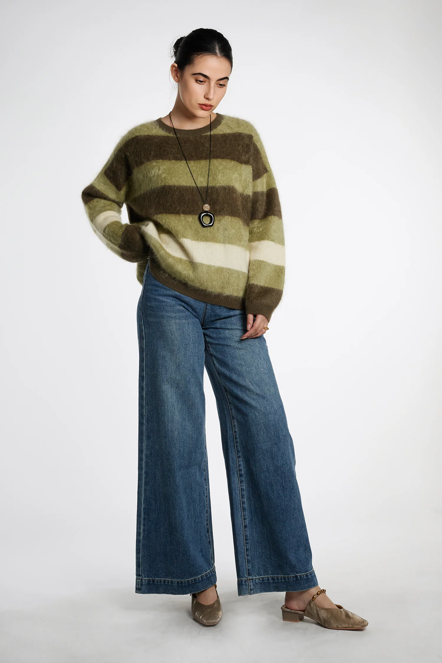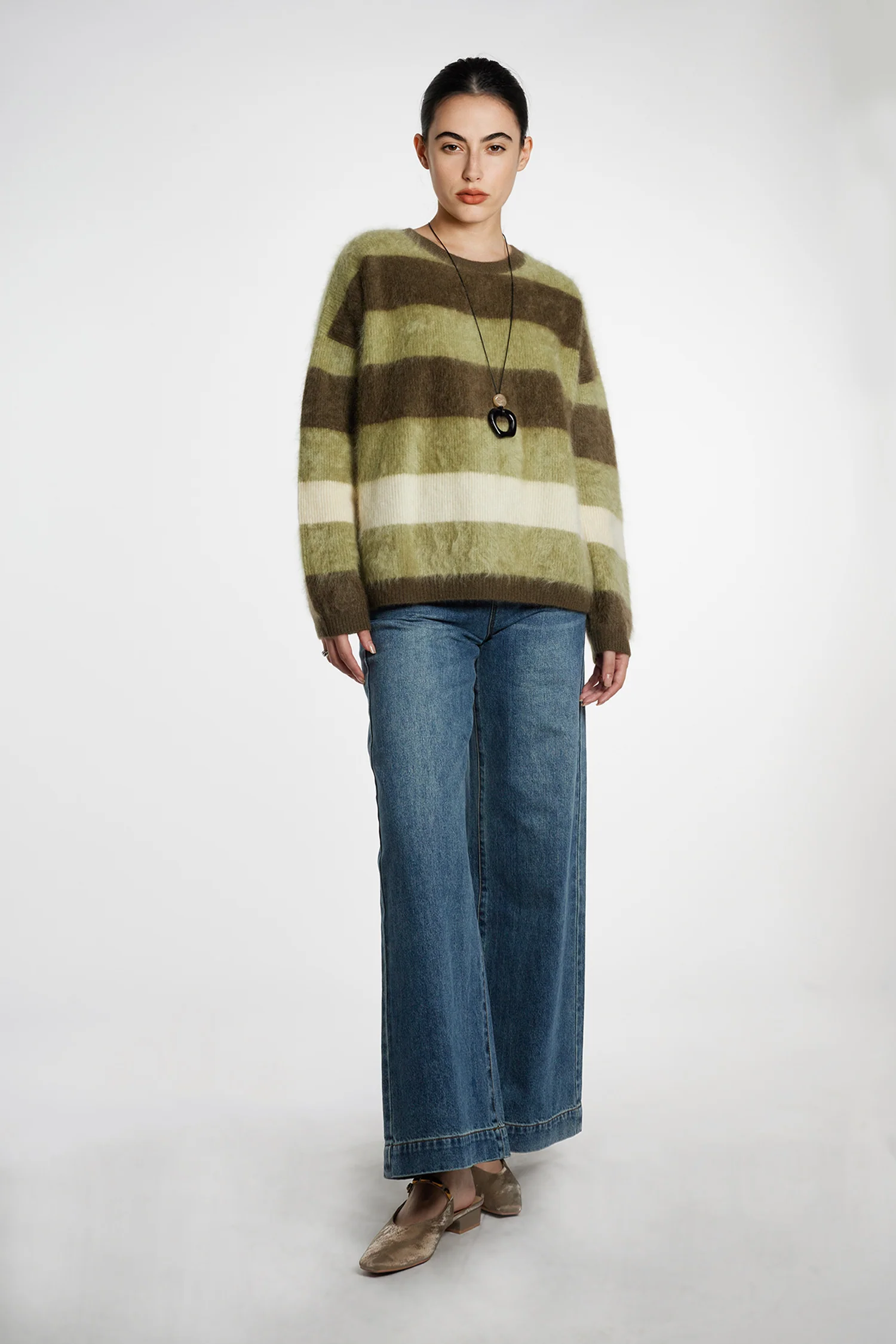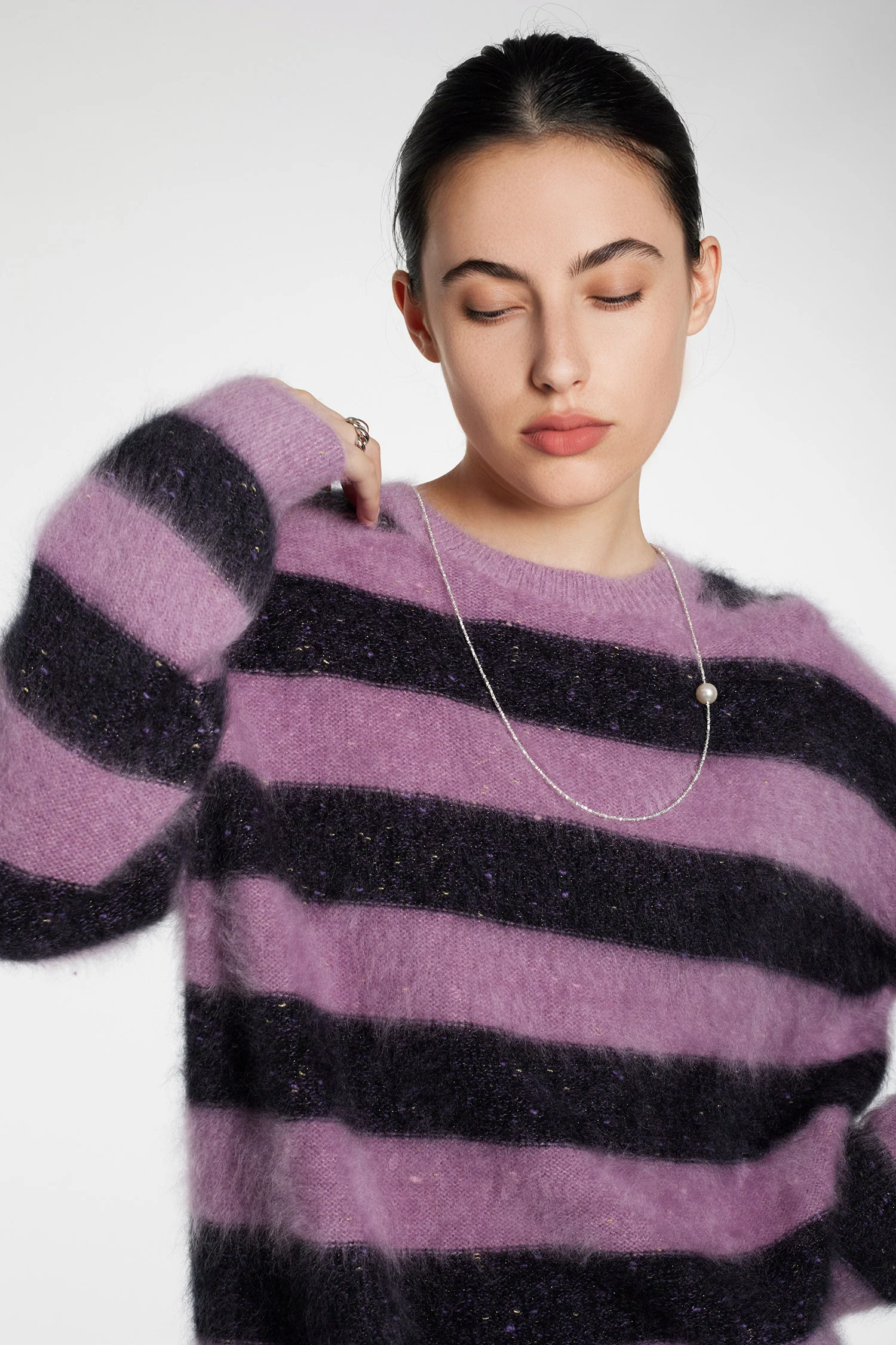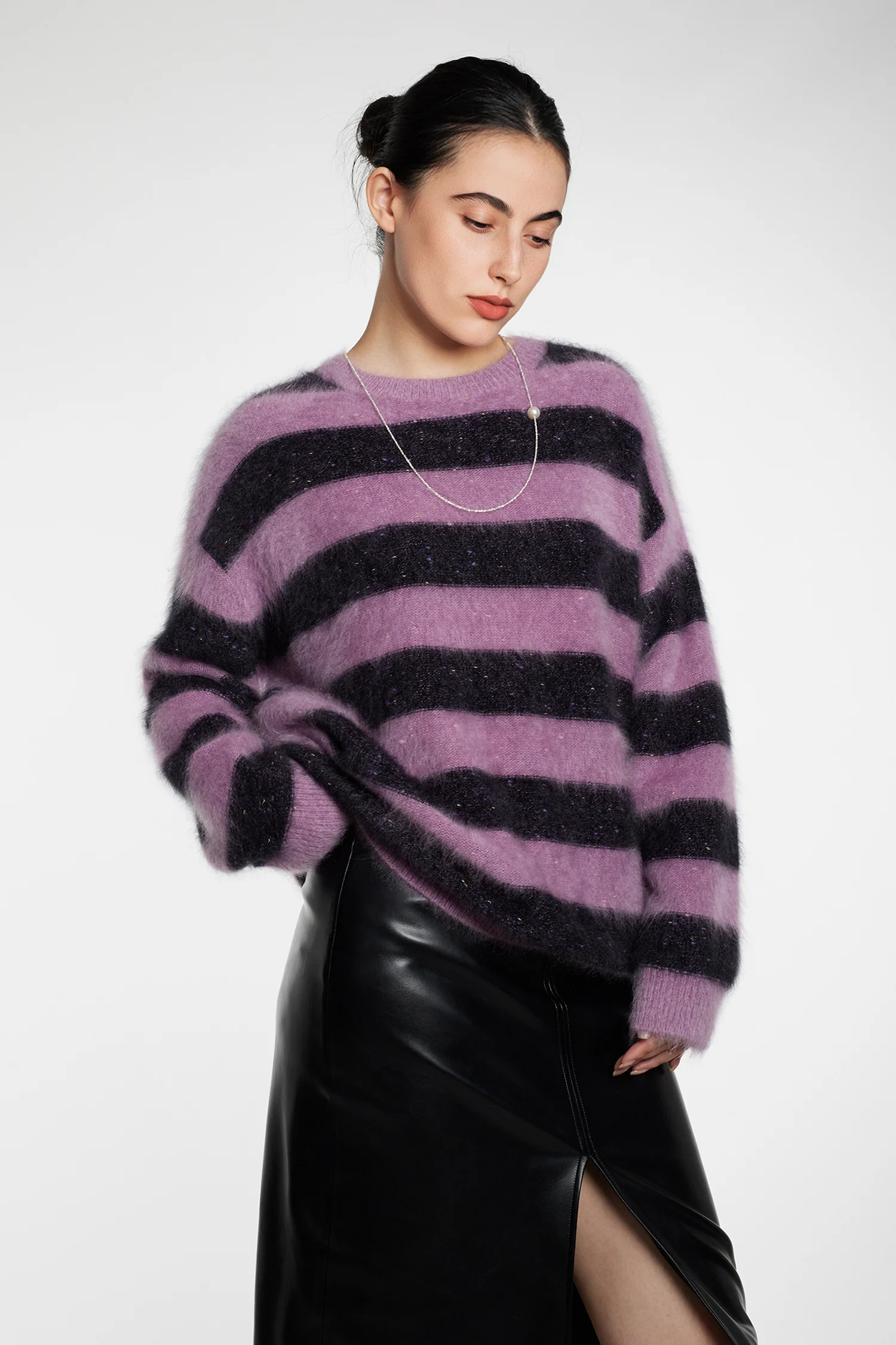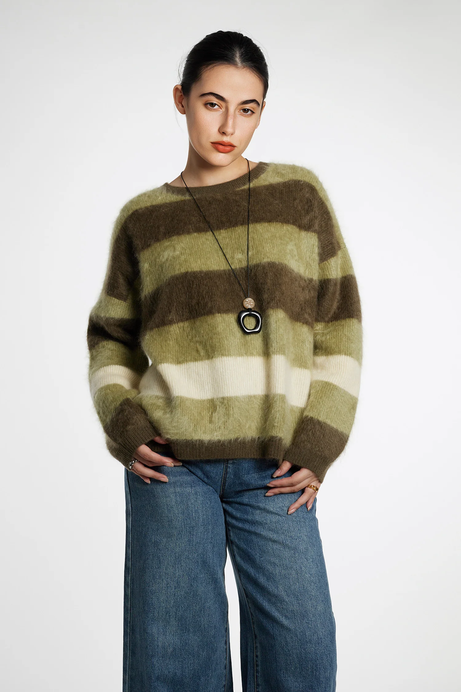 Fuzzy Brushed Cashmere Striped Pullover Sweater