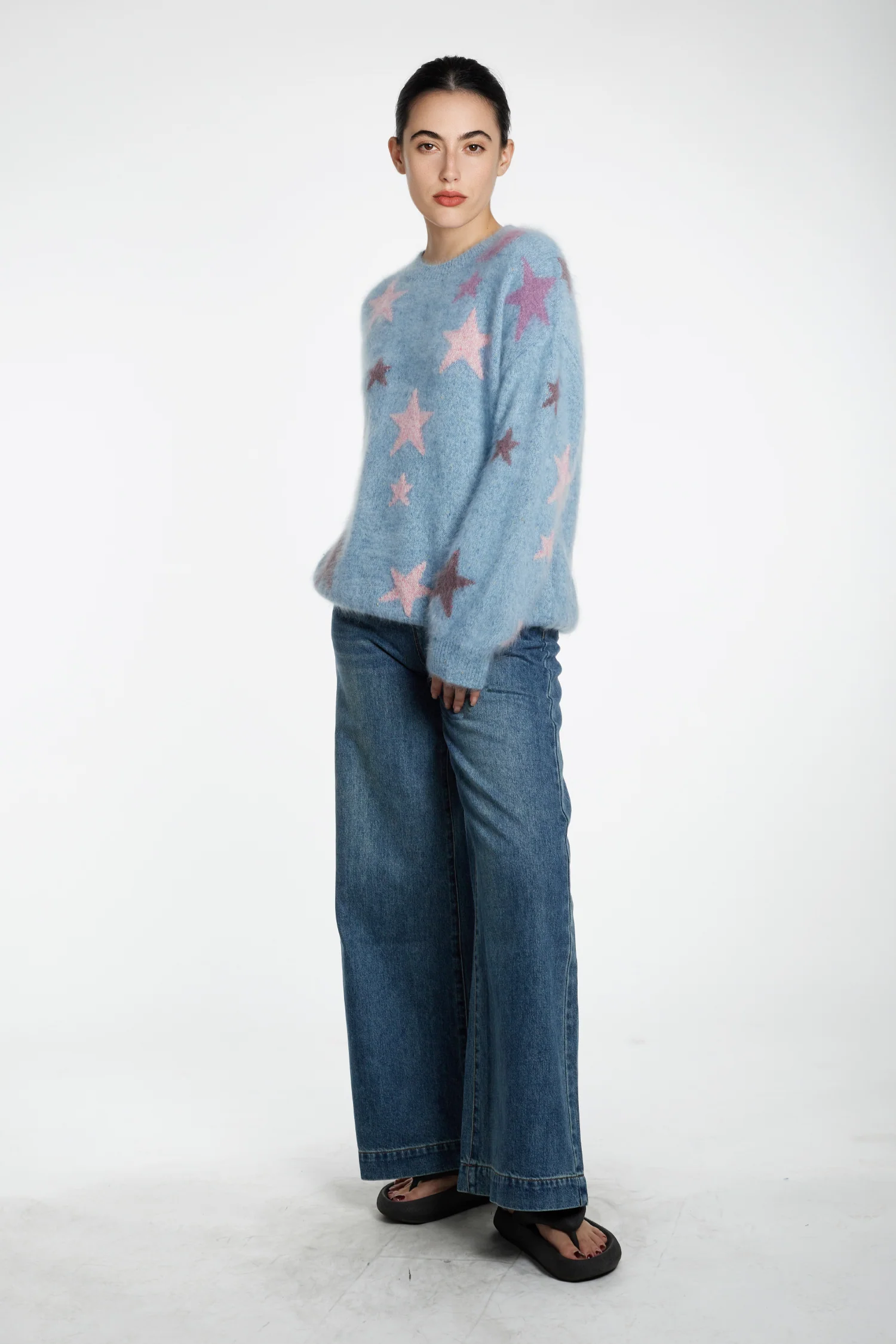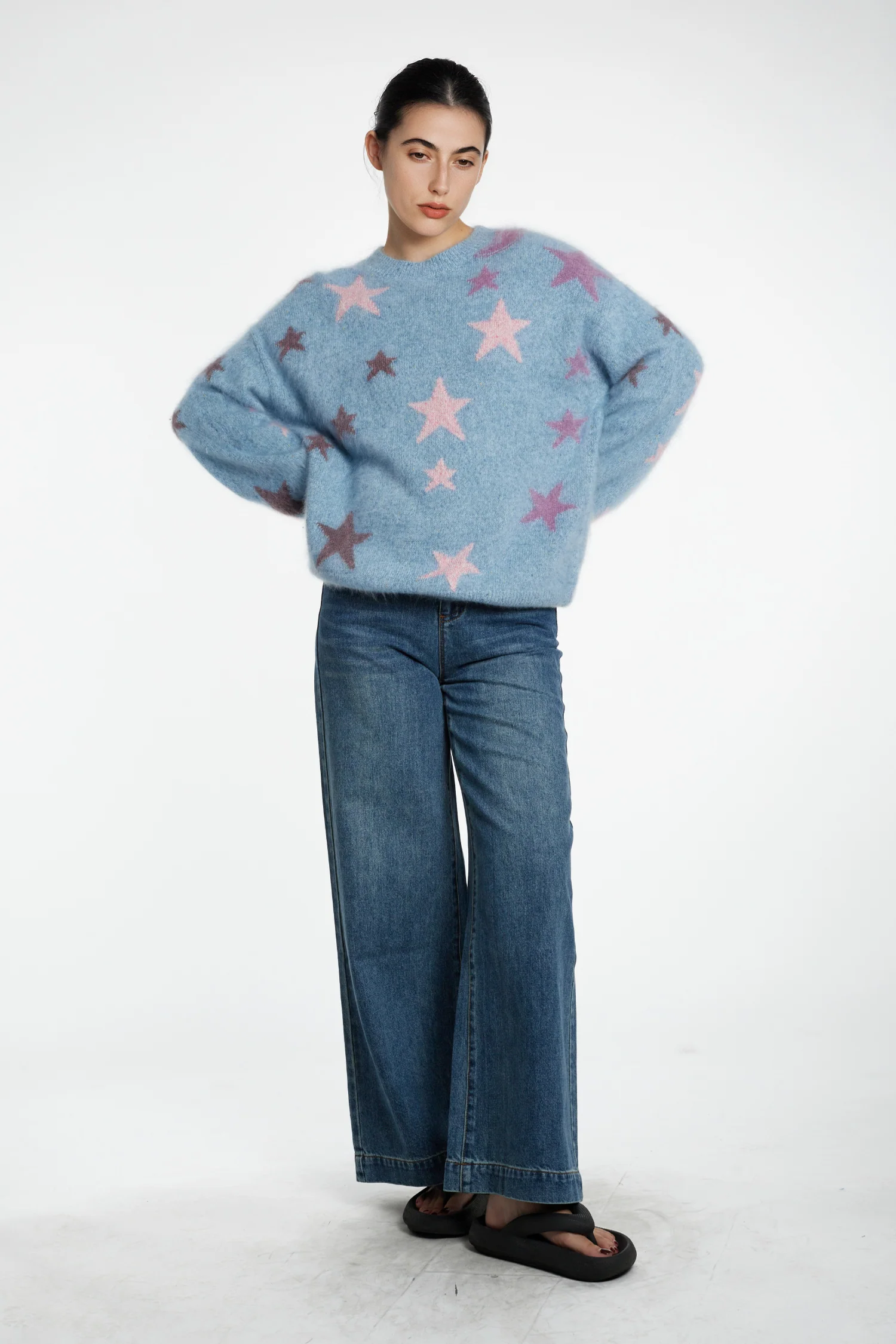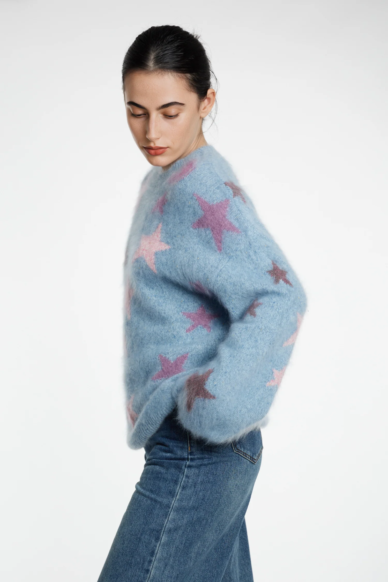 Chunky Brushed Cashmere Shimmer Star Crewneck Sweater