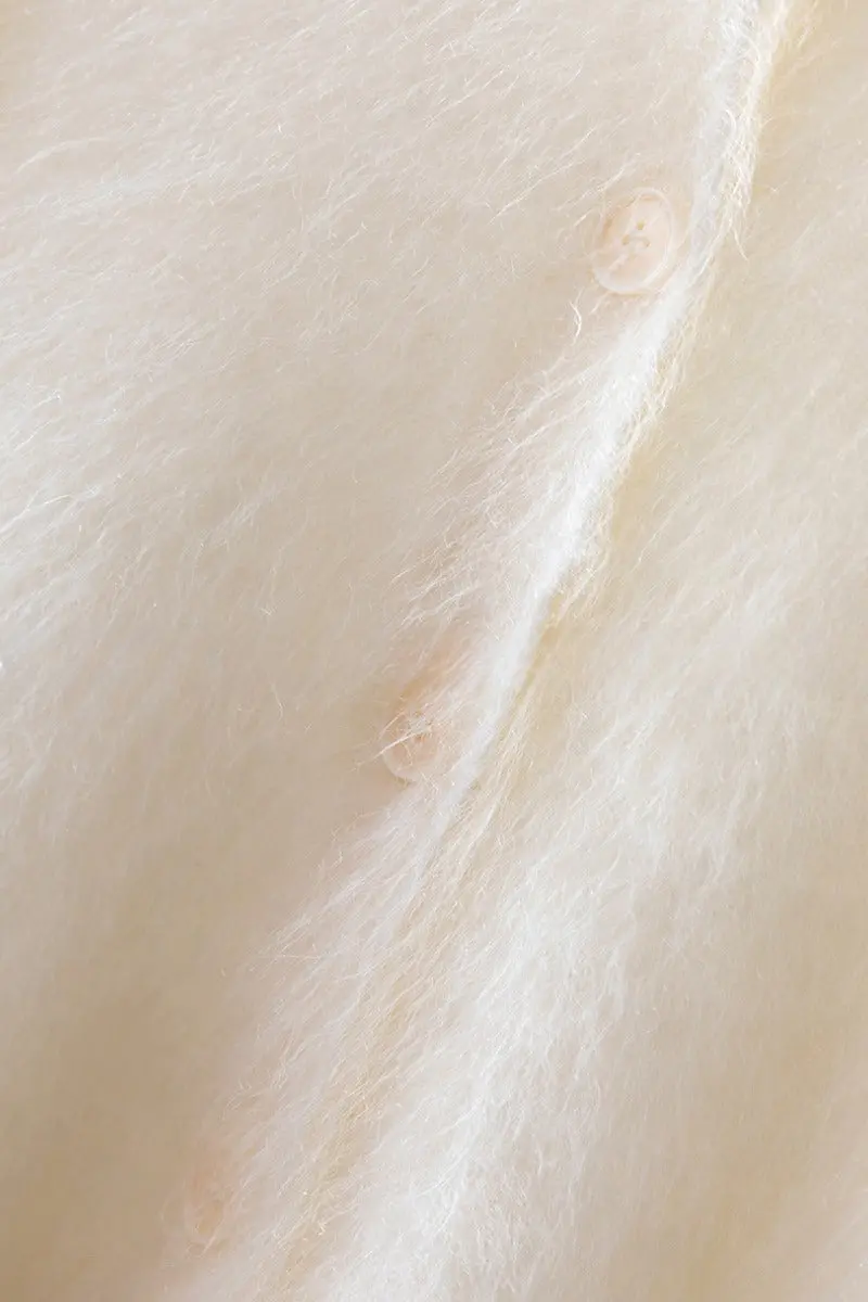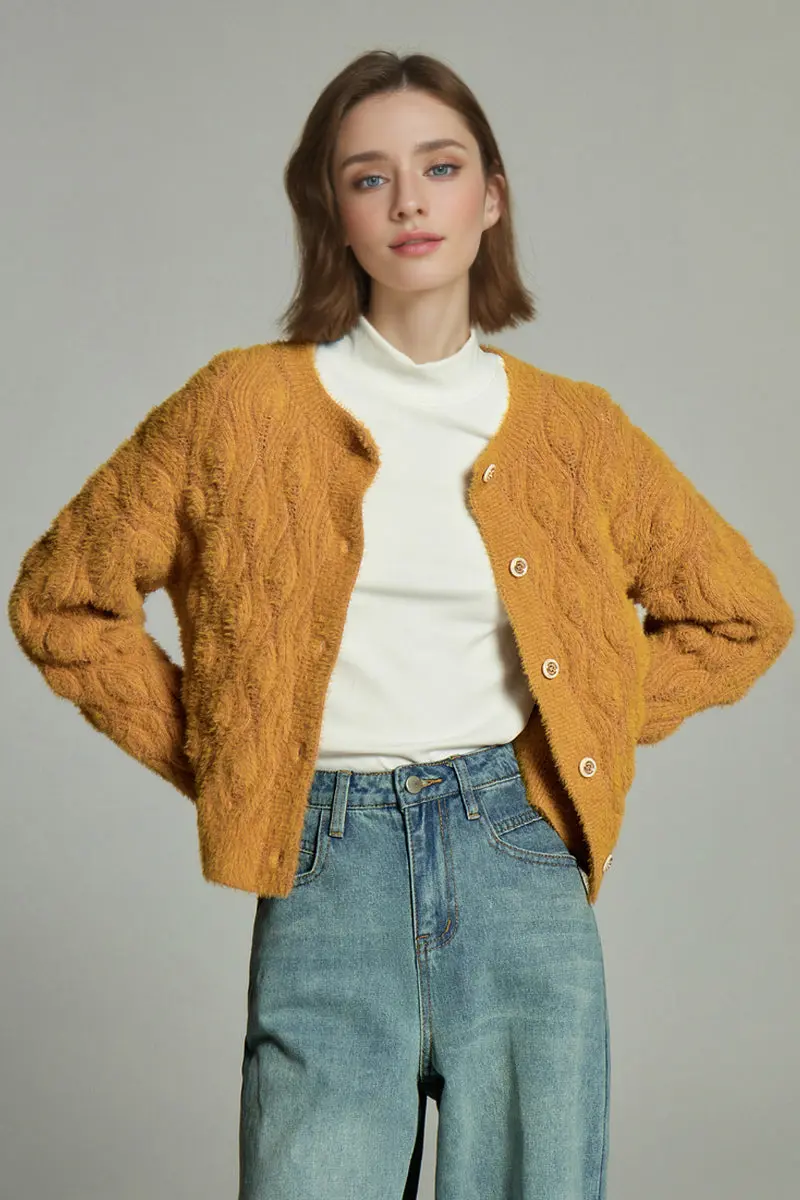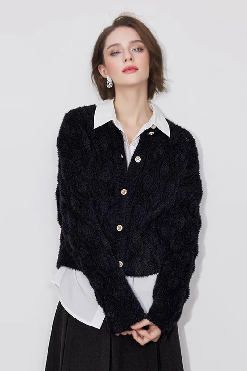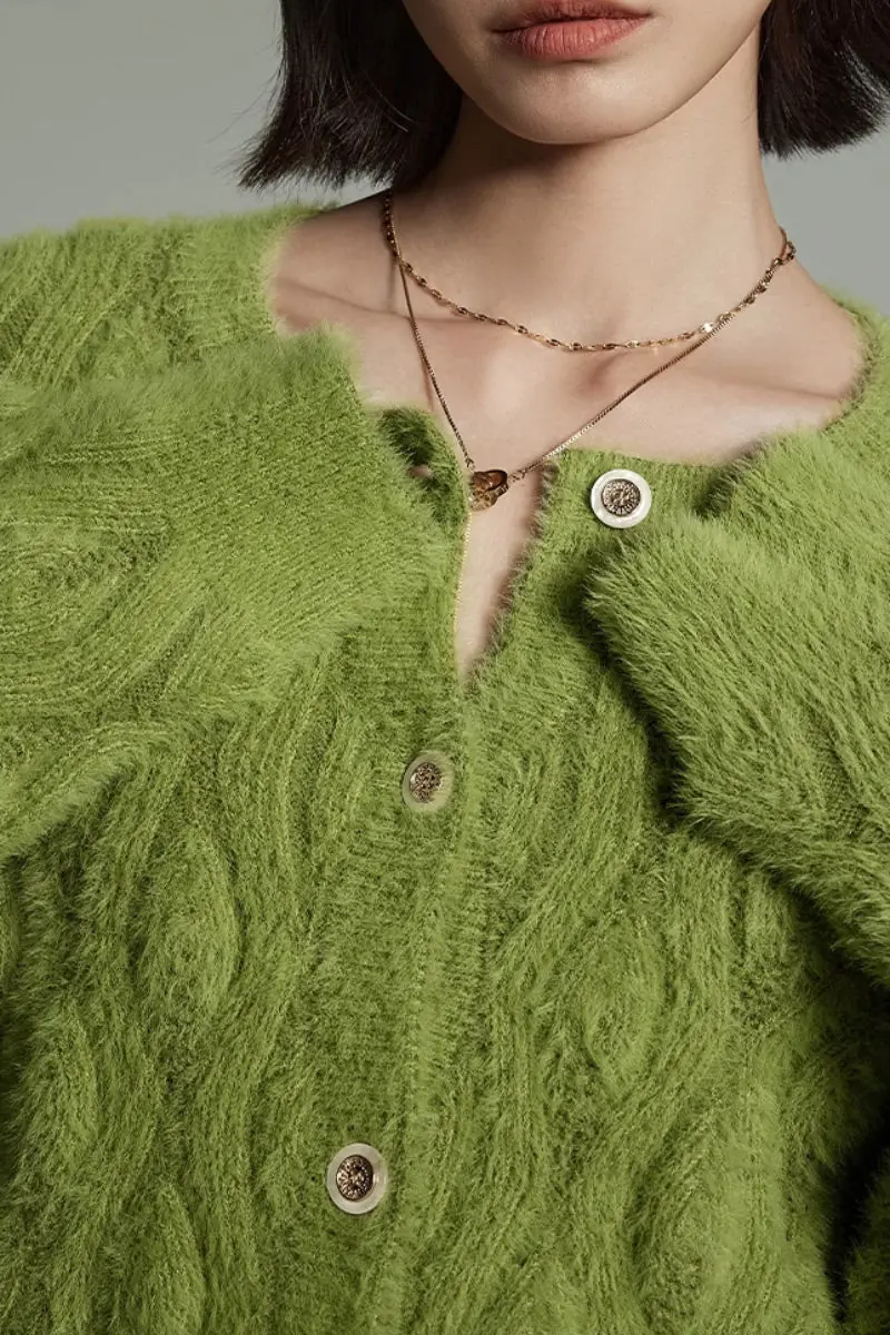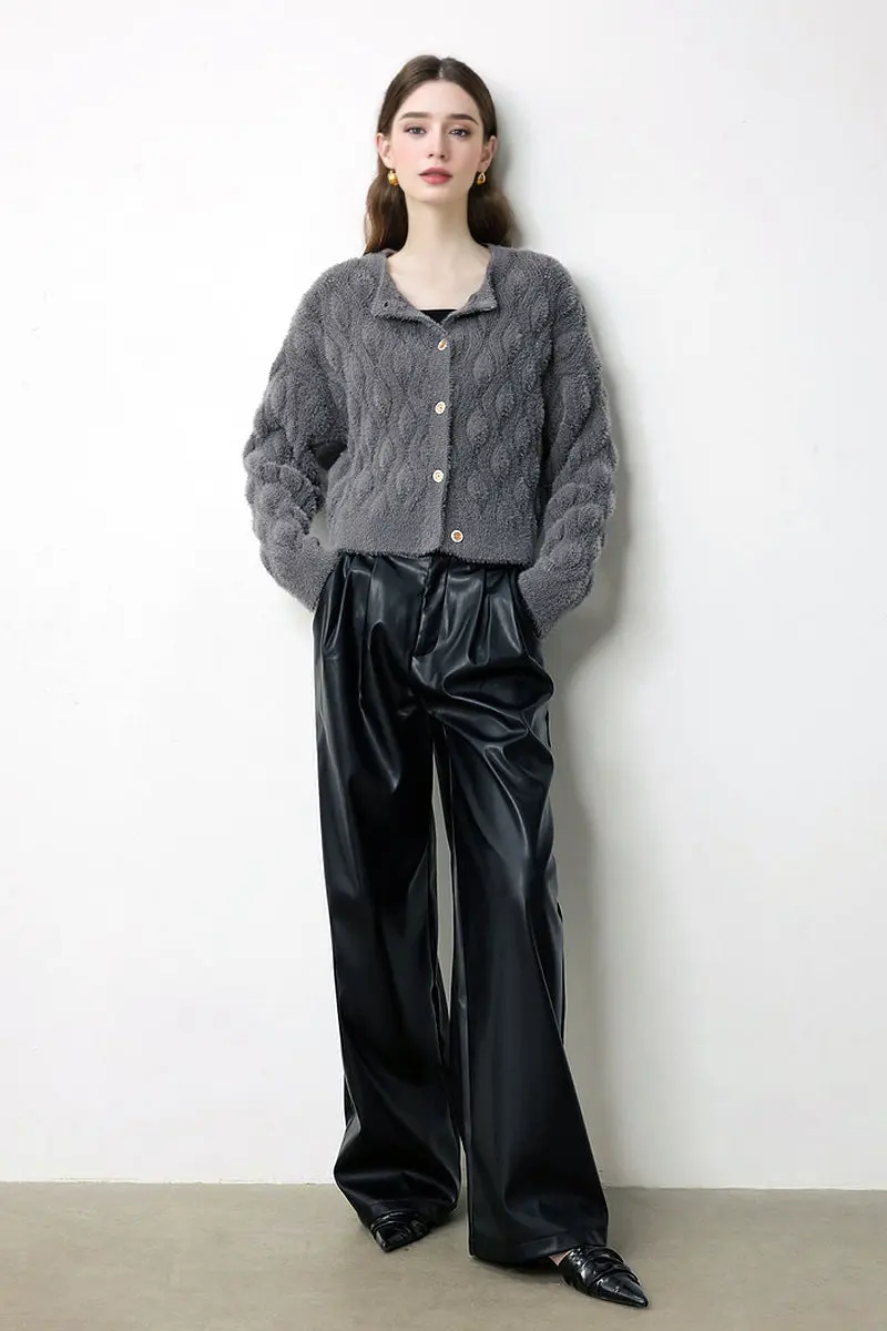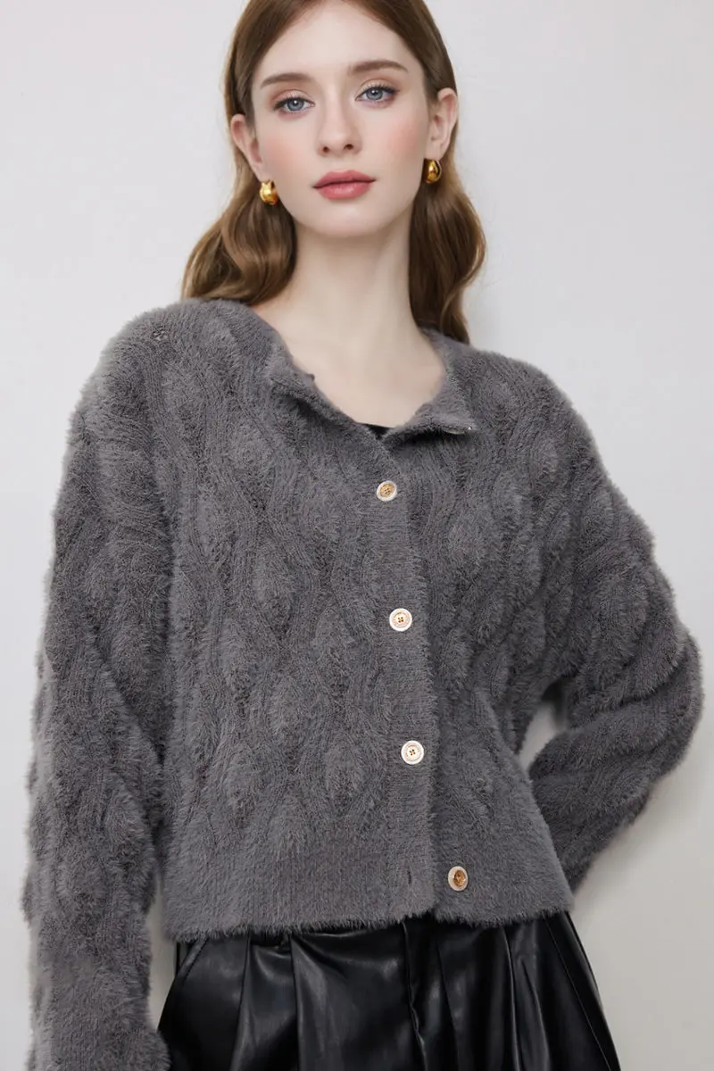 Faux Mink Fur Cropped Cable Knit Crewneck Cardigan