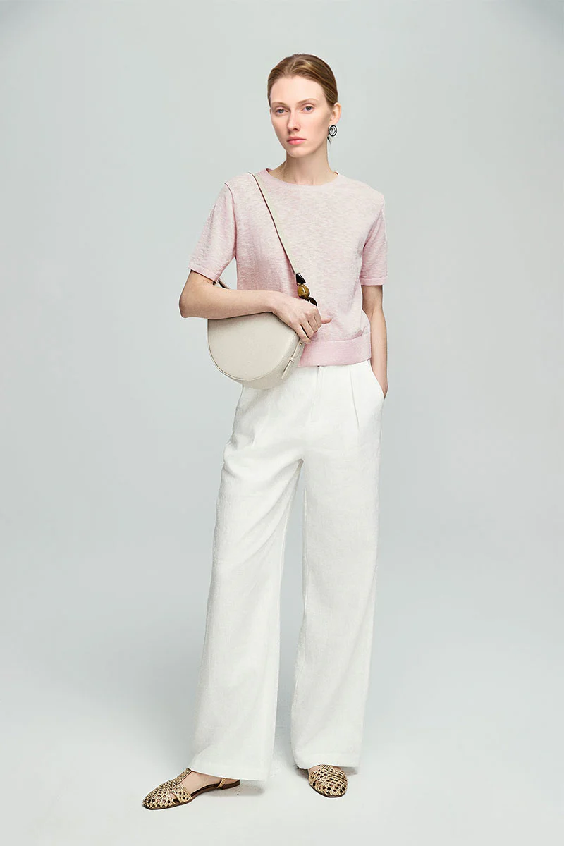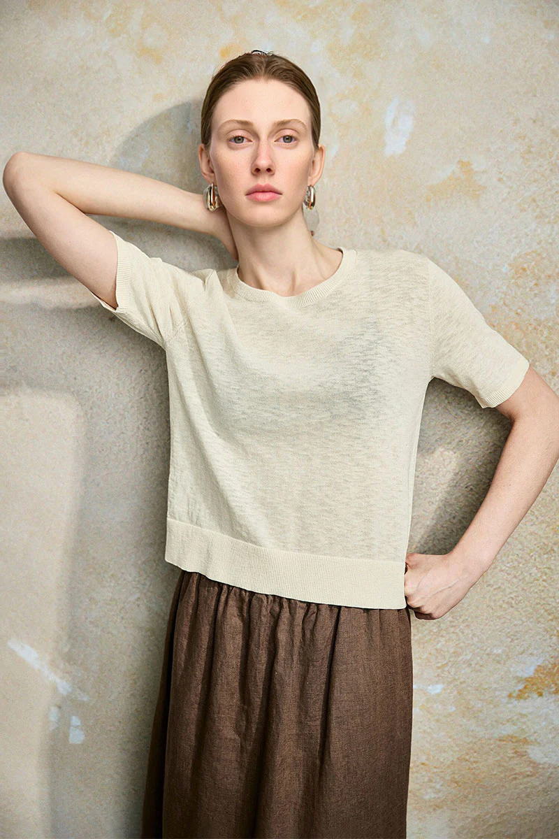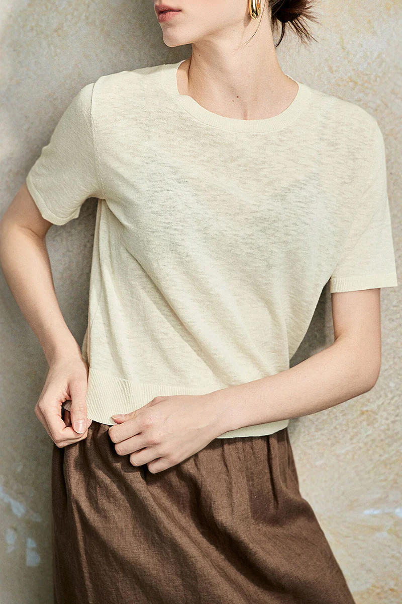 Relaxed Fit Cotton-Linen Short-Sleeve Crewneck T-Shirt with Ribbed Trims