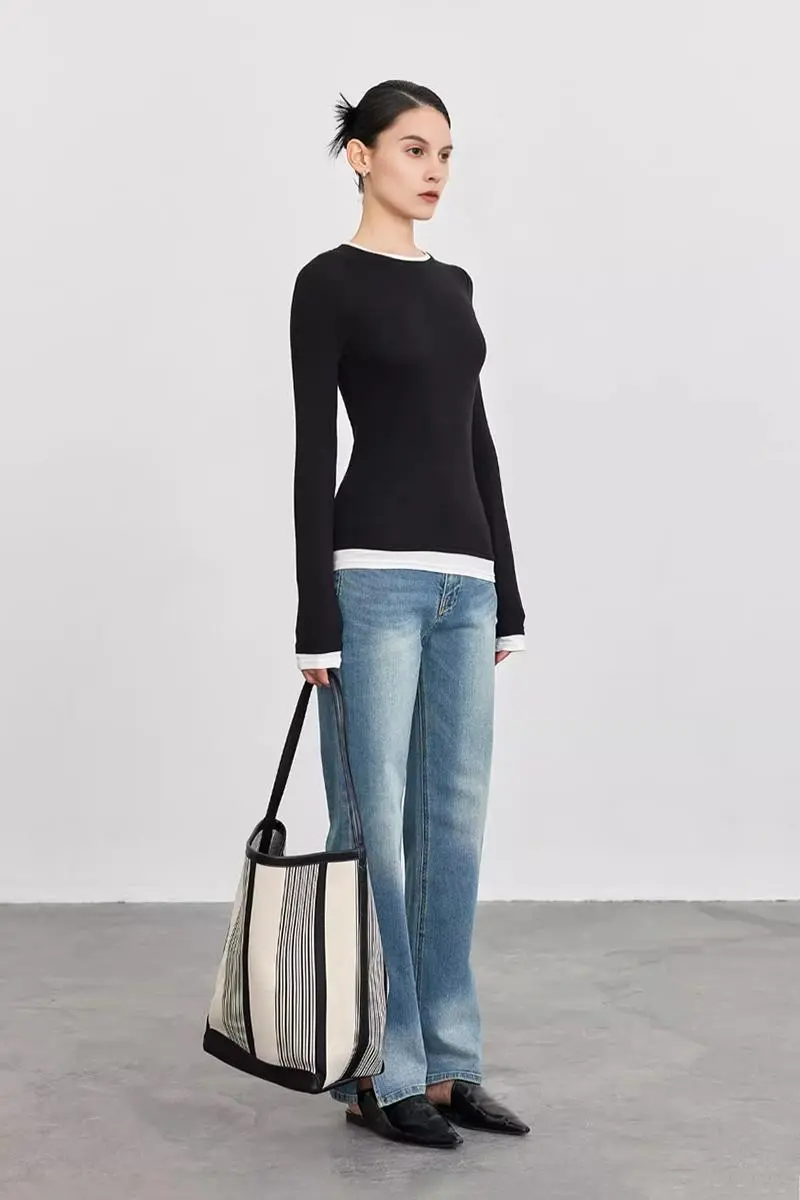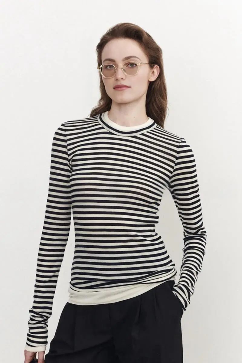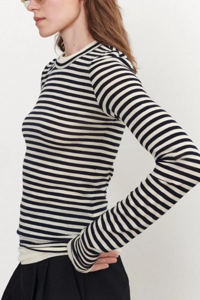 Loose Sheer Cotton-Linen Long-Sleeve Crew-Neck Striped T-Shirt