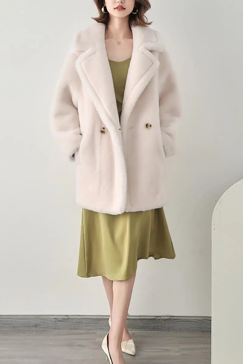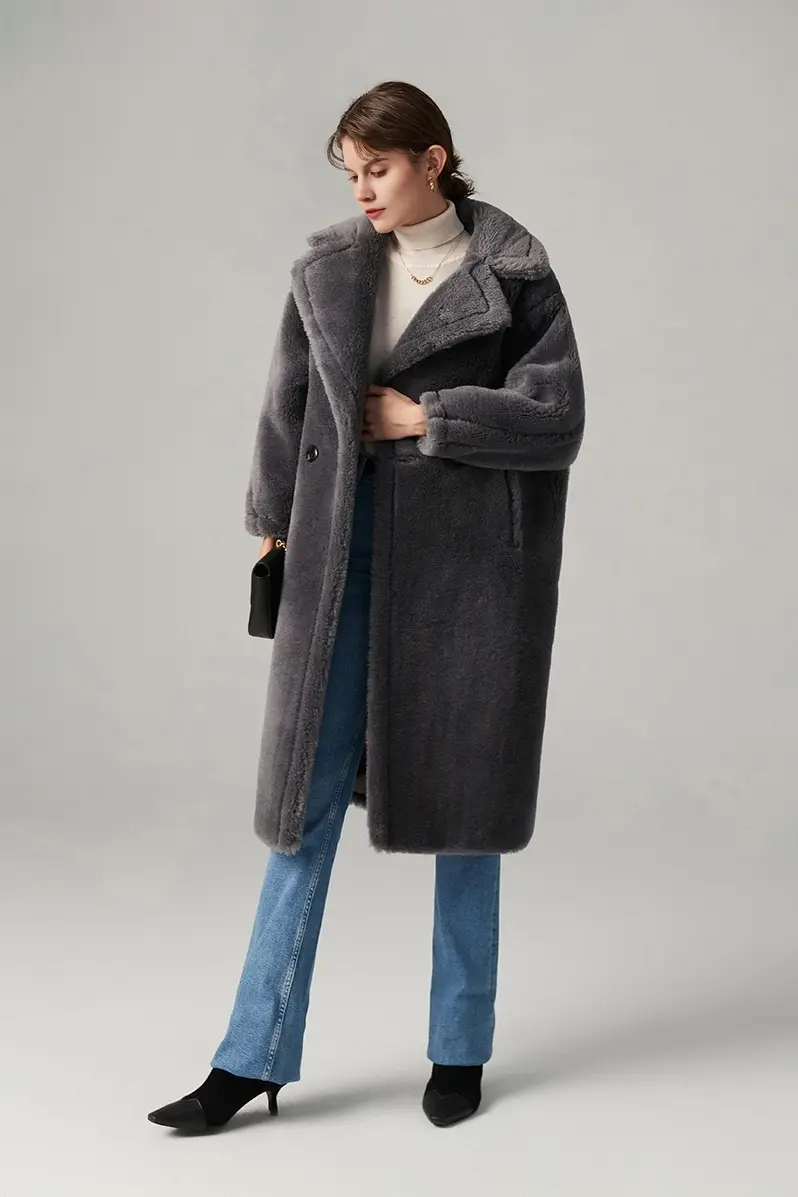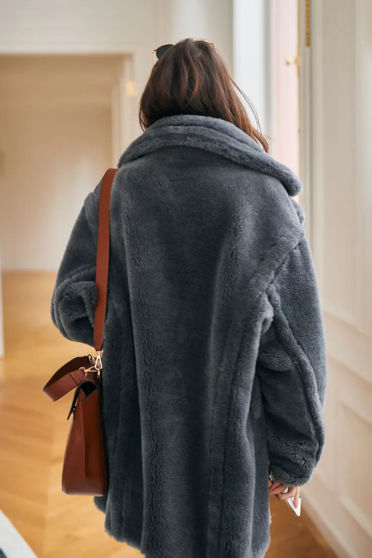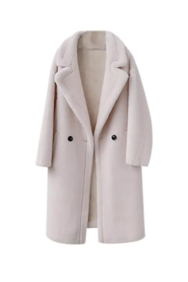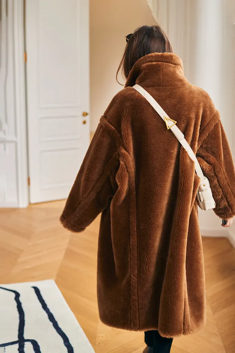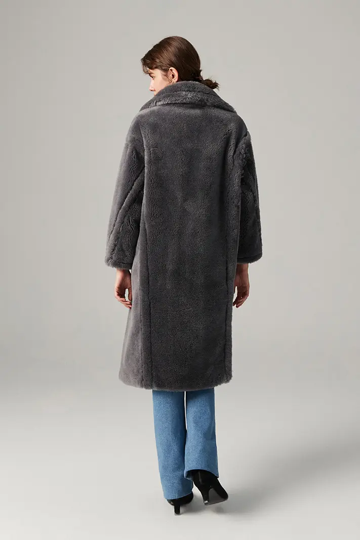Mid-length Teddy-style Shearling Coat With Lapel Collar