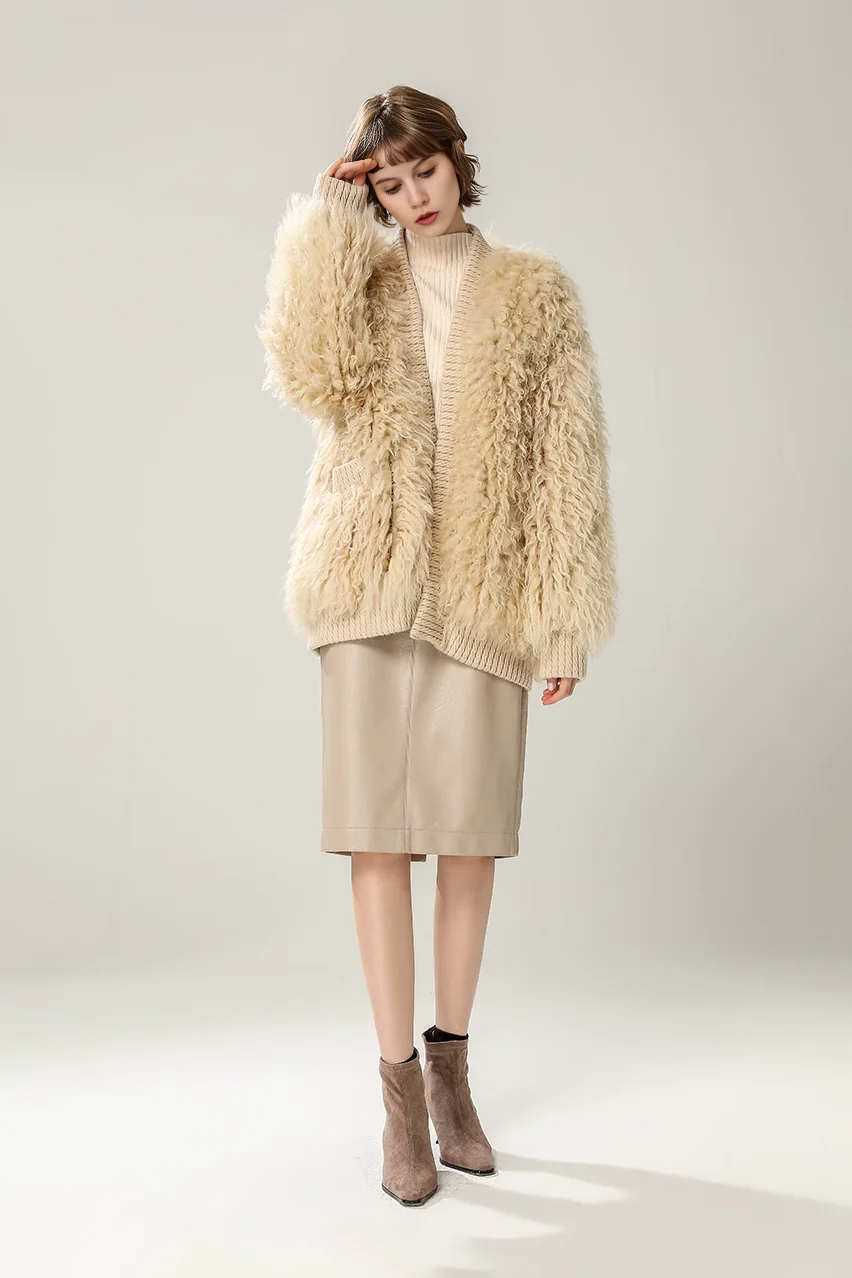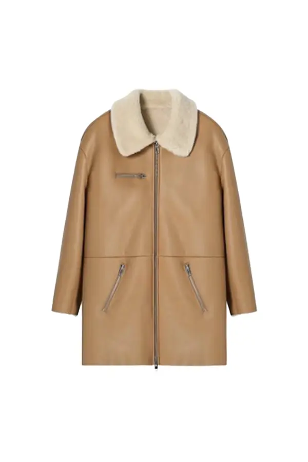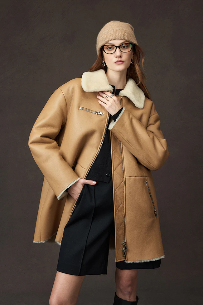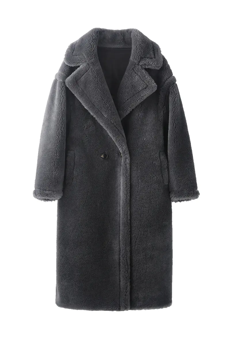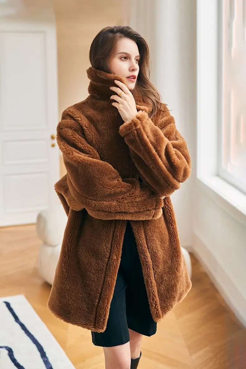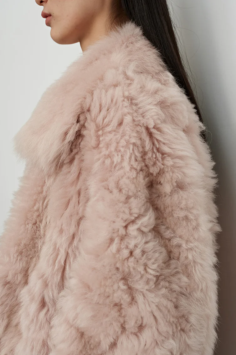 Mid-length Teddy-style Shearling Coat With Lapel Collar