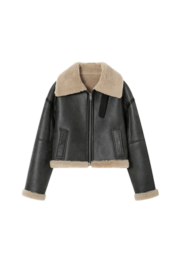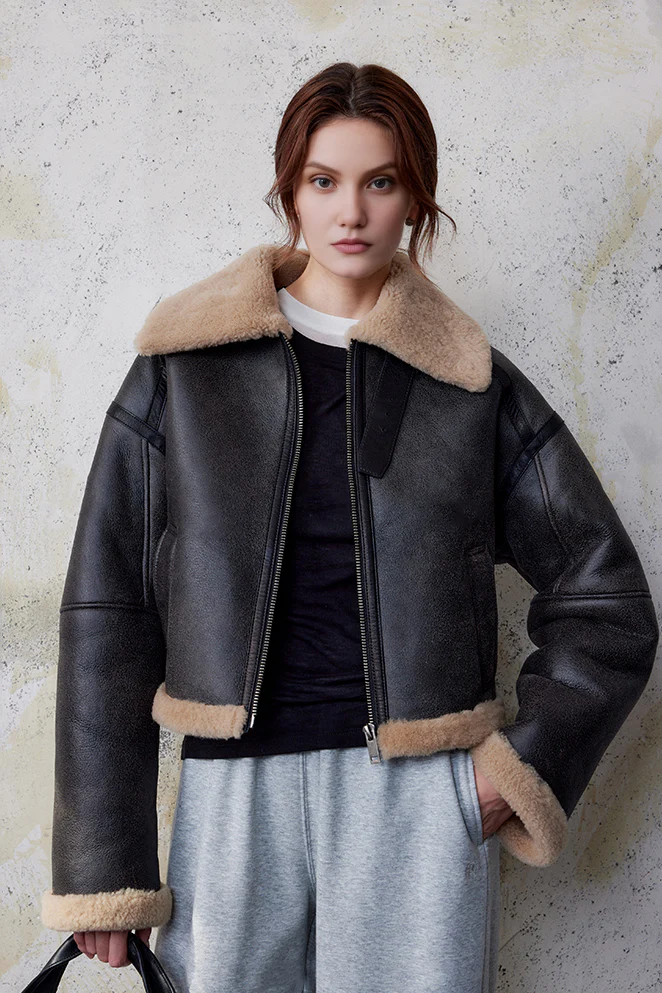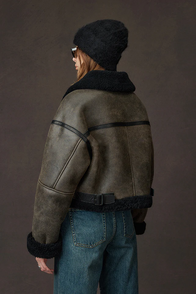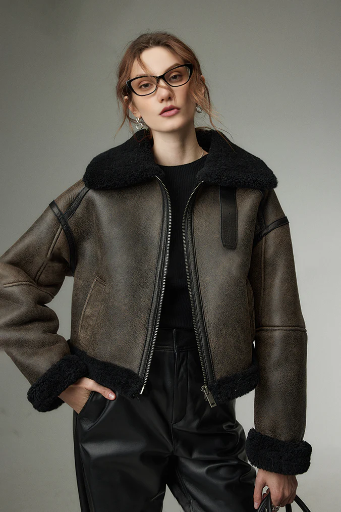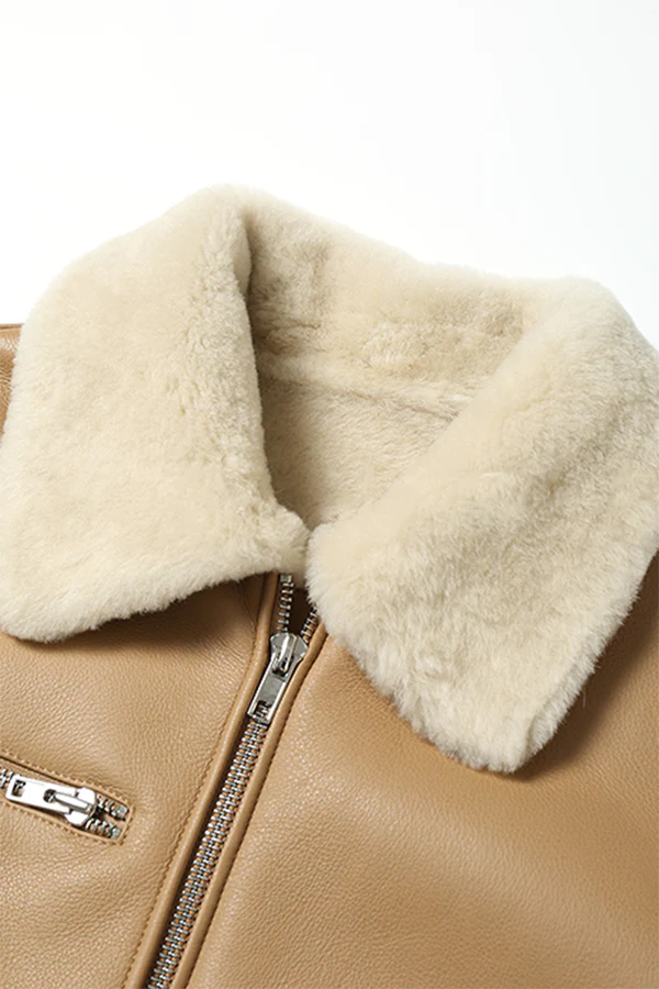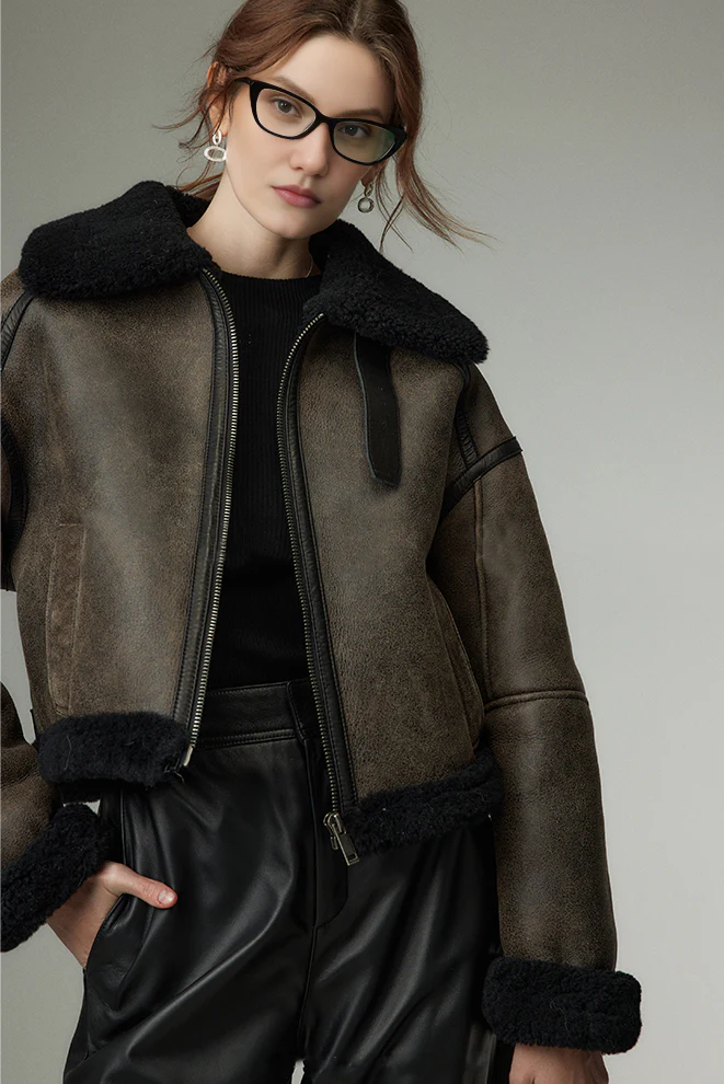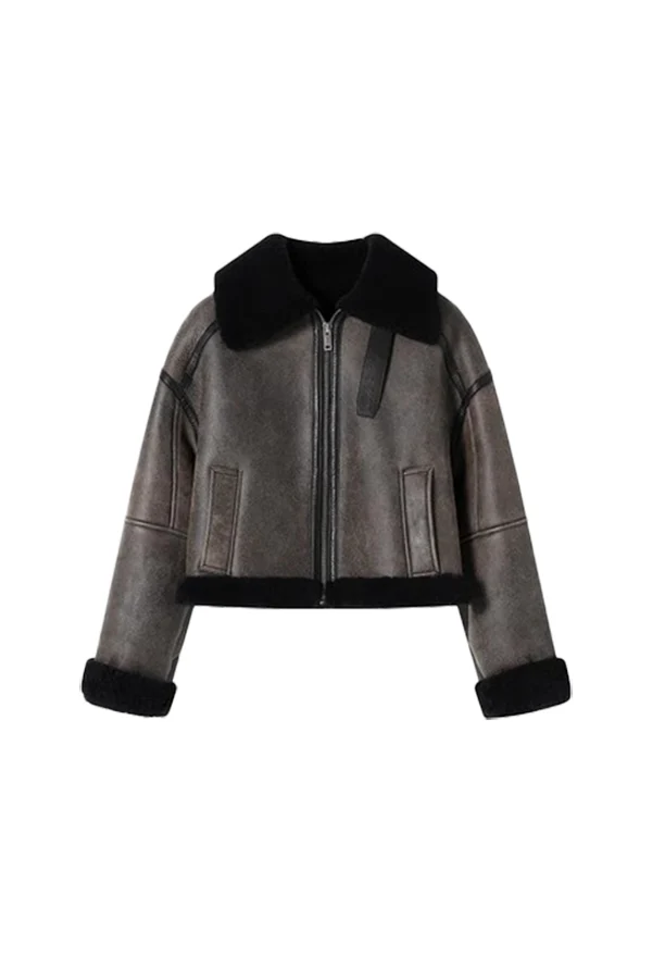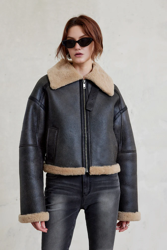 Distressed Shearling Collar Cropped Sheepskin Biker Jacket