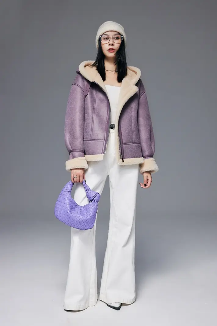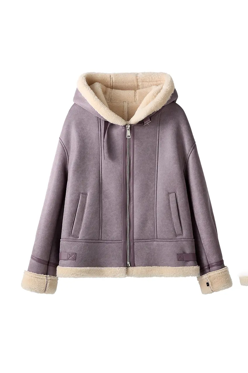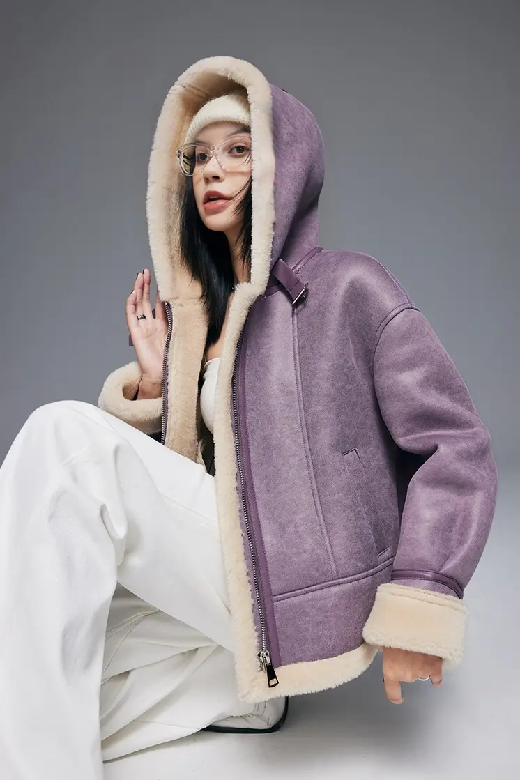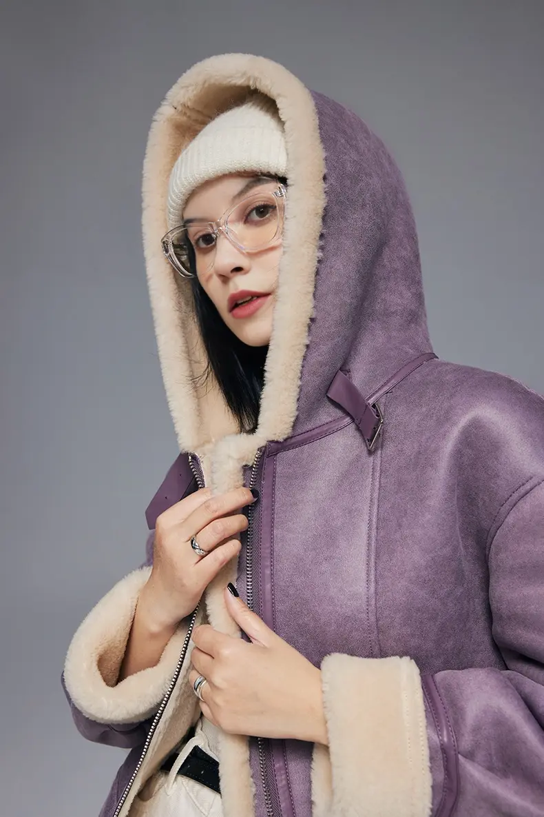 Purple Hooded Shearling Faux-leather Bomber Jacket