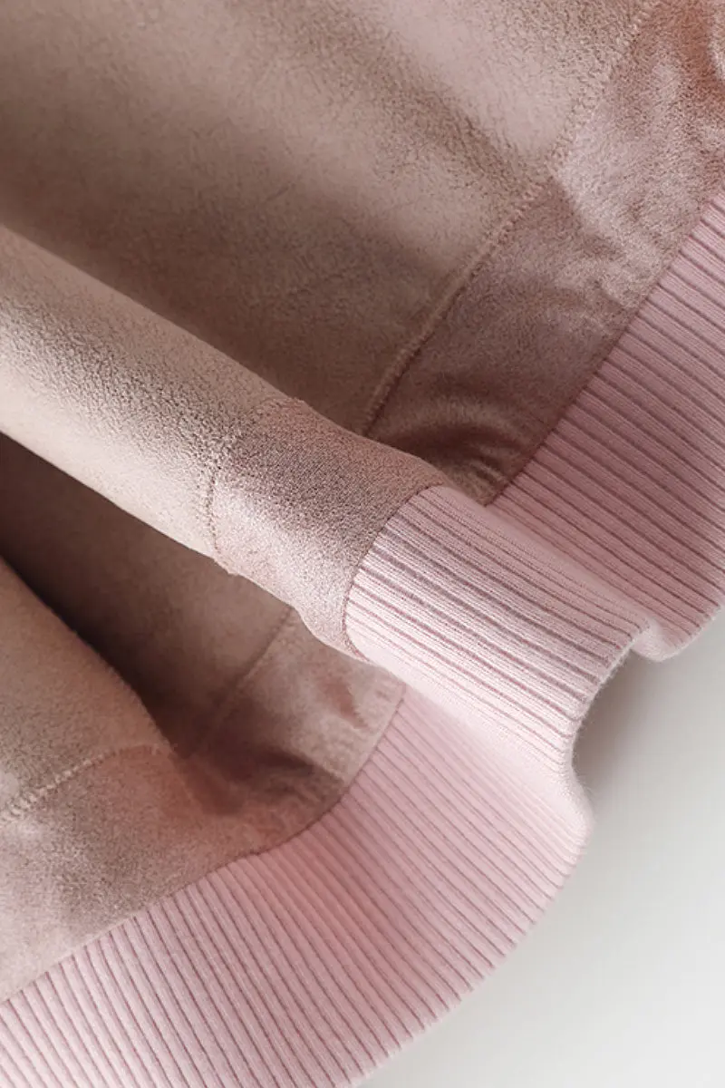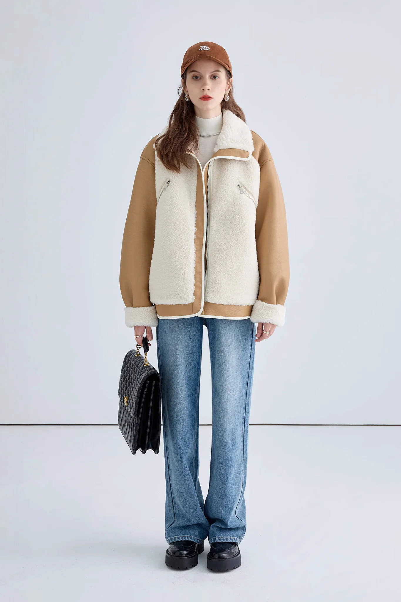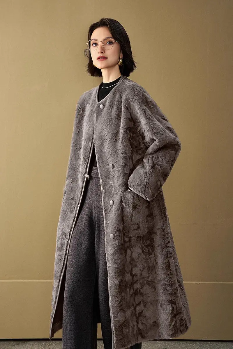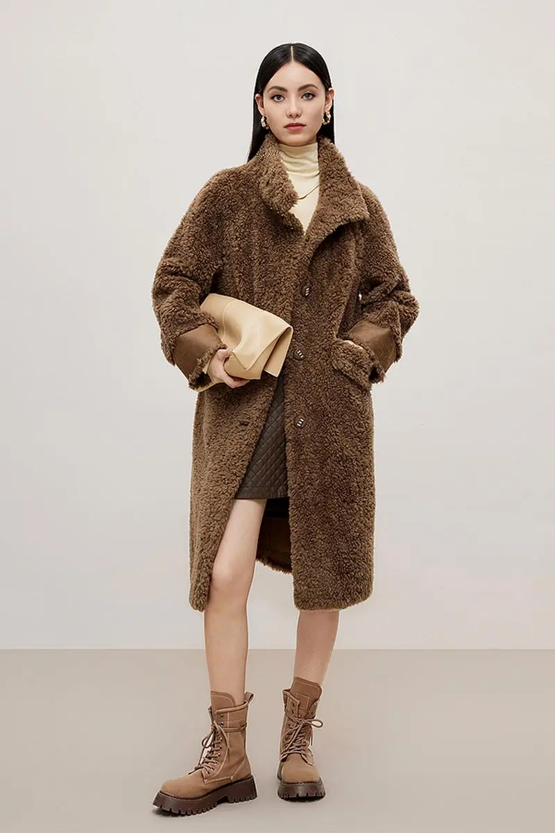 Genuine Shearling & Faux Suede Long Coat with Stand Collar