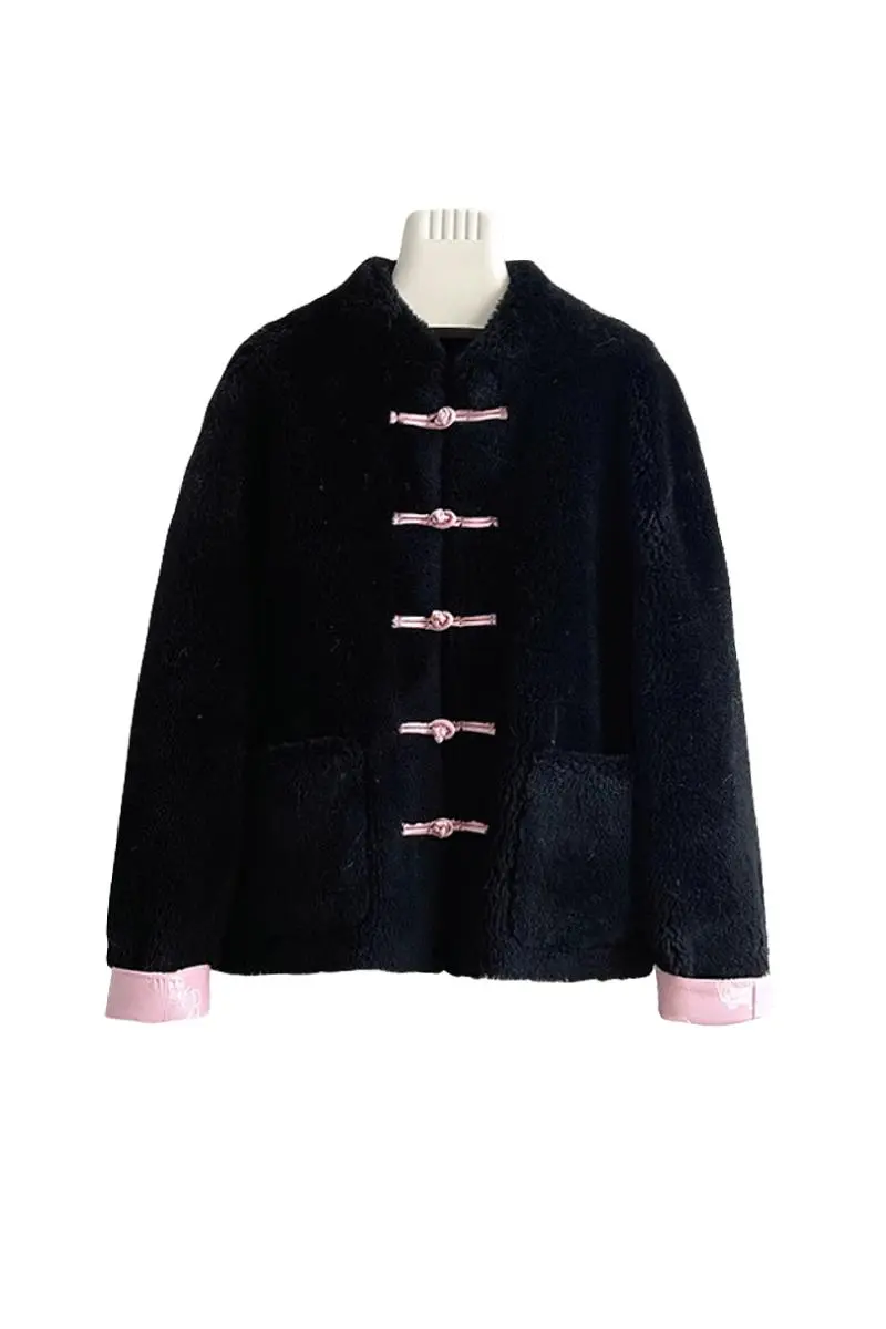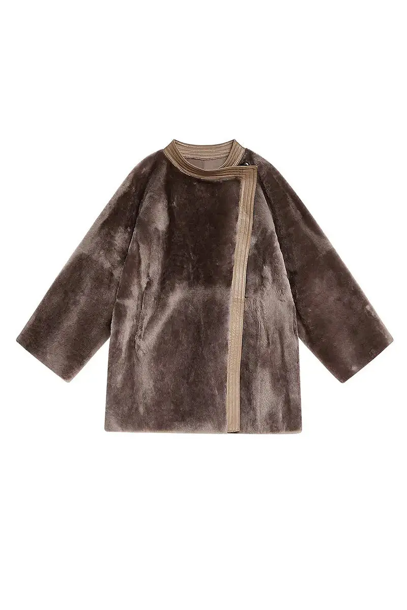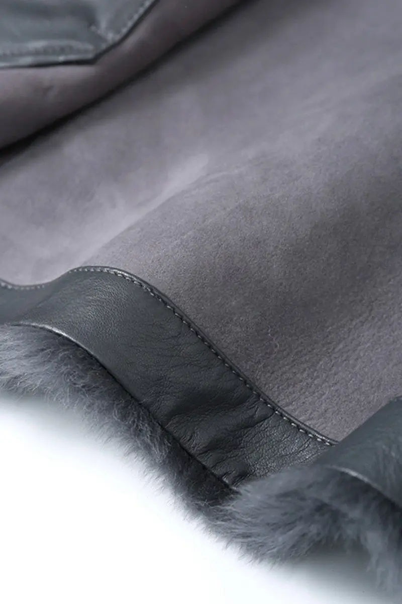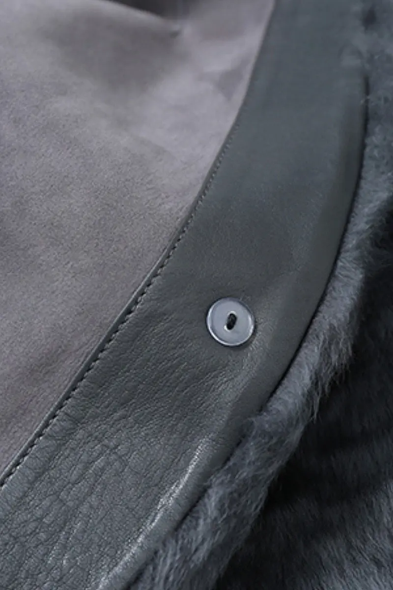 Mandarin Inspired Genuine Shearling & Faux Suede Jacket