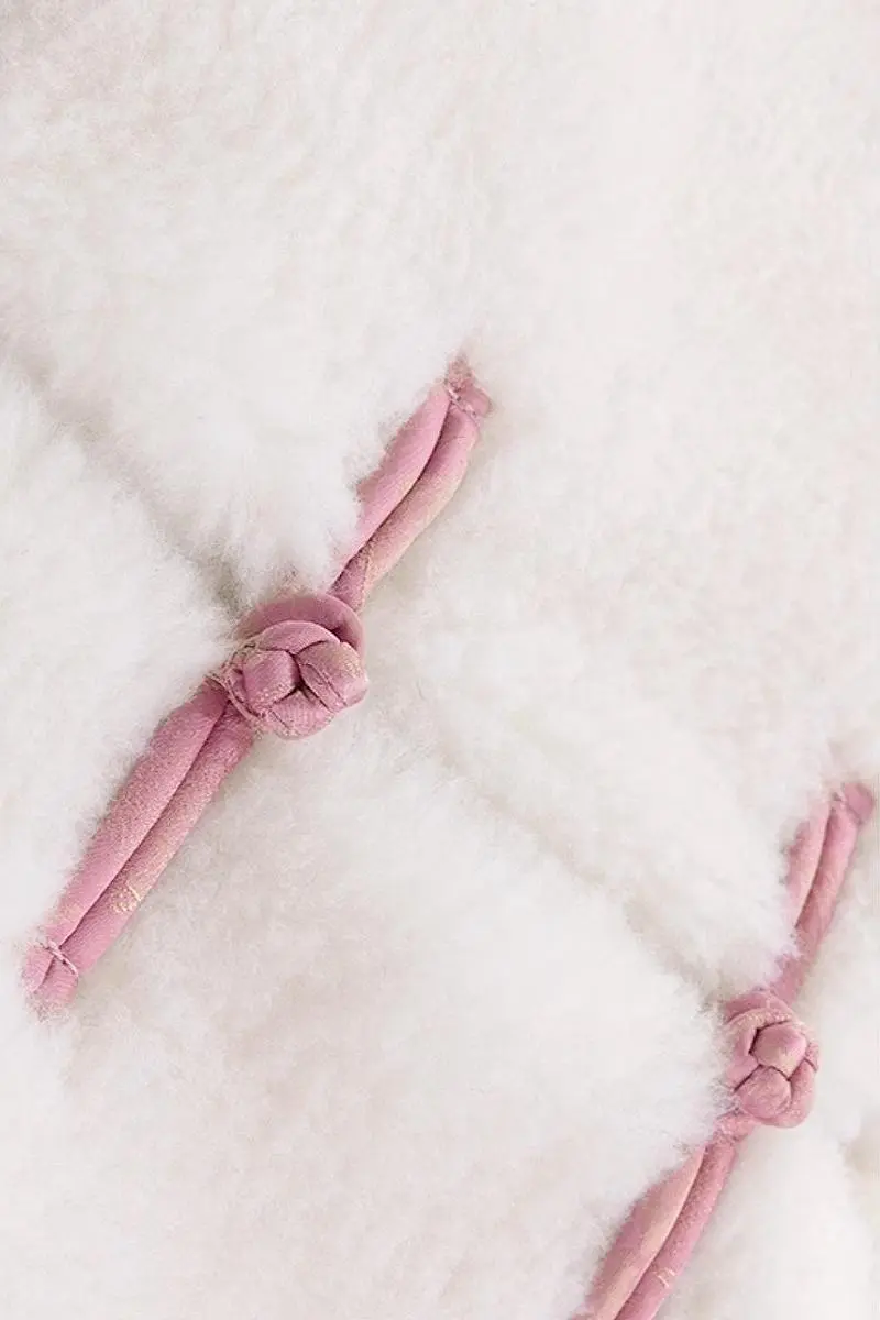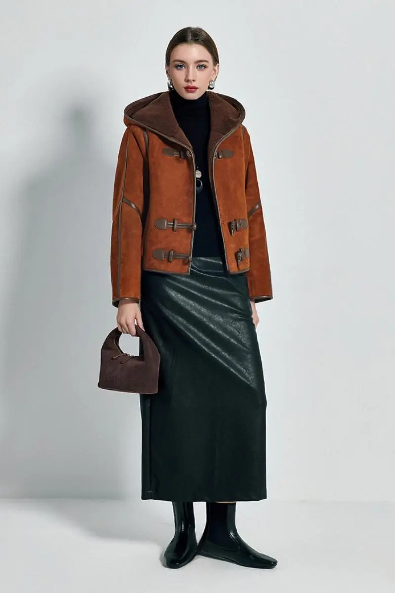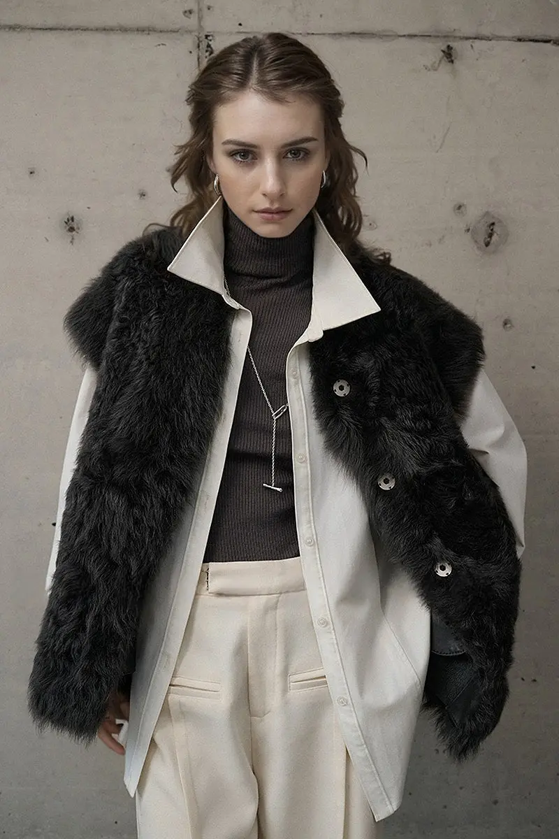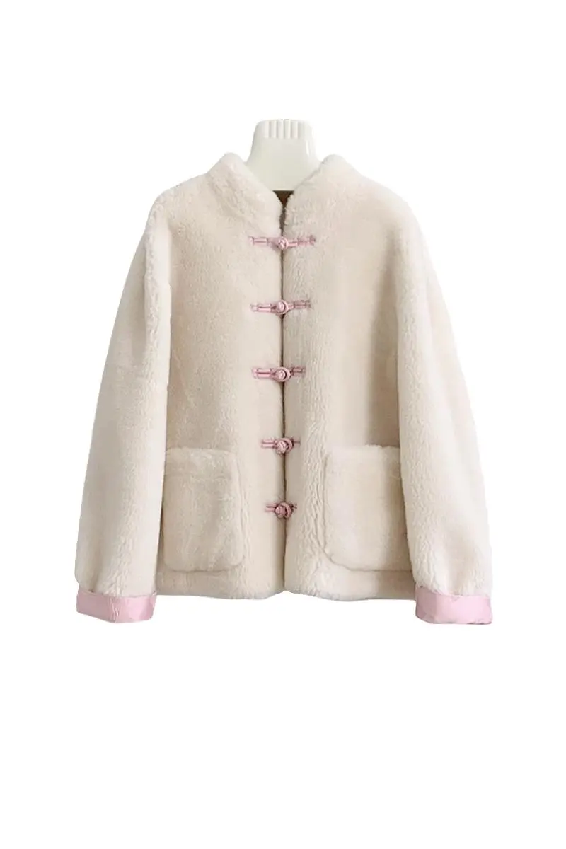 Mandarin Inspired Genuine Shearling & Faux Suede Jacket