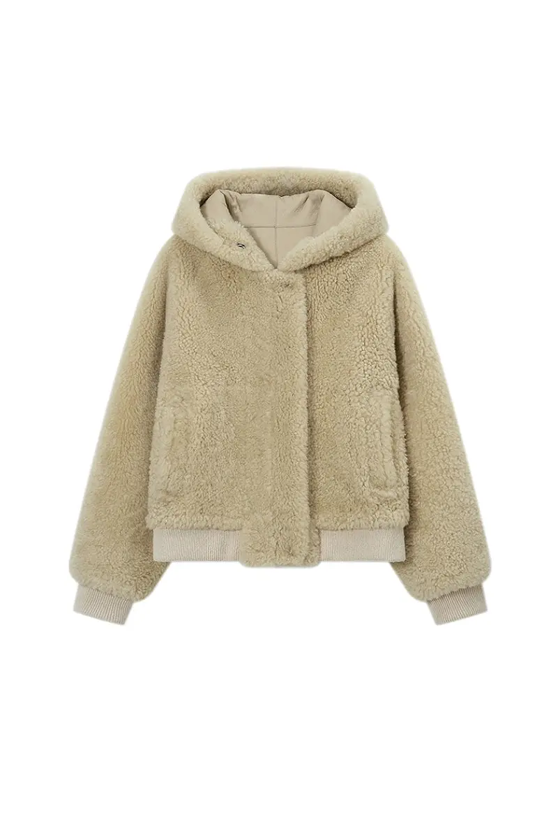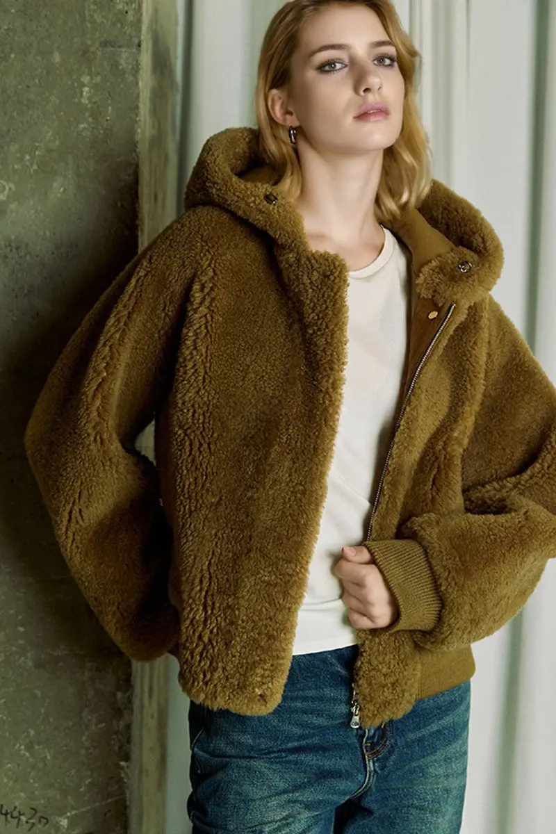 Pure Spain Merino Sheepskin Shearling Bomber Jacket with Hood