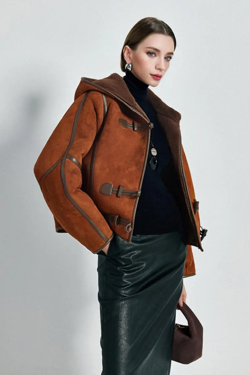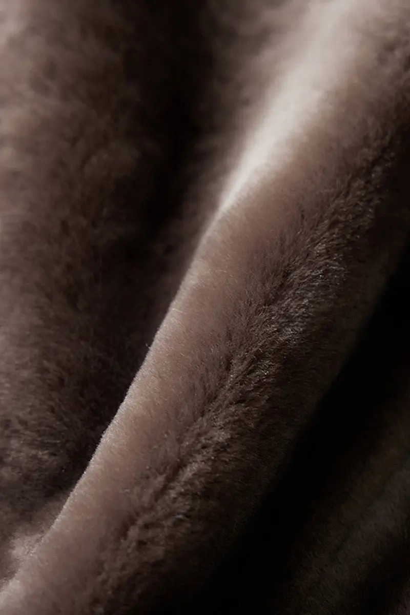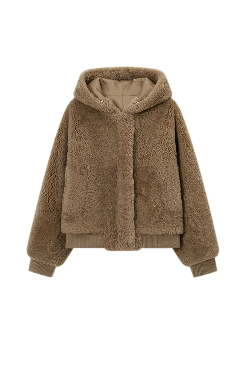 Brown Hooded Shearling Sheepskin Textured Jacket