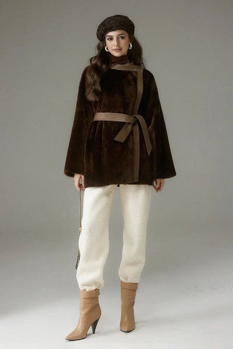 Oversized Spain Merino Sheepskin Shearling Wrap Coat with Belt