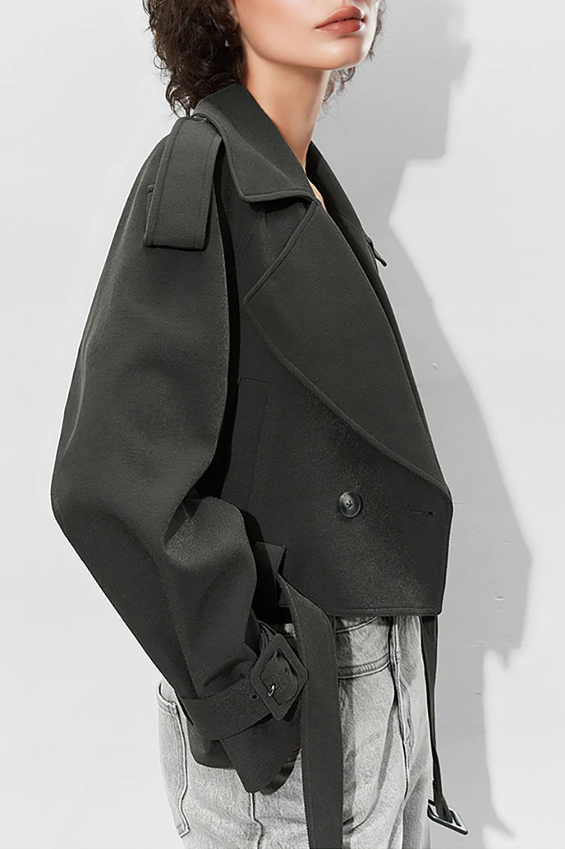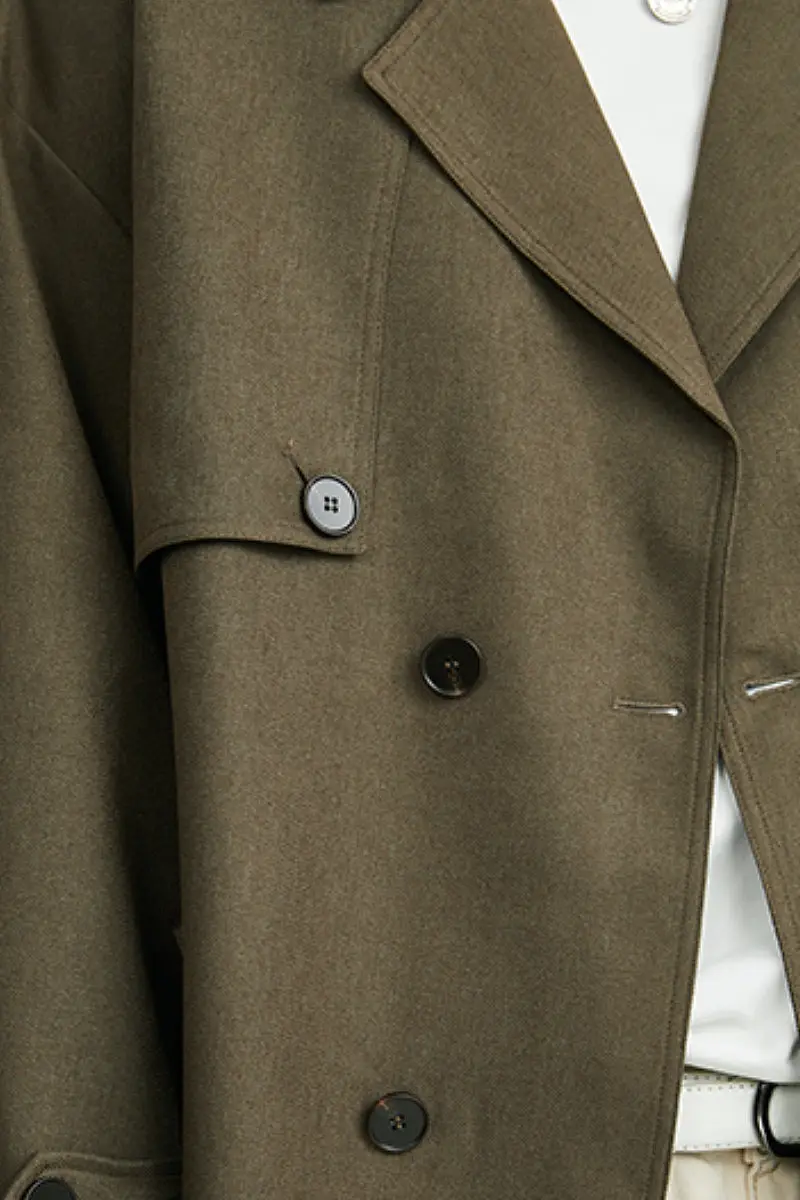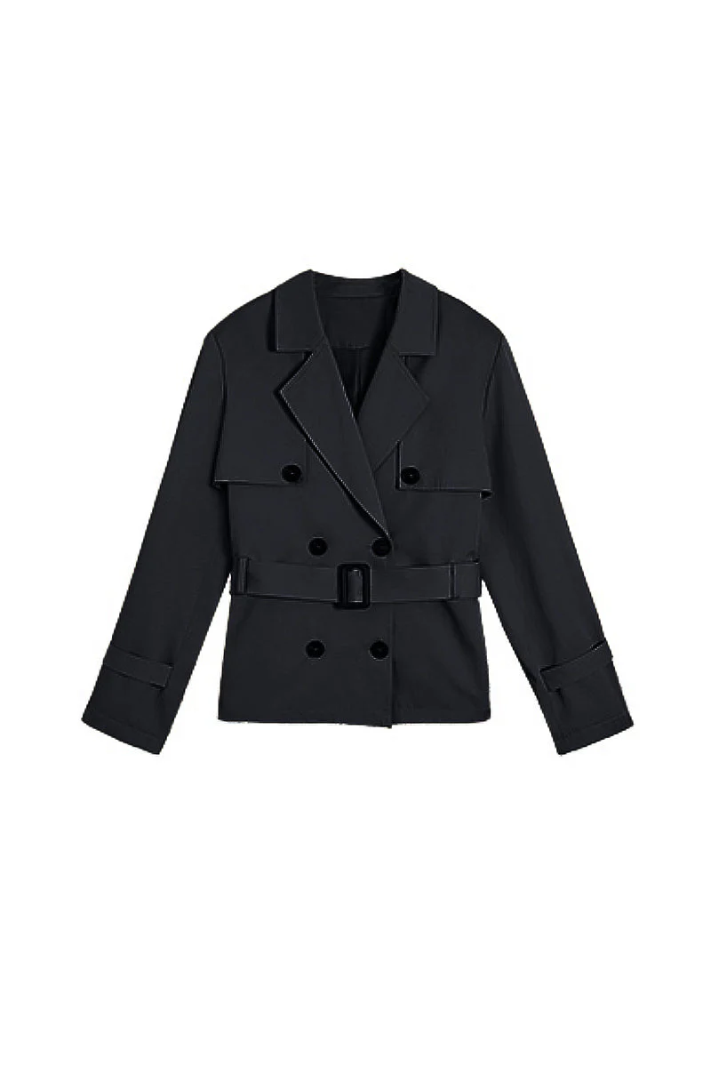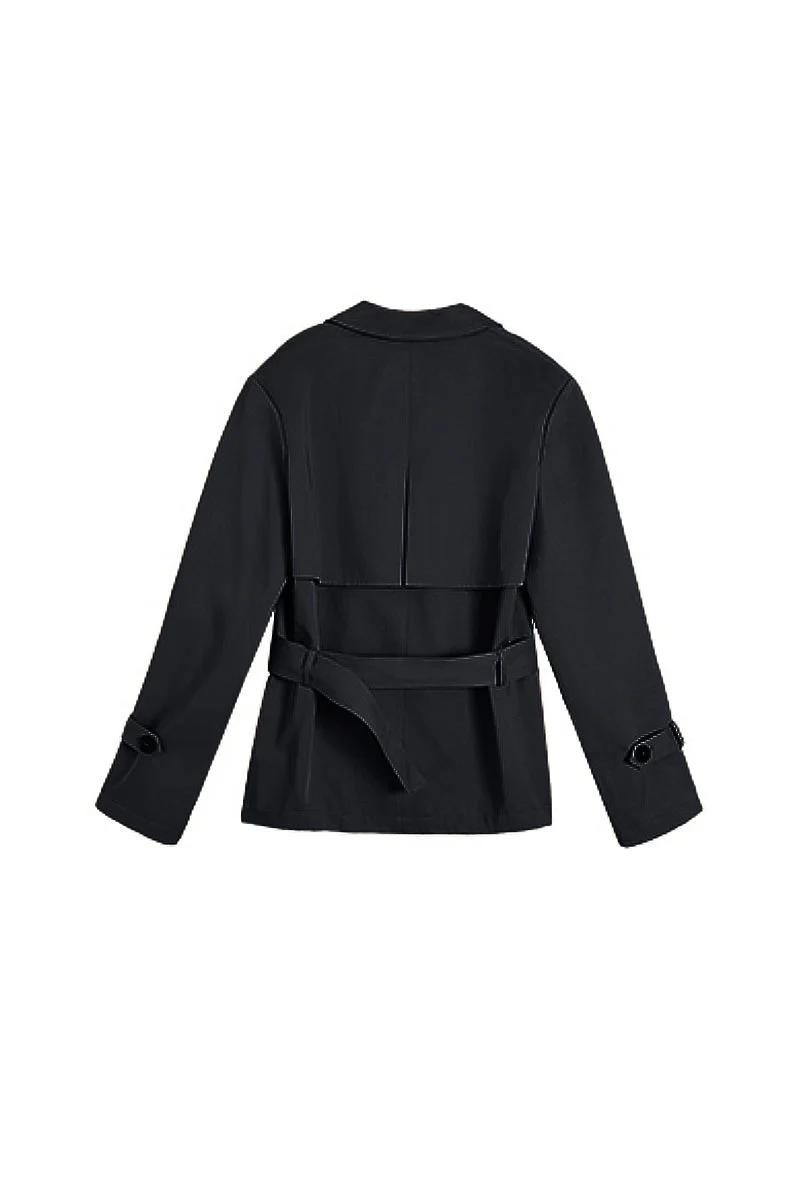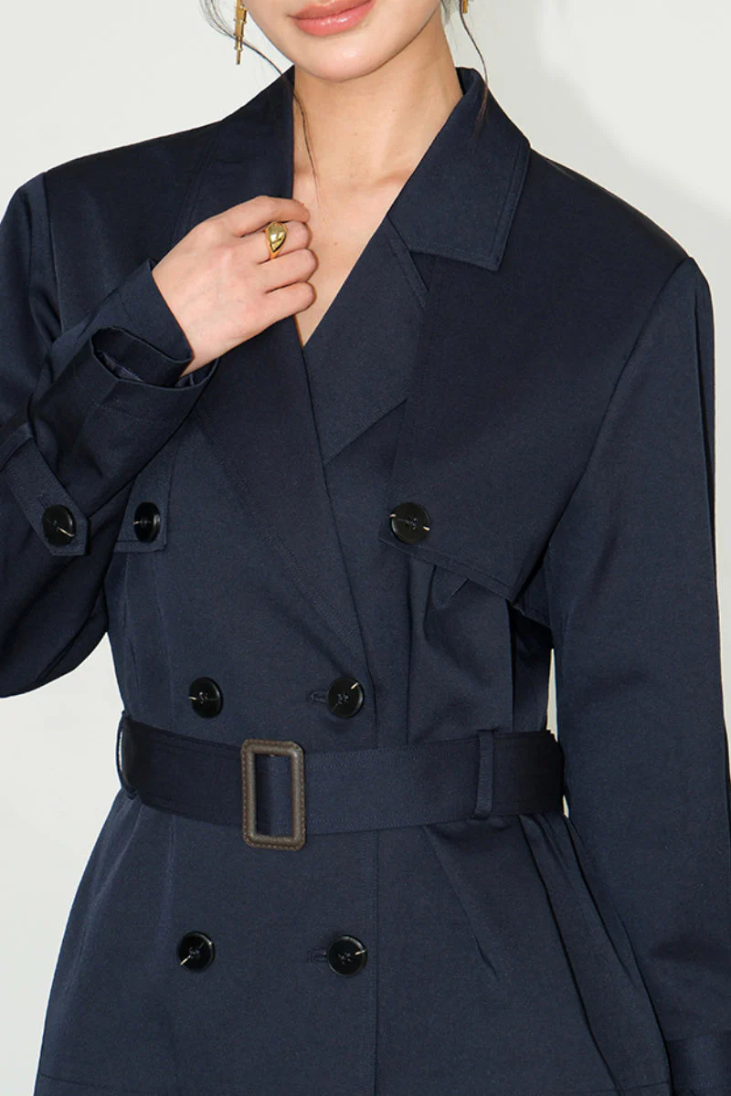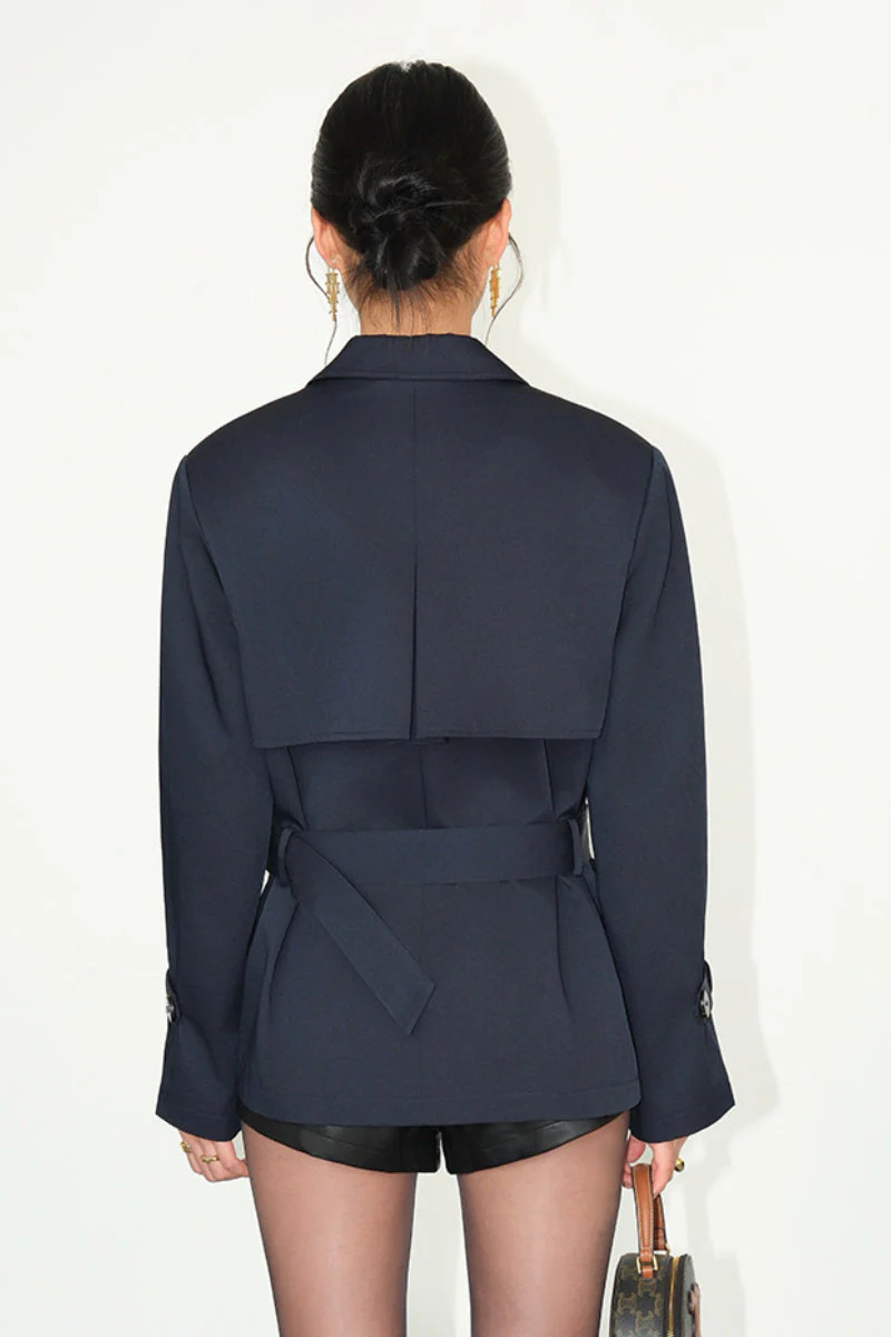 Classic Short Double-Breasted Twill Belted Trench Coat in Navy