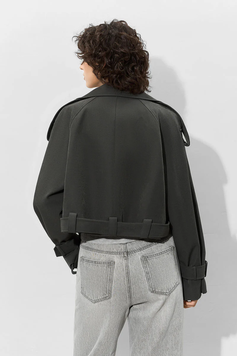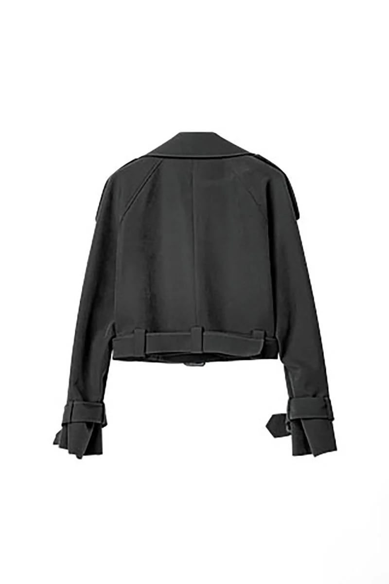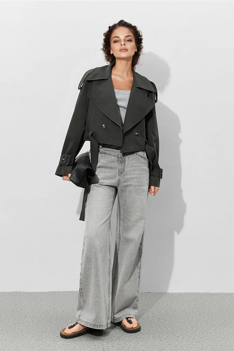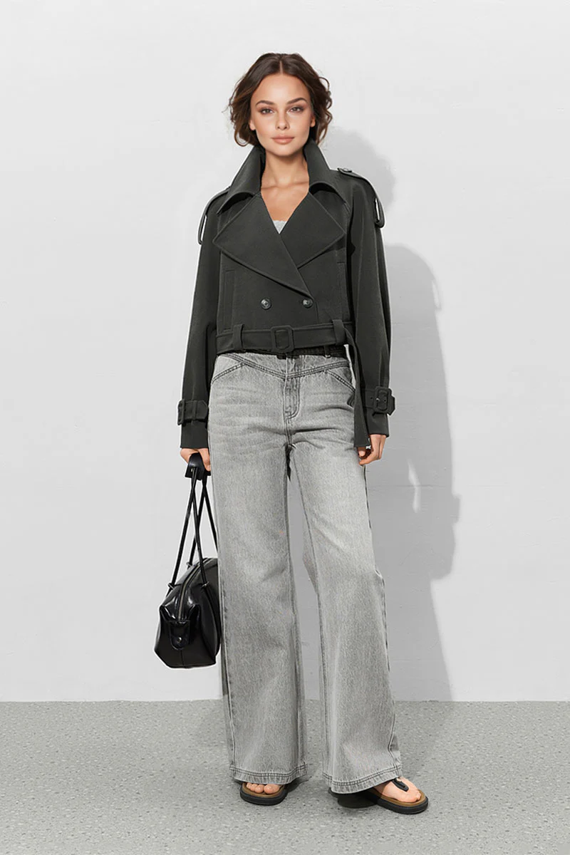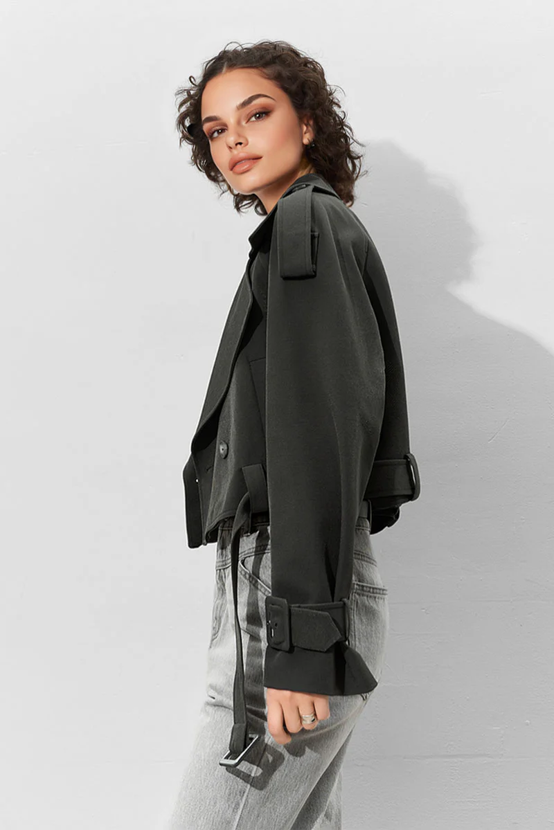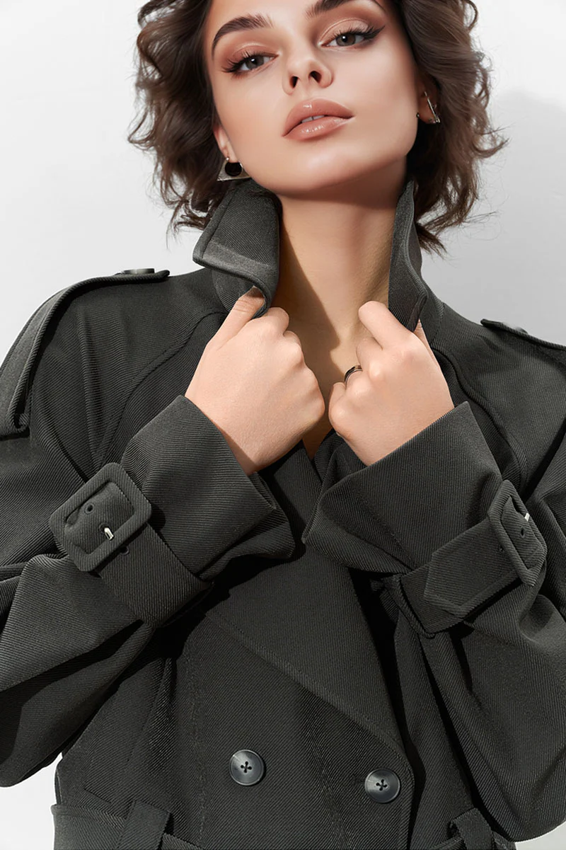 Classic Short Double-Breasted Twill Belted Trench Coat in Navy