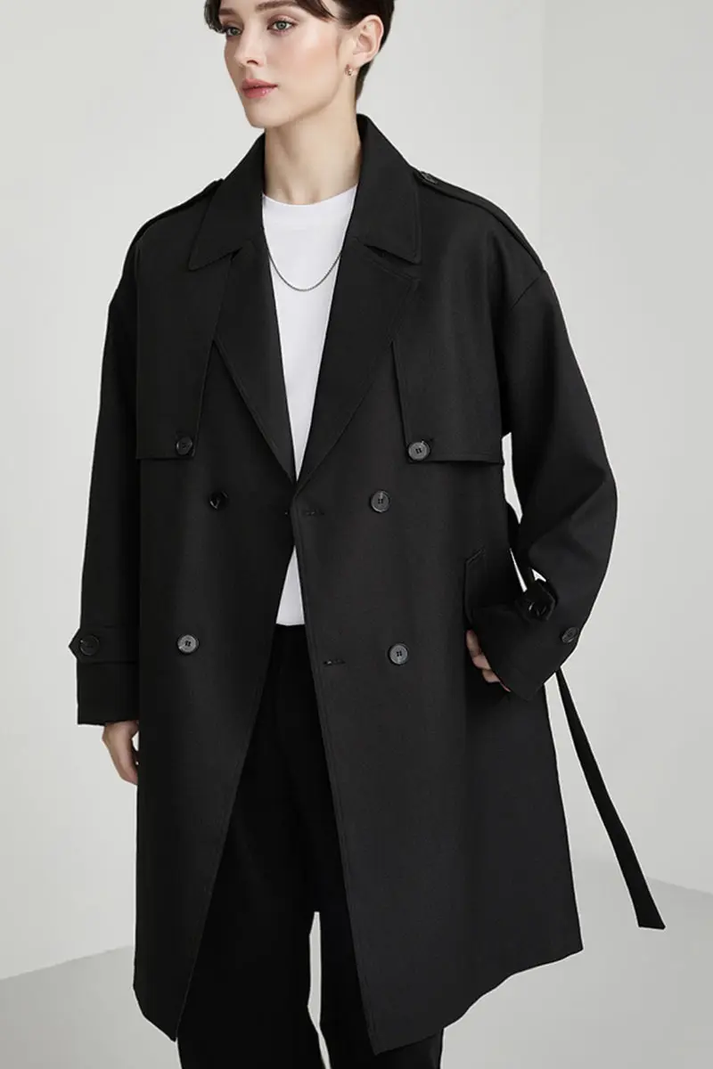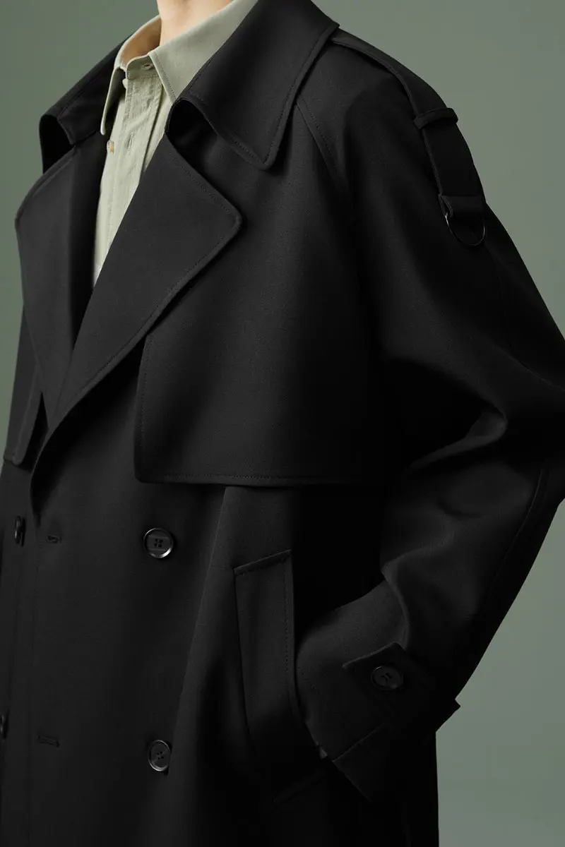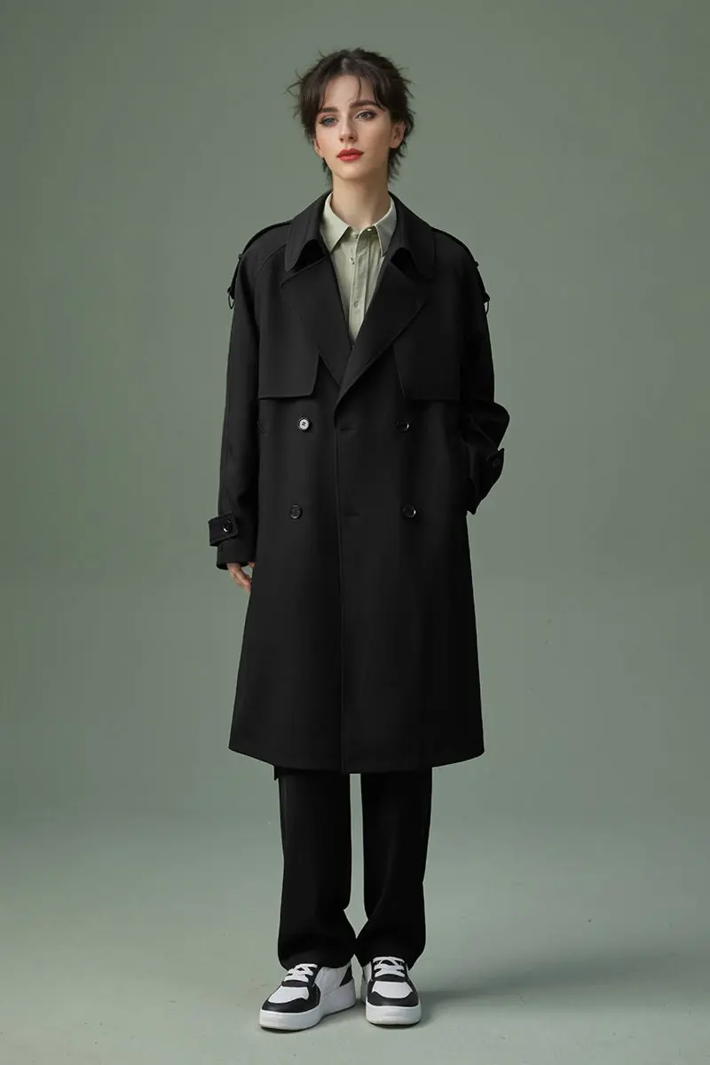 Classic London Style Mid-length Double Breasted Black Trench Coat