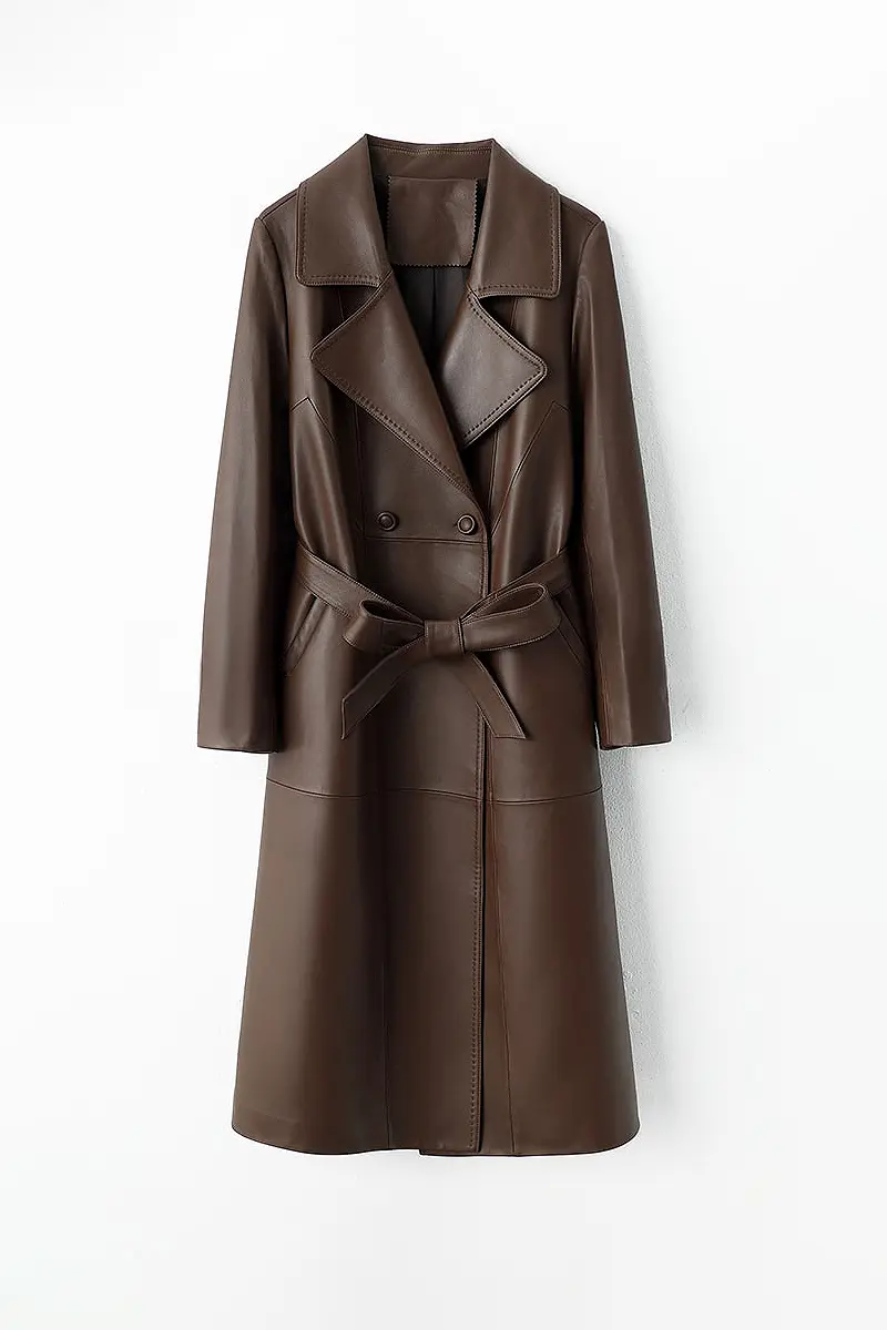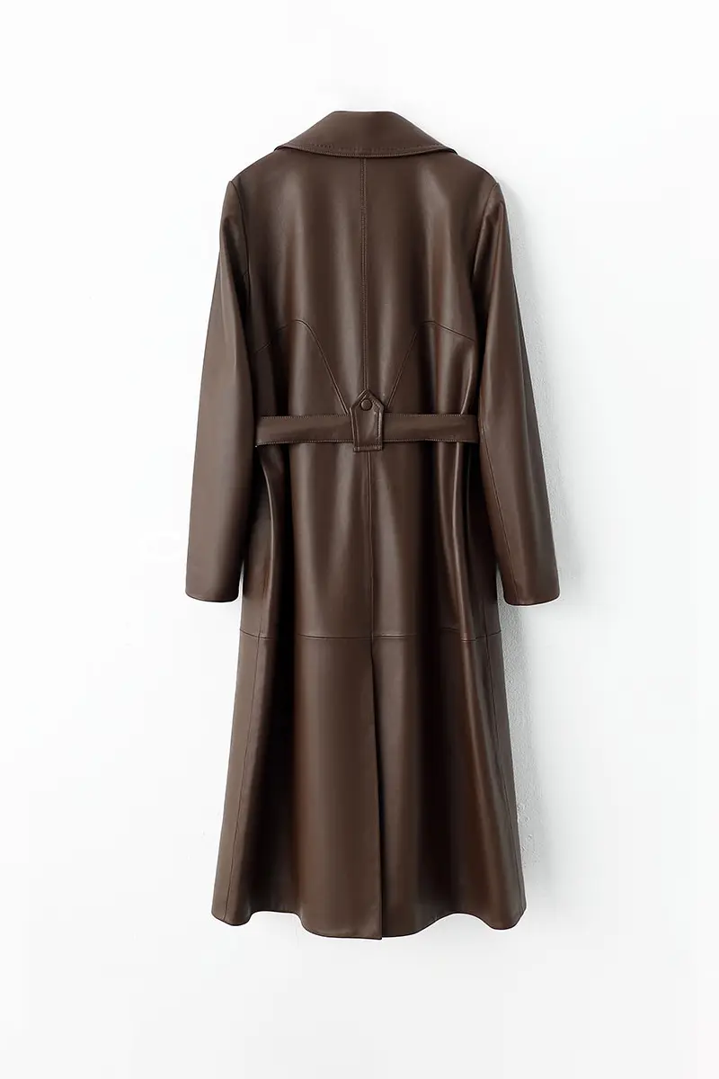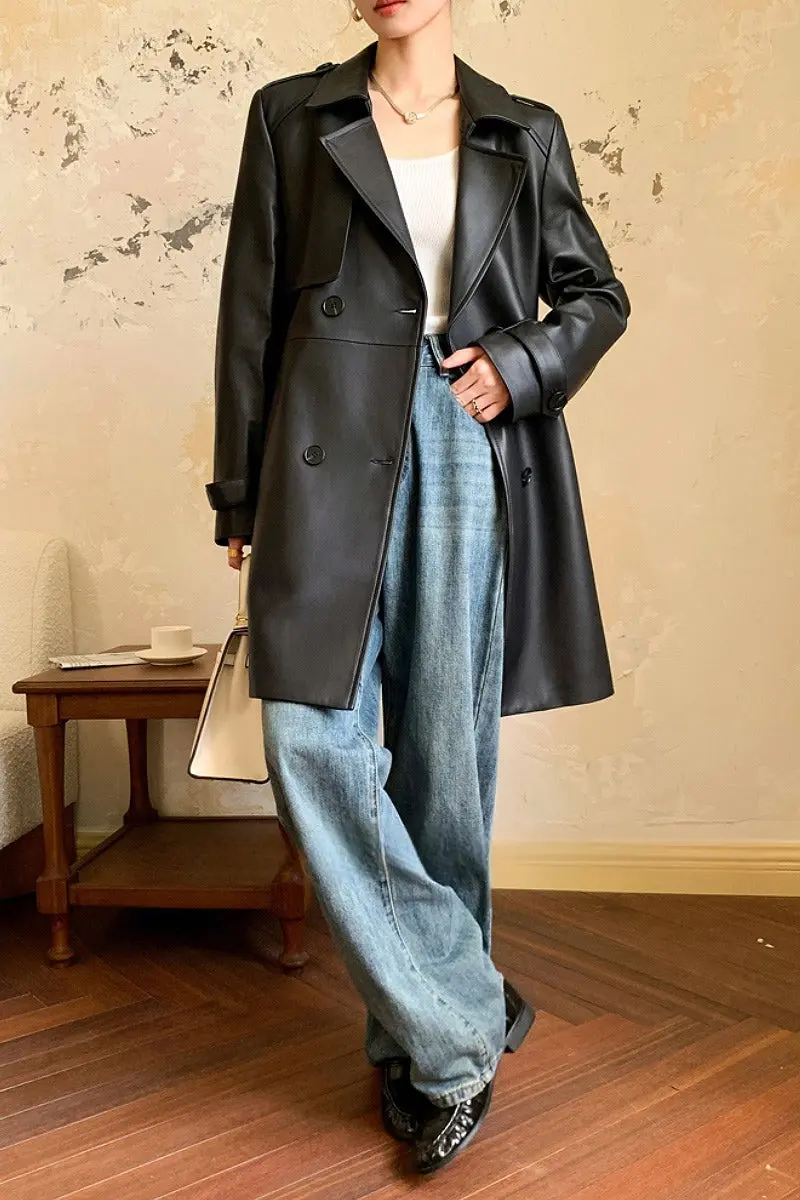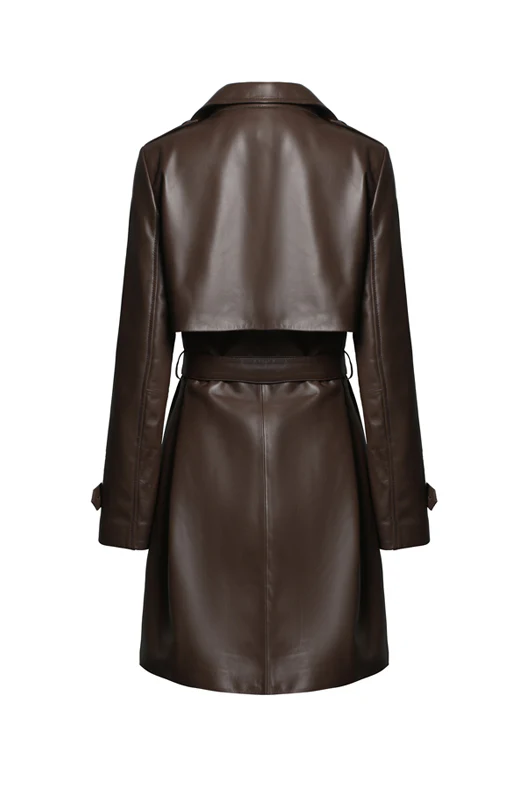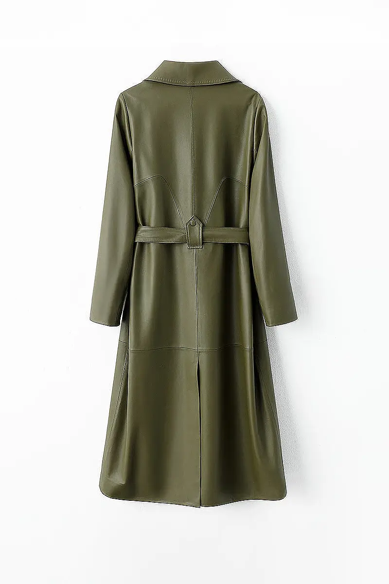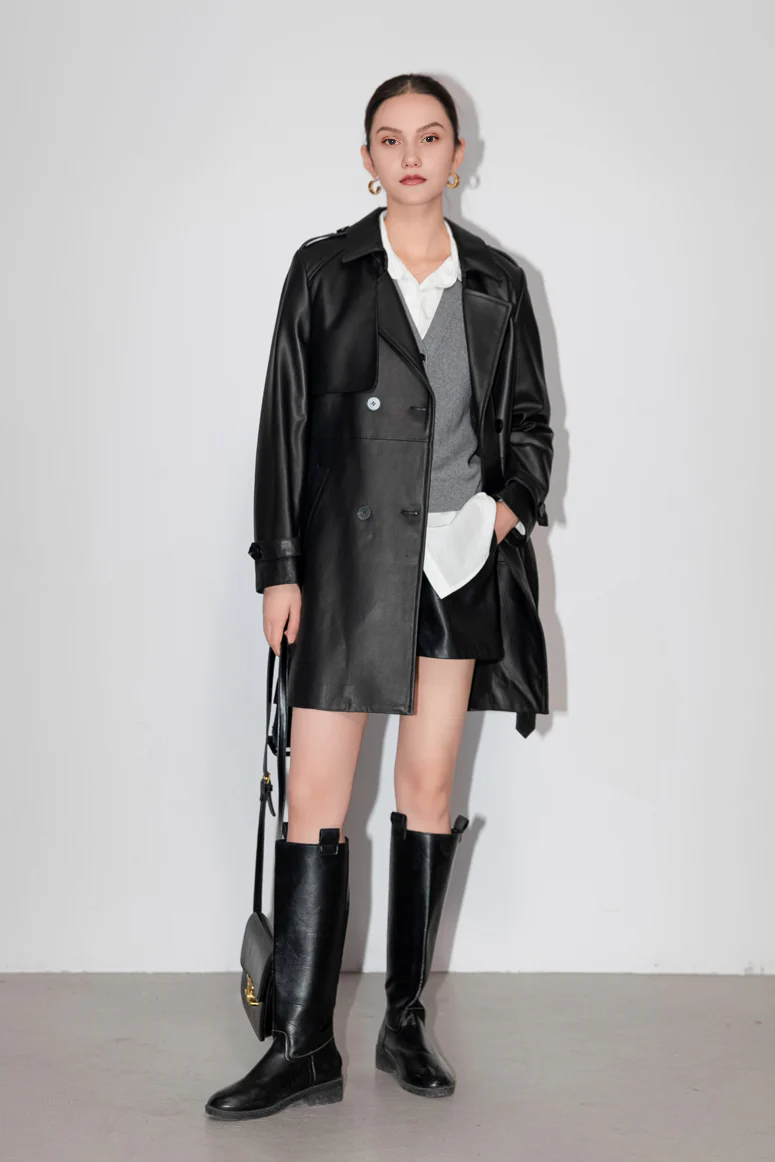 Real Leatrher Mid-Length Double Breasted Trench Coat with Belt