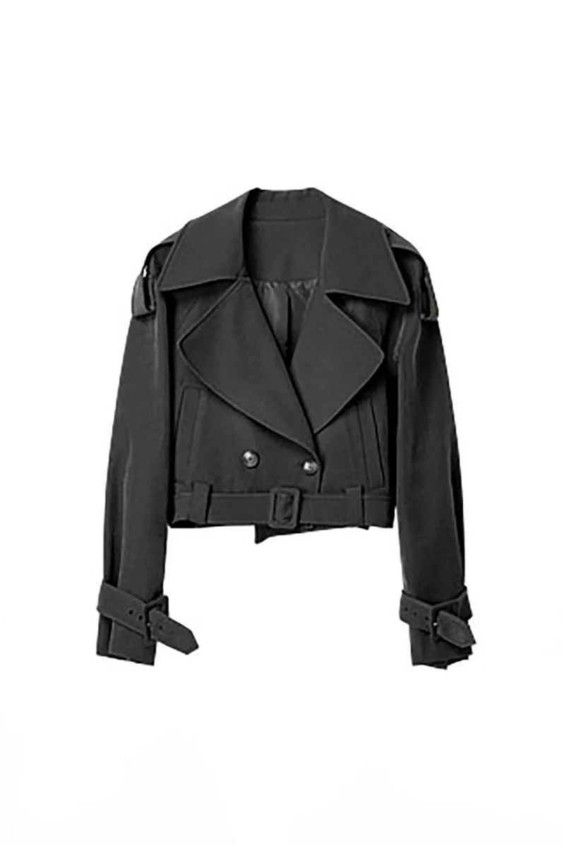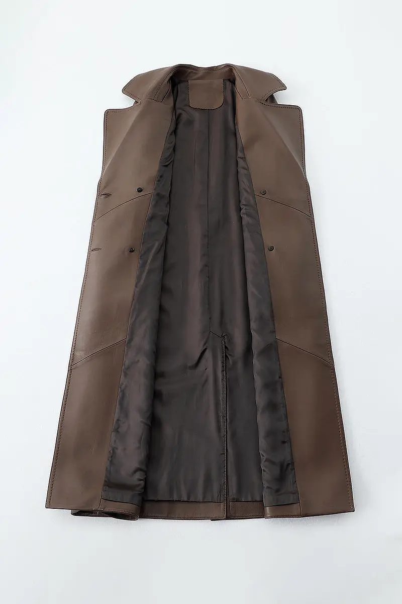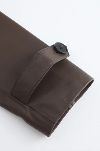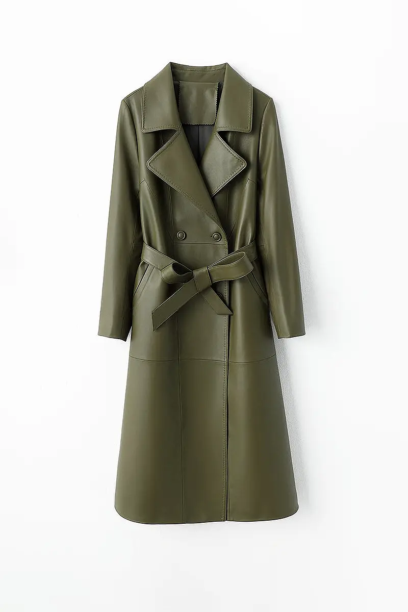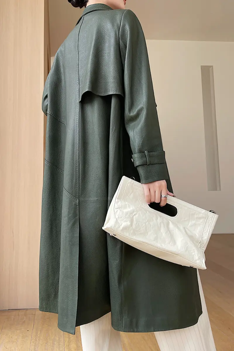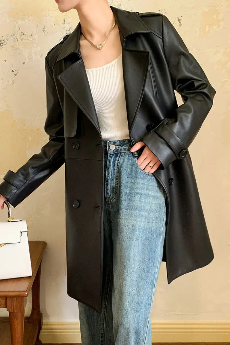 Real Leatrher Mid-Length Double Breasted Trench Coat with Belt