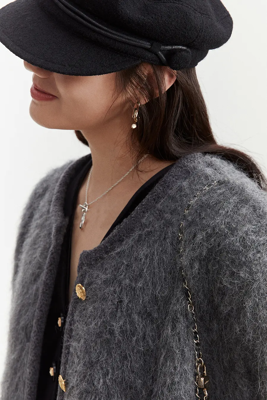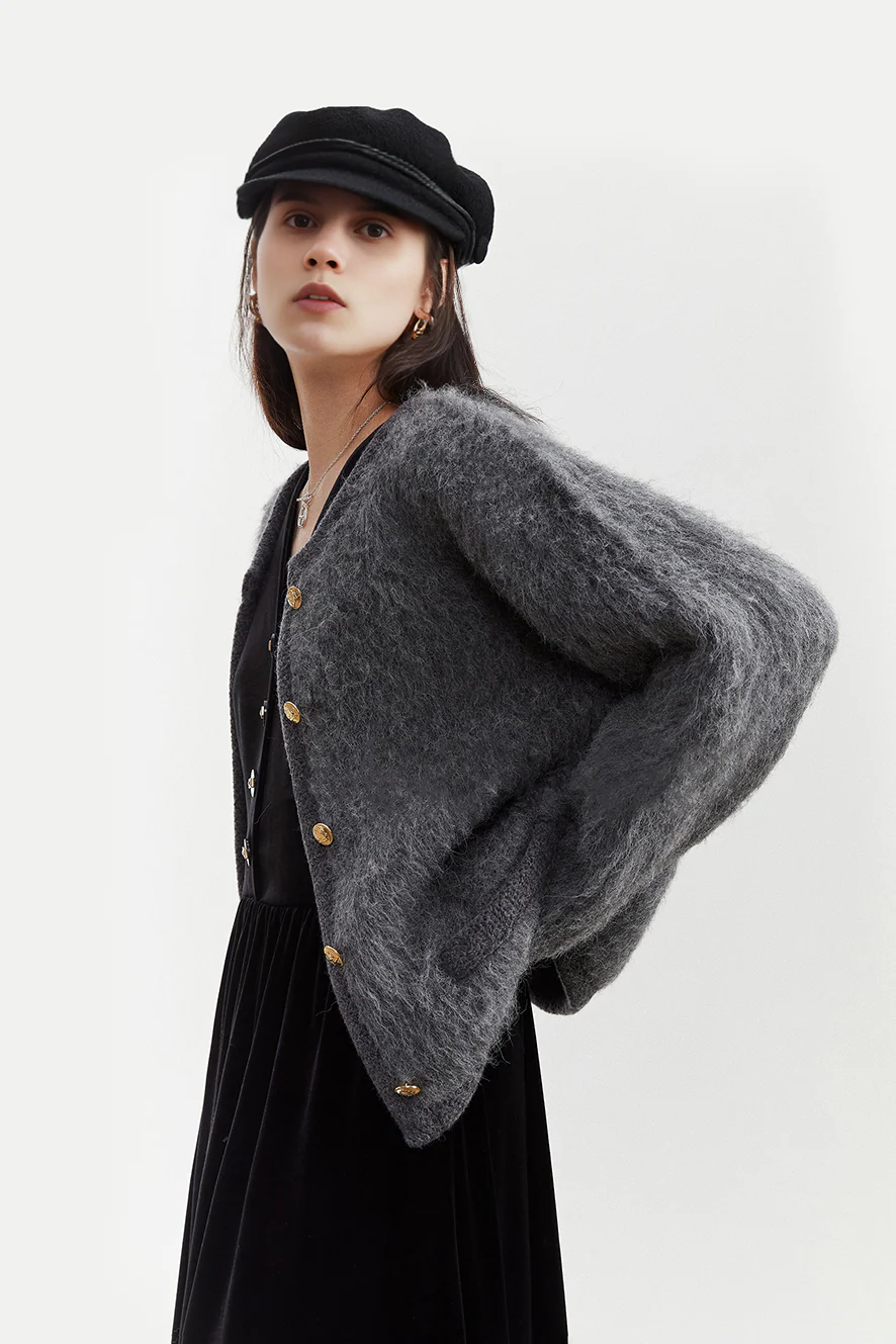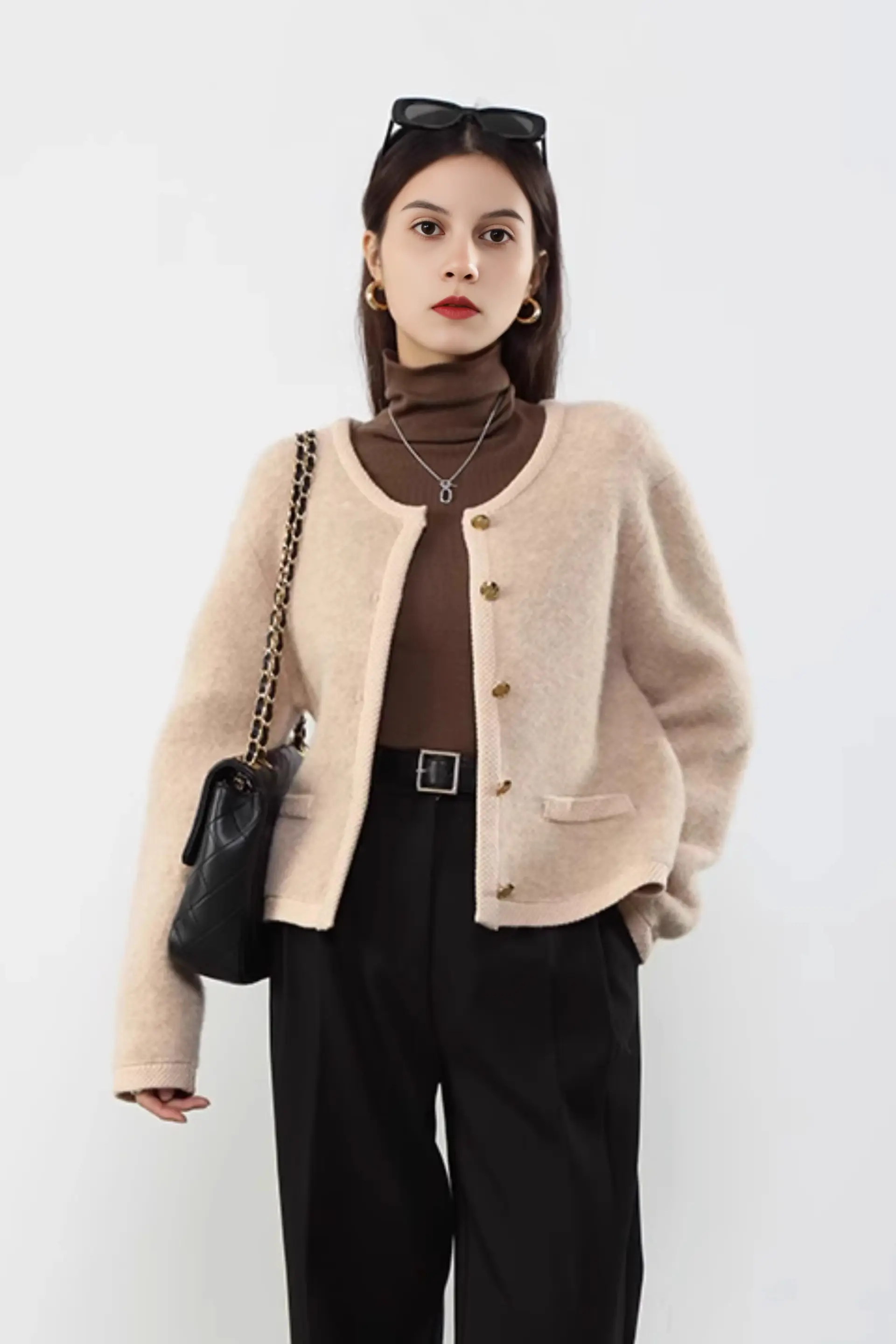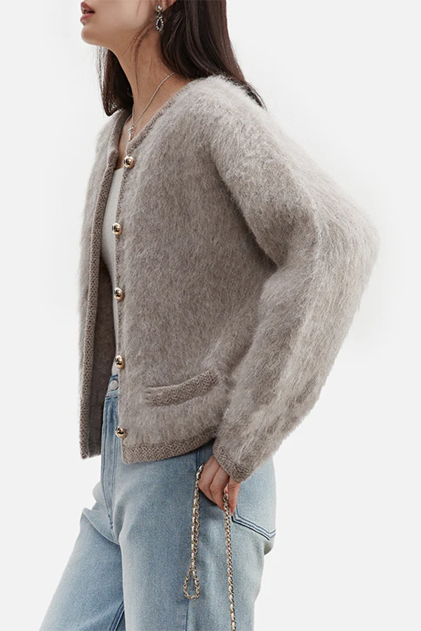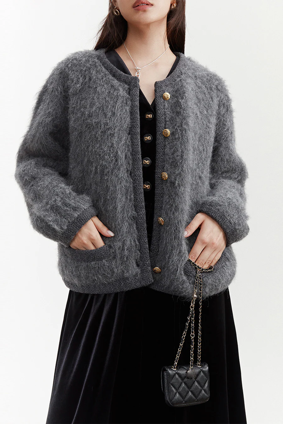 Golden Button Fluffy Alpaca Wool Knit Bouncle Jacket