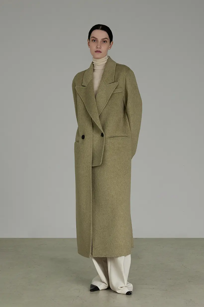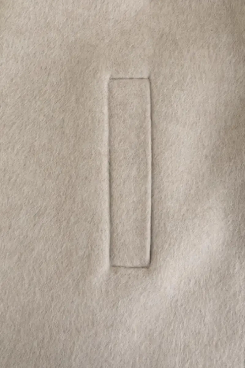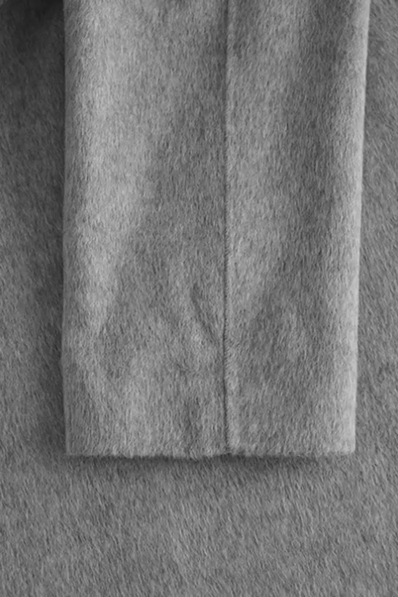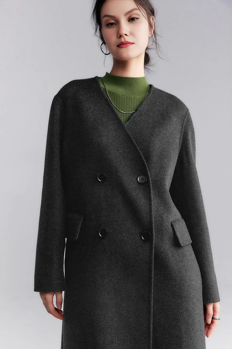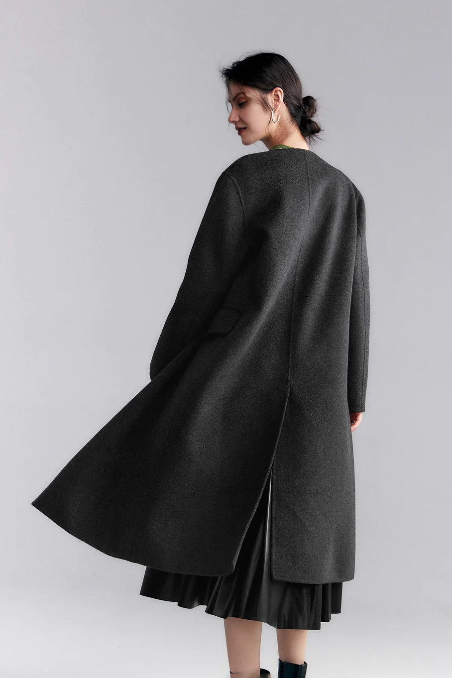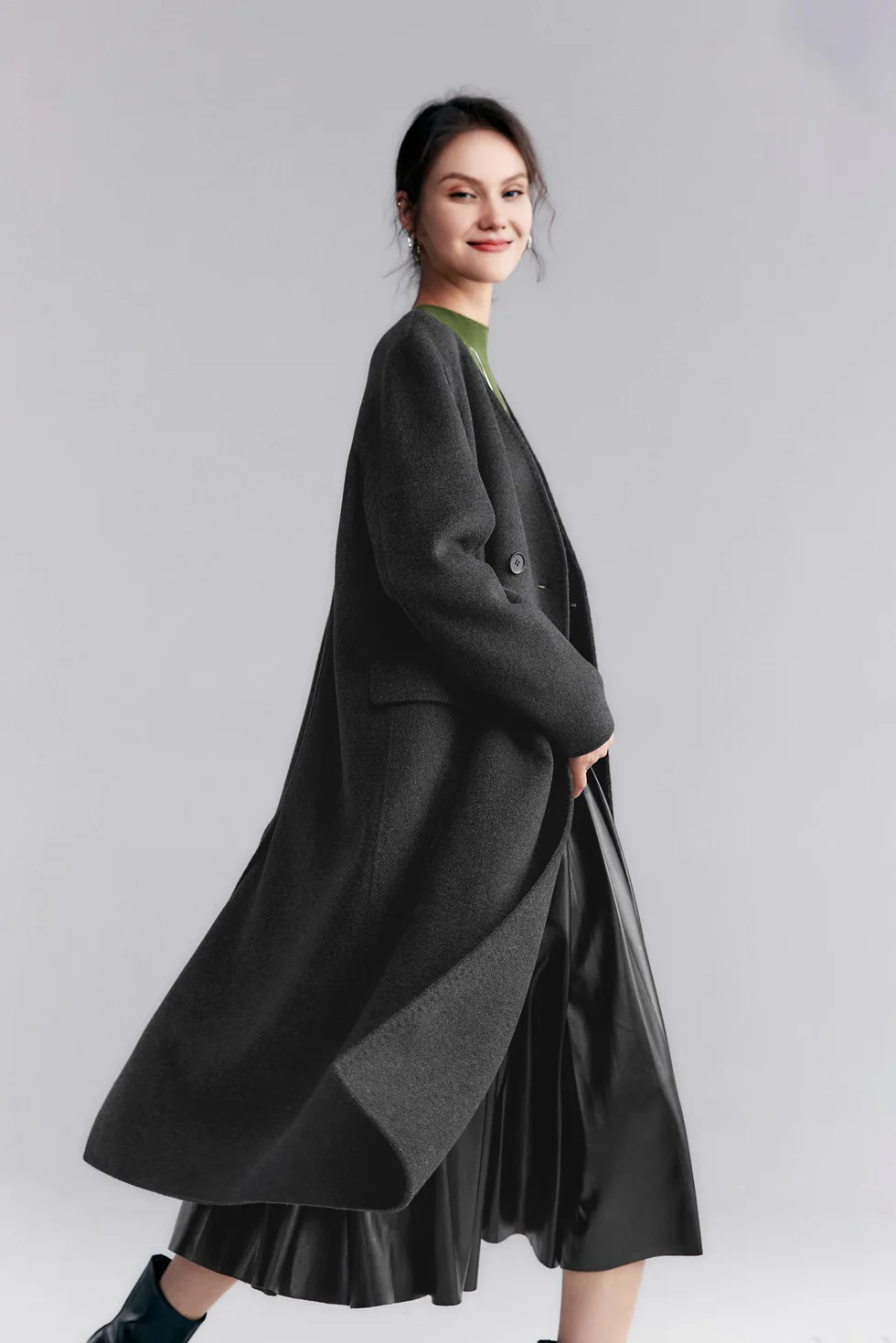 Grey Collarless Double Breasted Wool Cashmere Coat