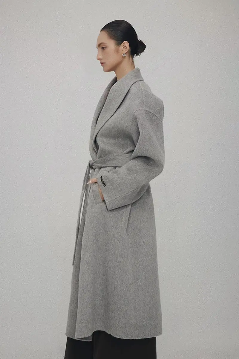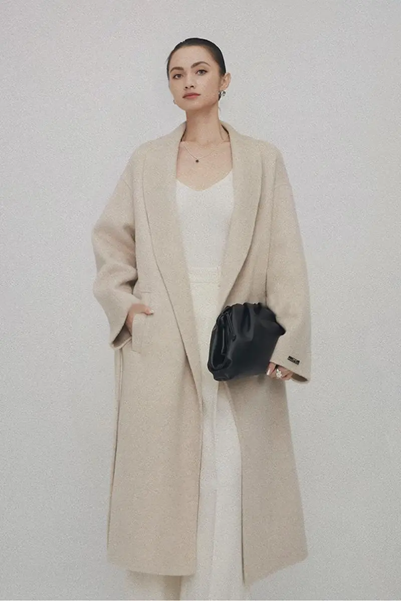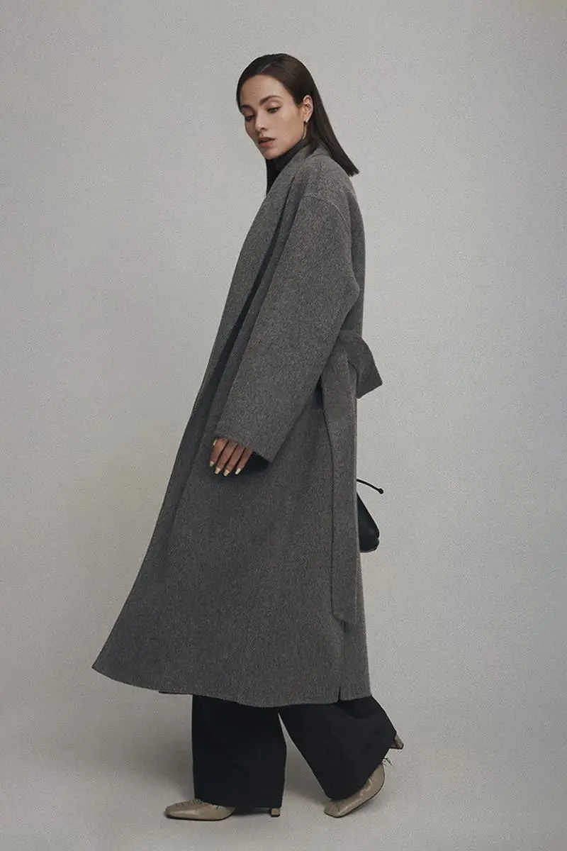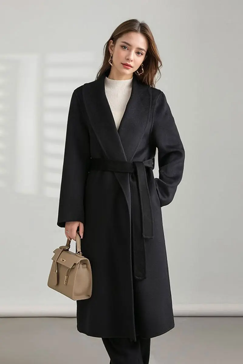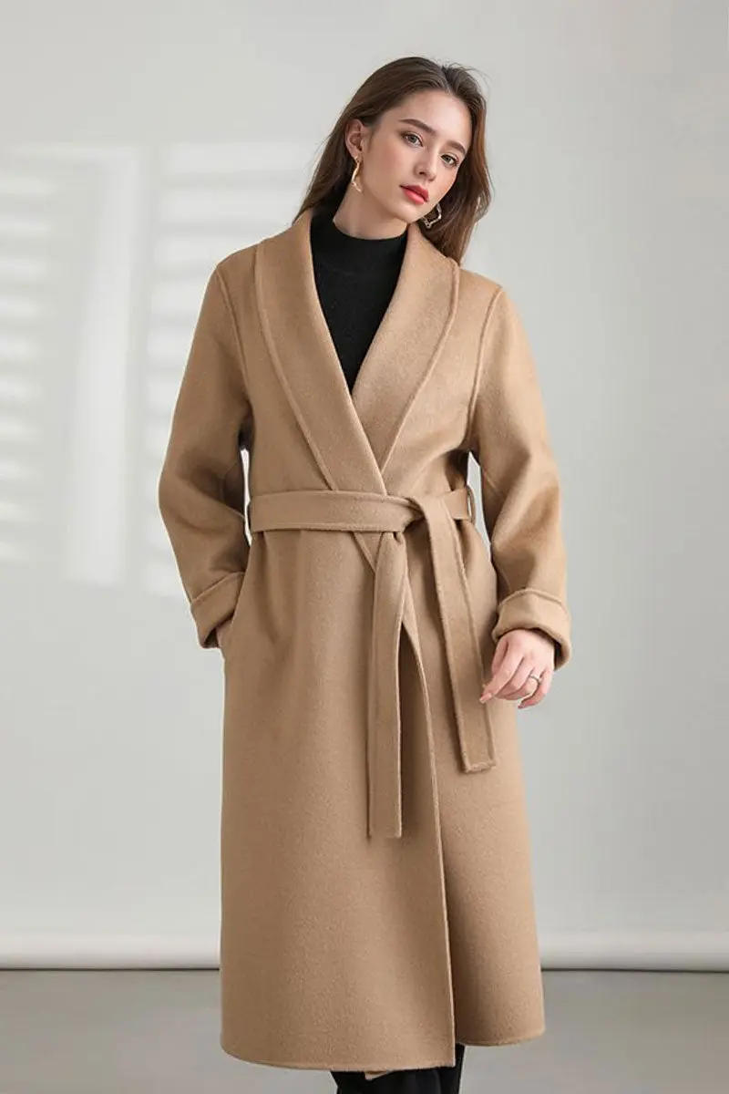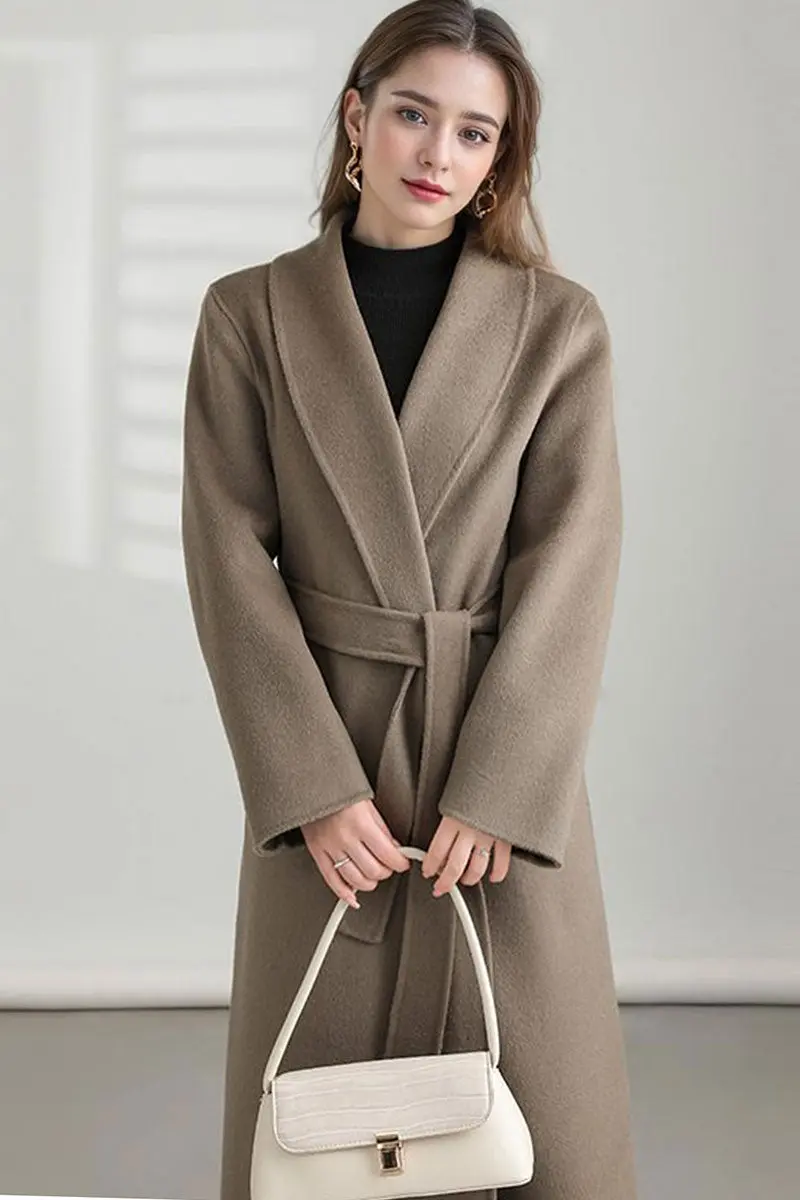 Long Wool Silk Blend Wrap Coat with Notched Lapel
