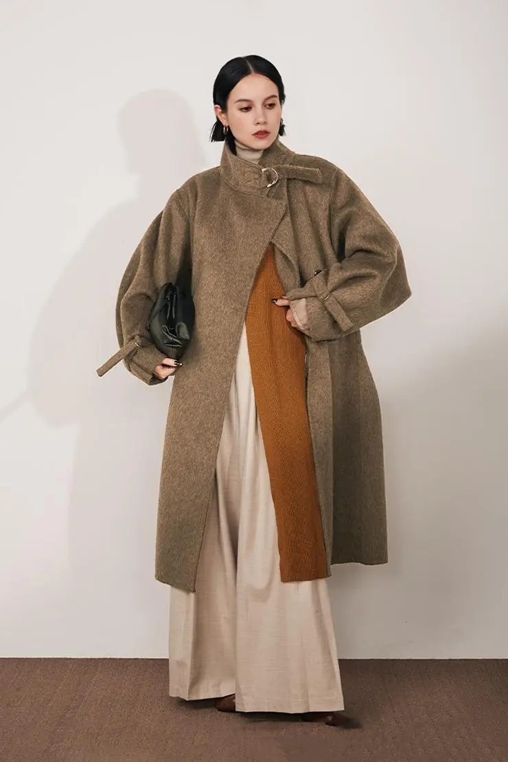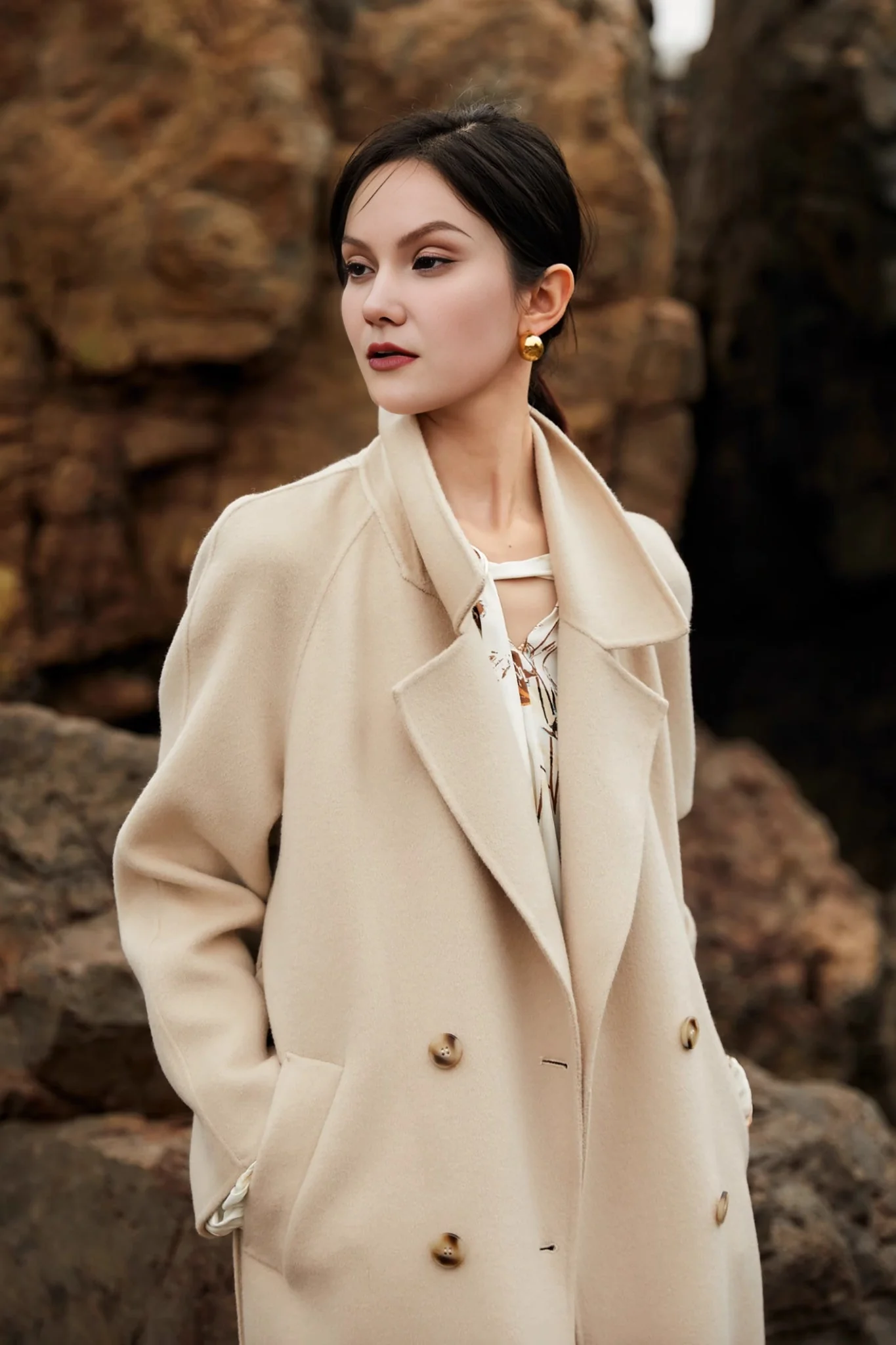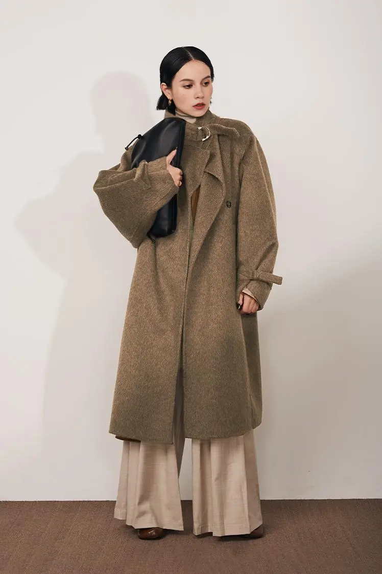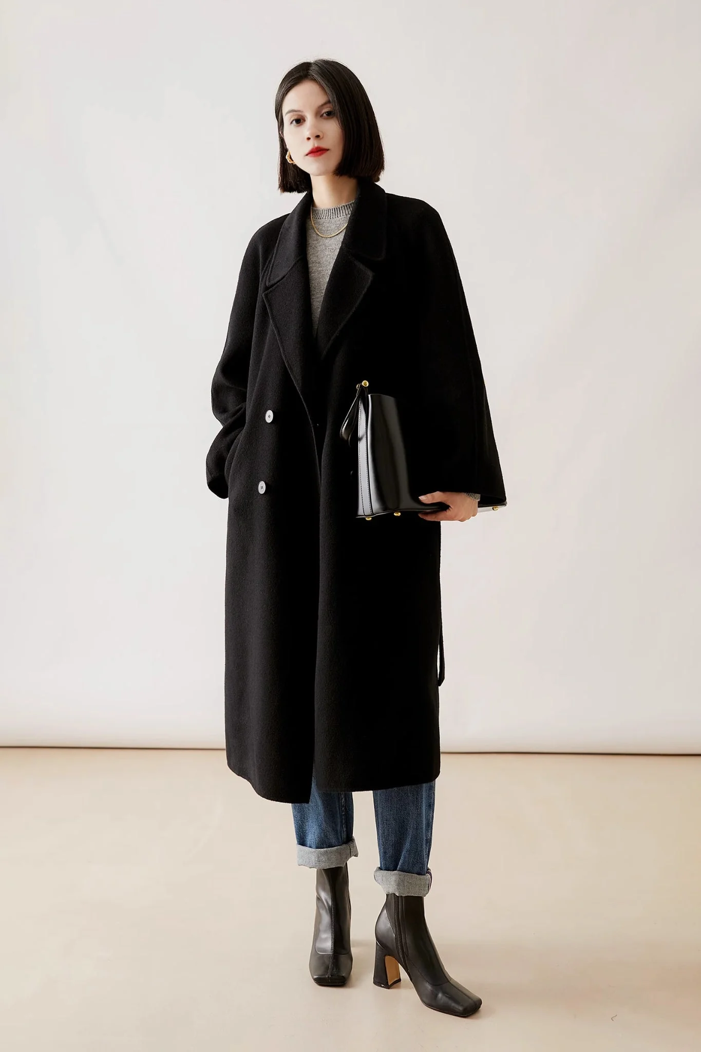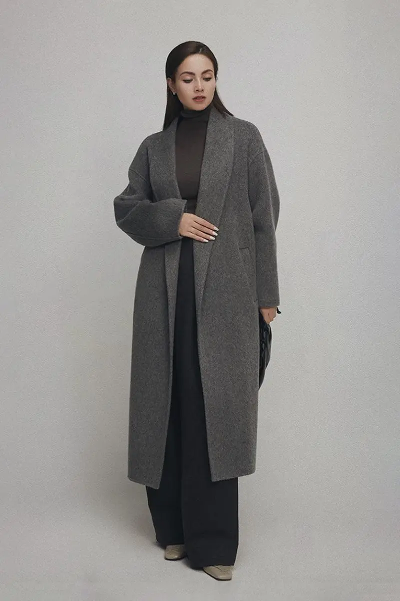 Long Wool Silk Blend Wrap Coat with Notched Lapel