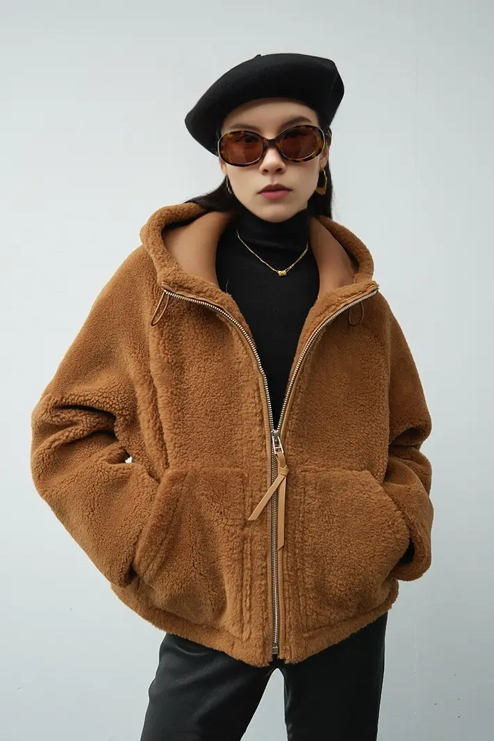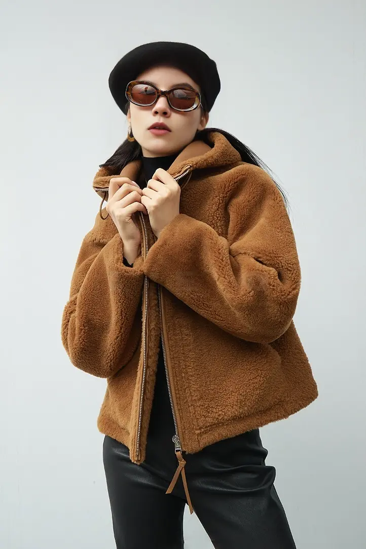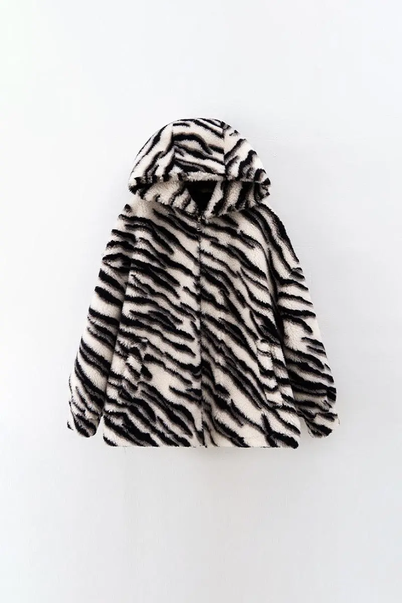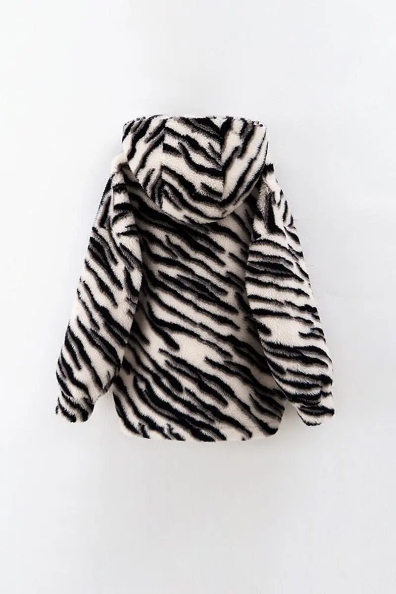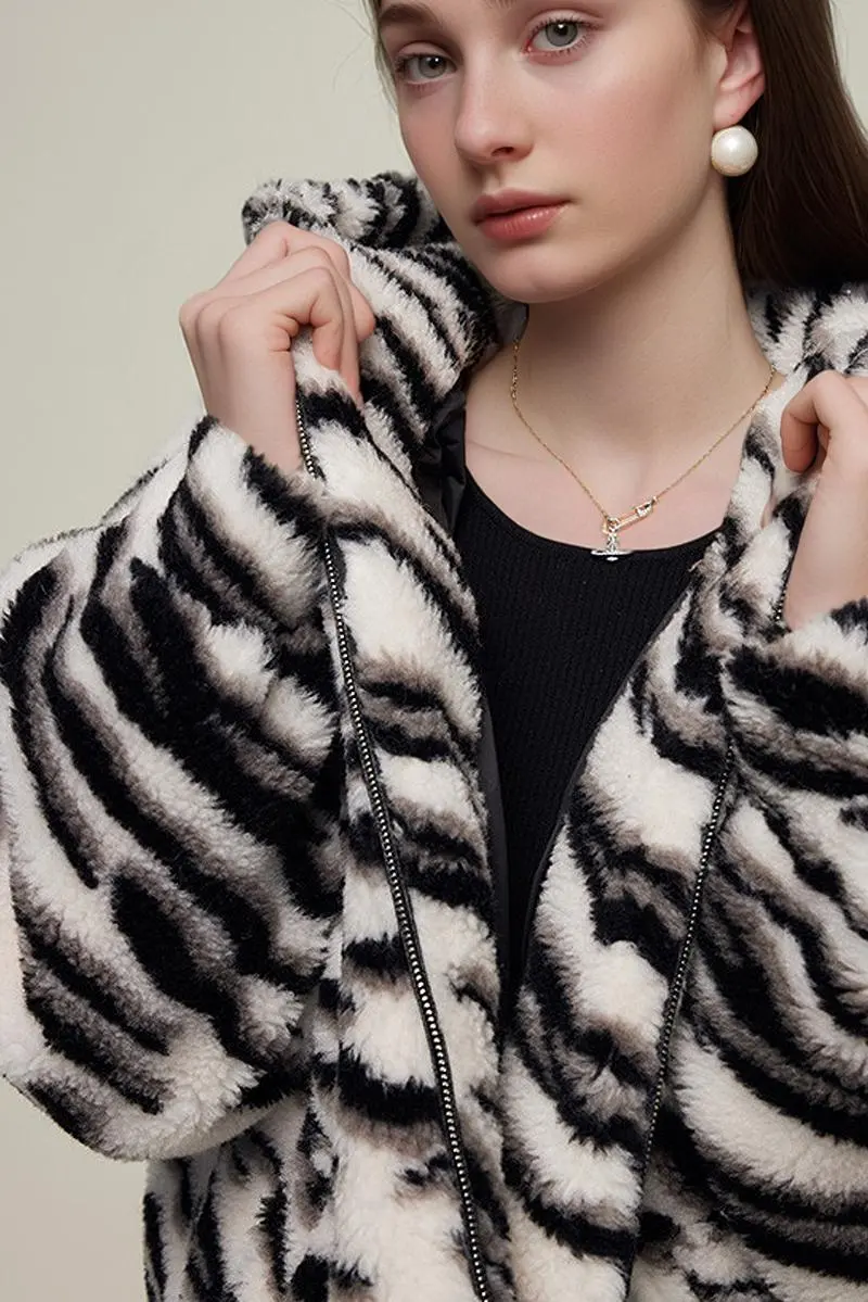 Oversized Zebra Print Genuine Wool Shearling Jacket with Hood
