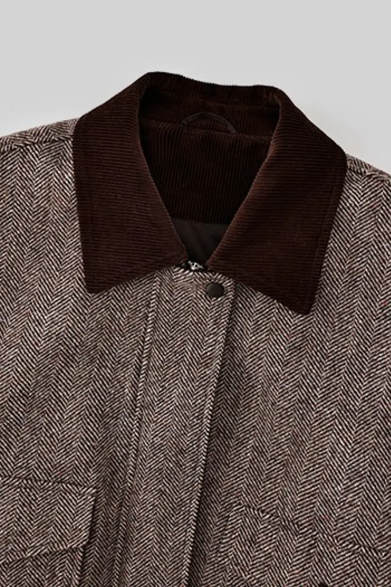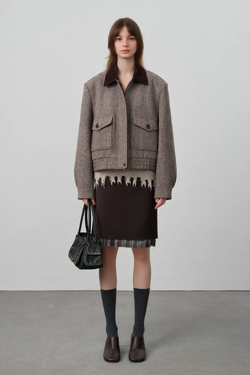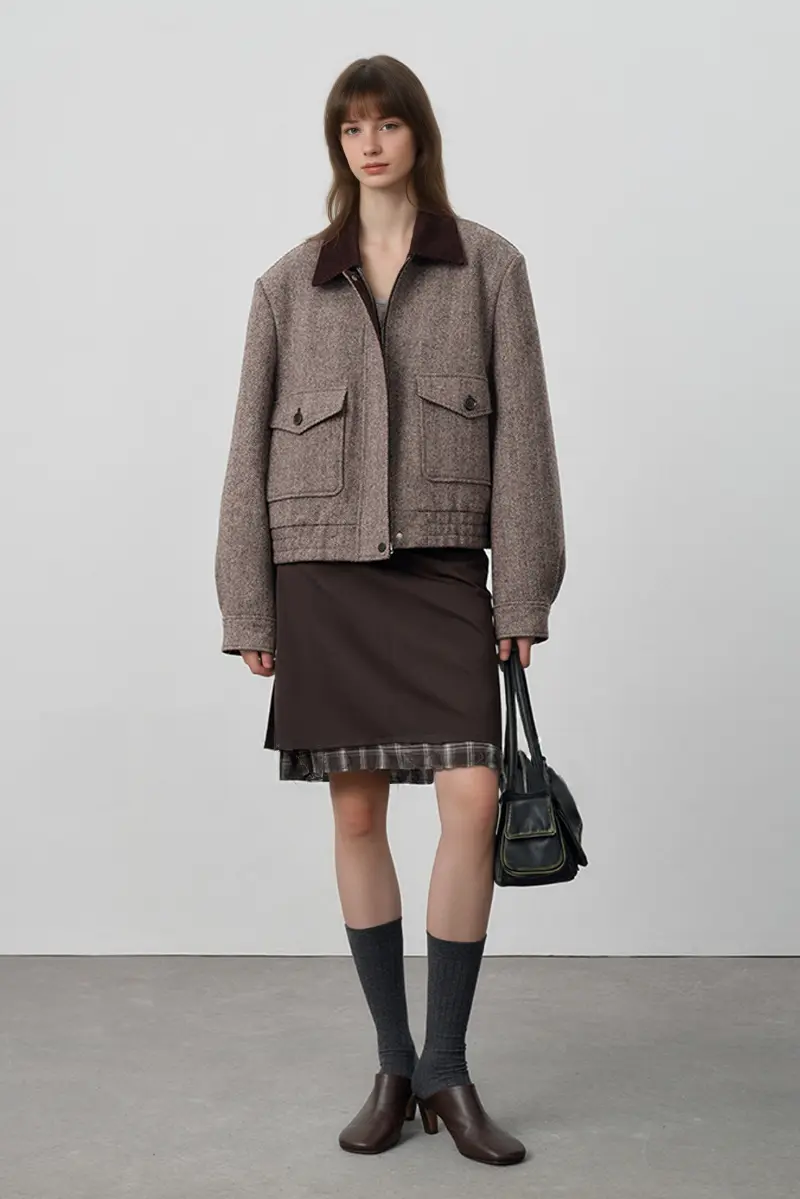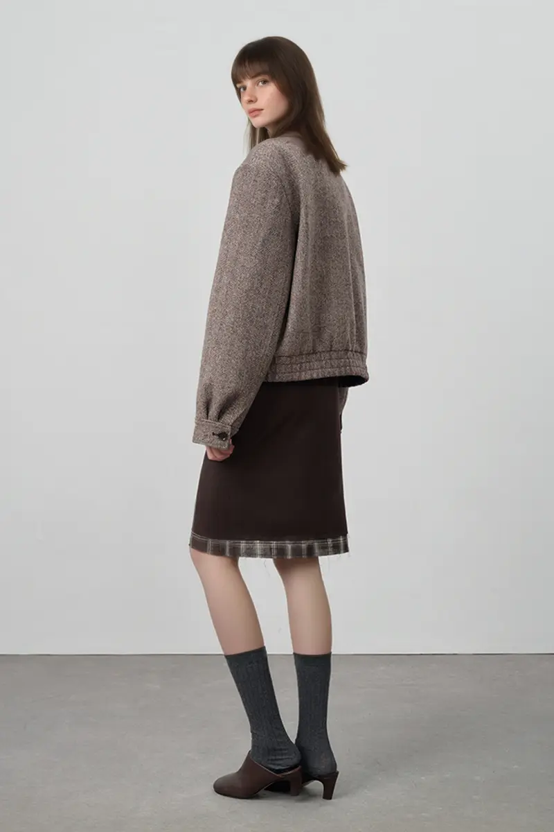 Herringbone Cropped Wool Tweed Bomber Jacket