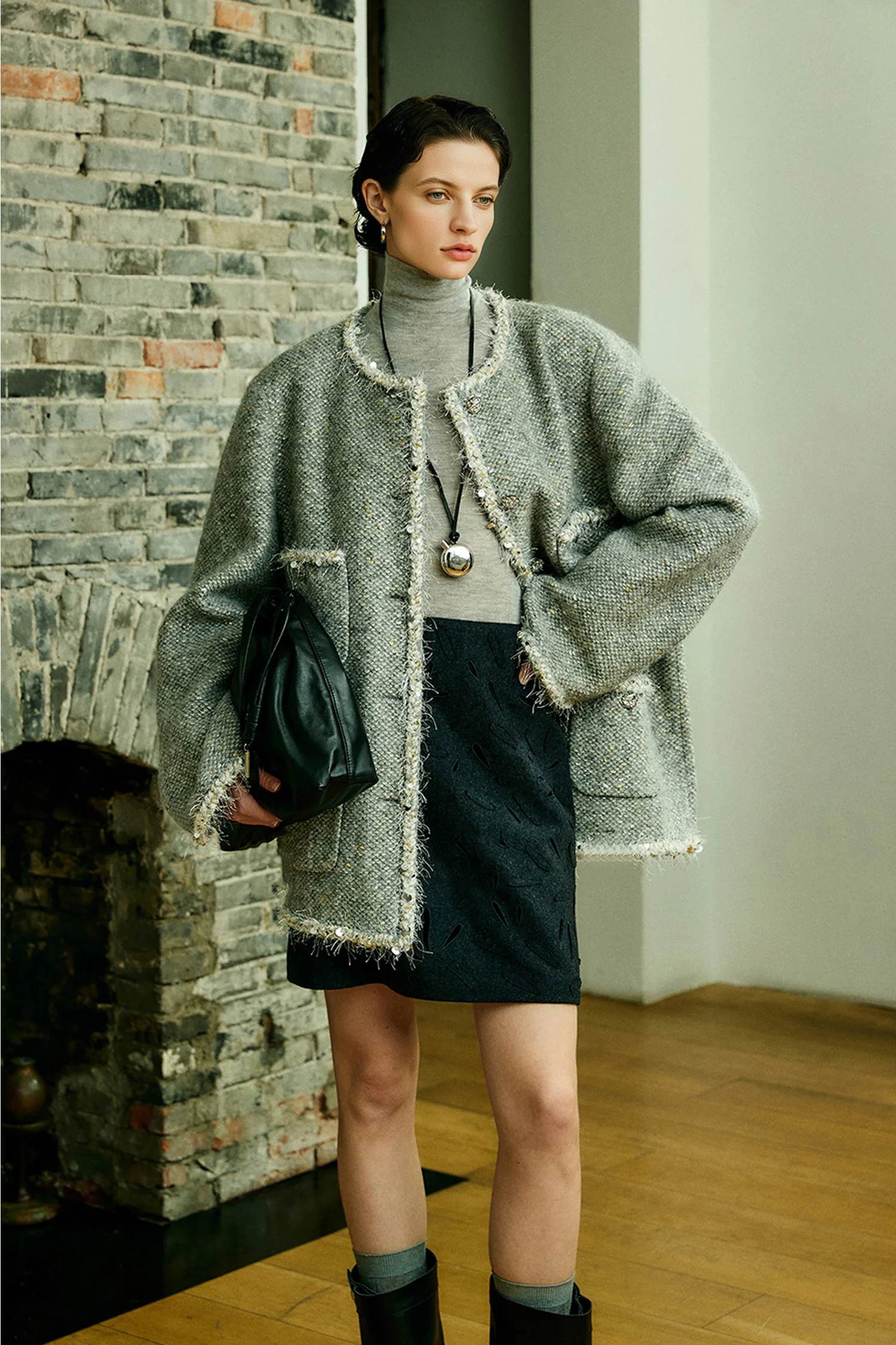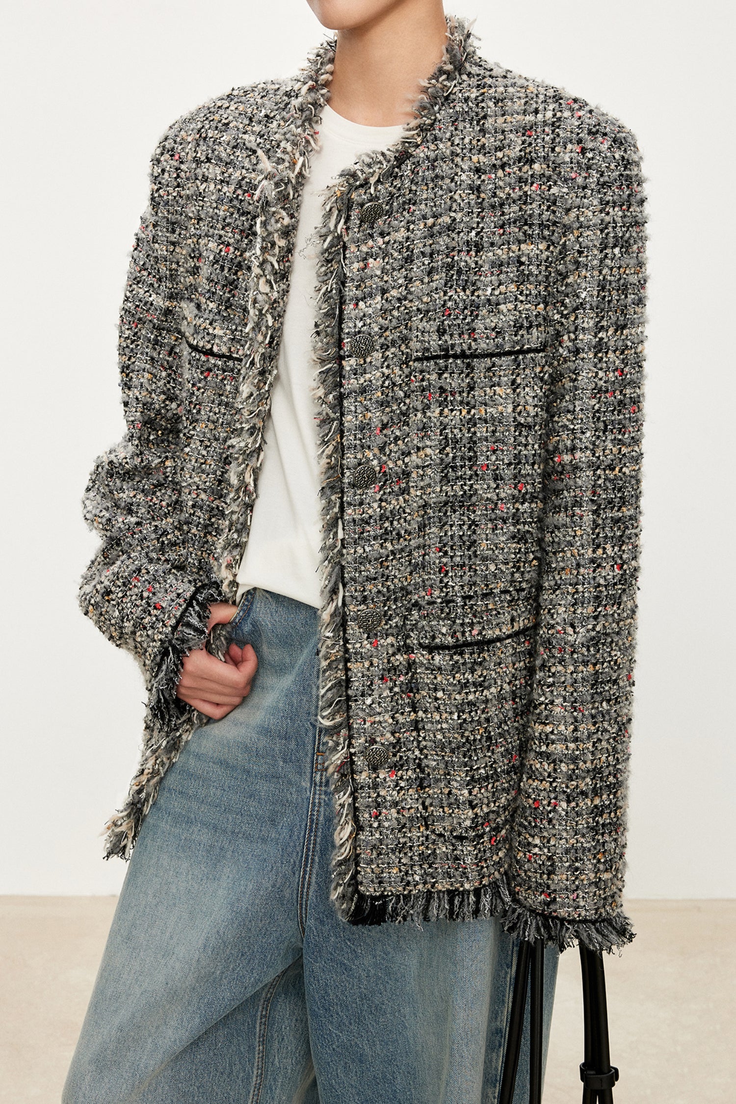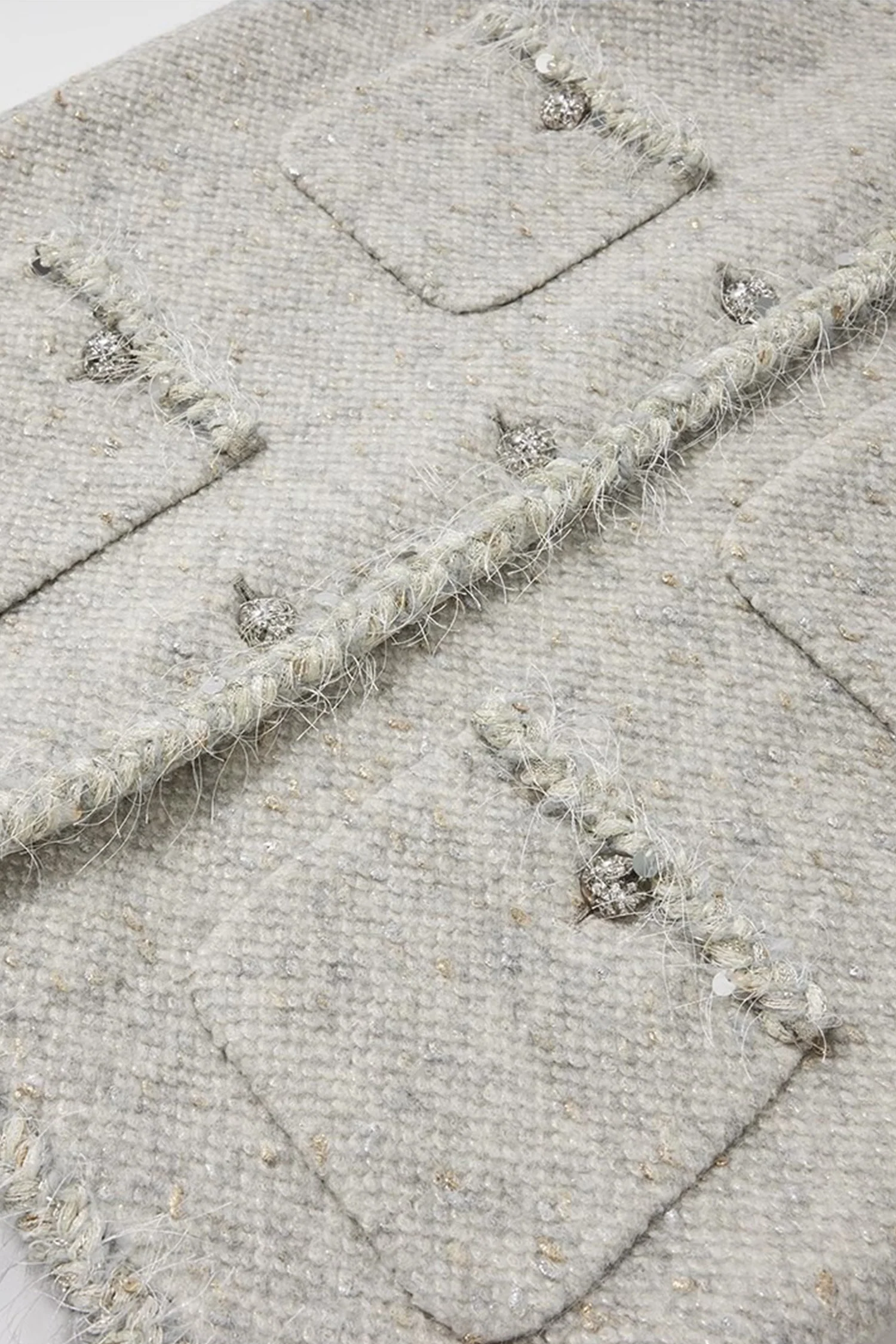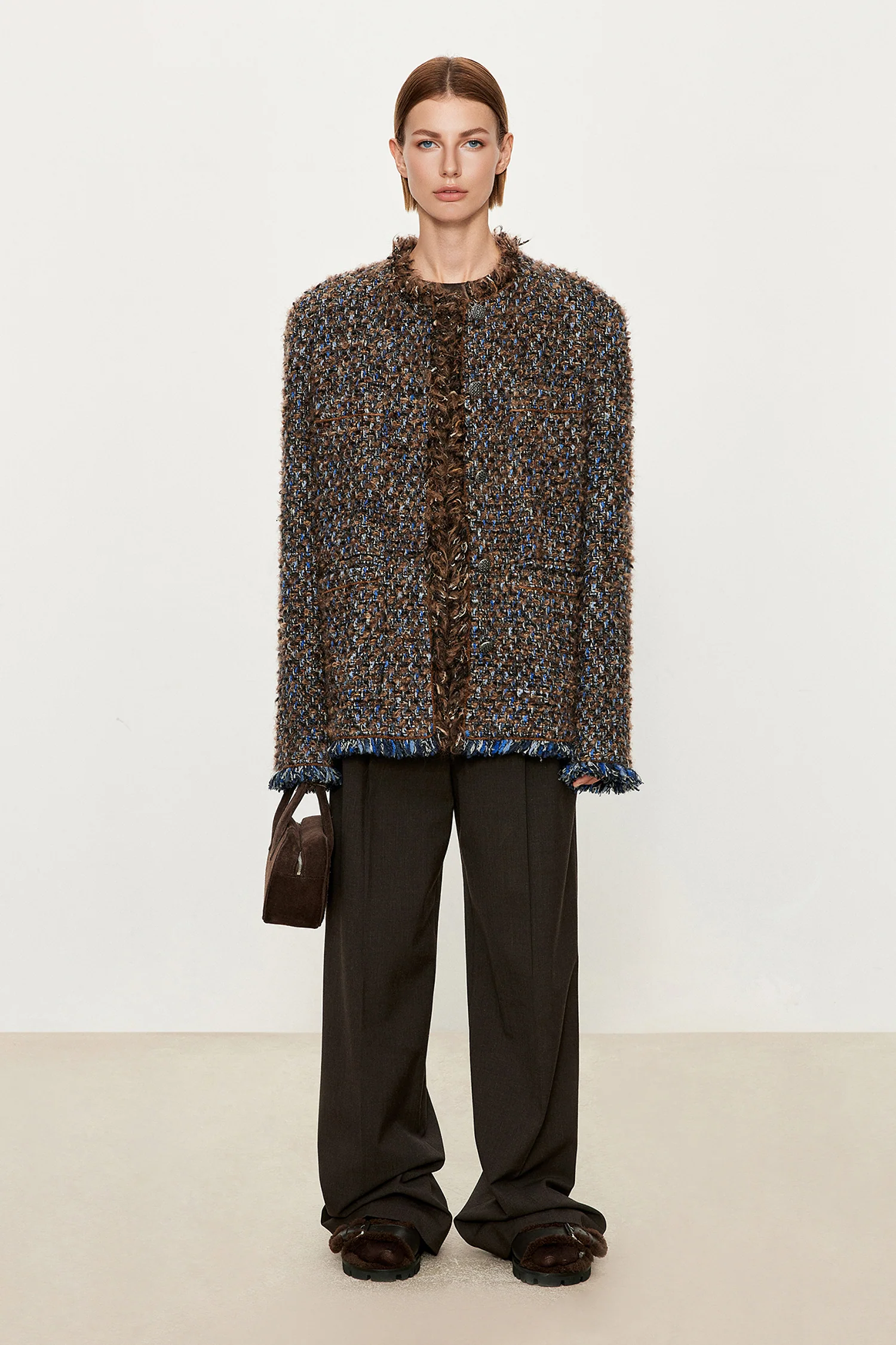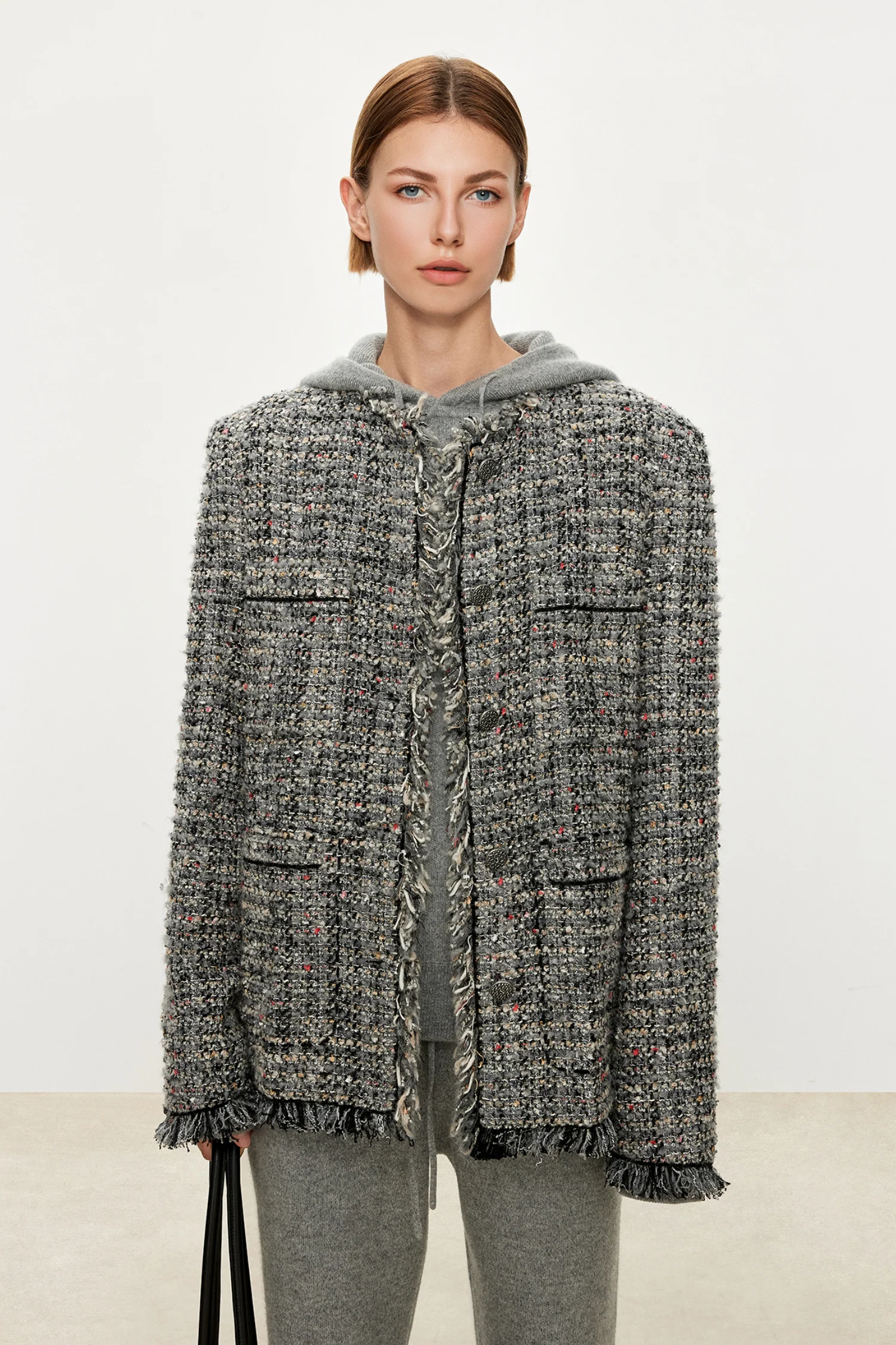 Oversized Wool Metallic Tweed Jacket with Braided Trim