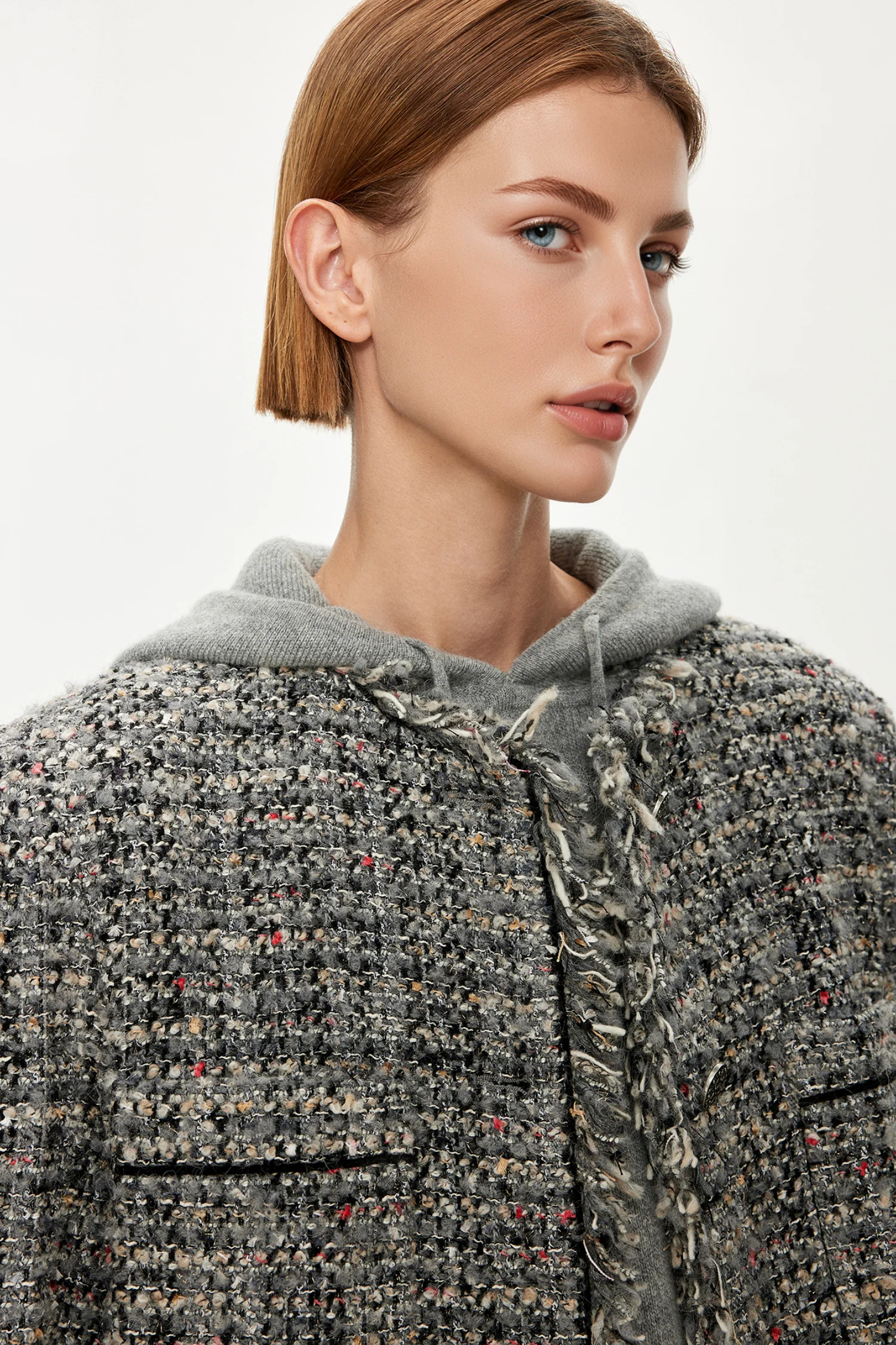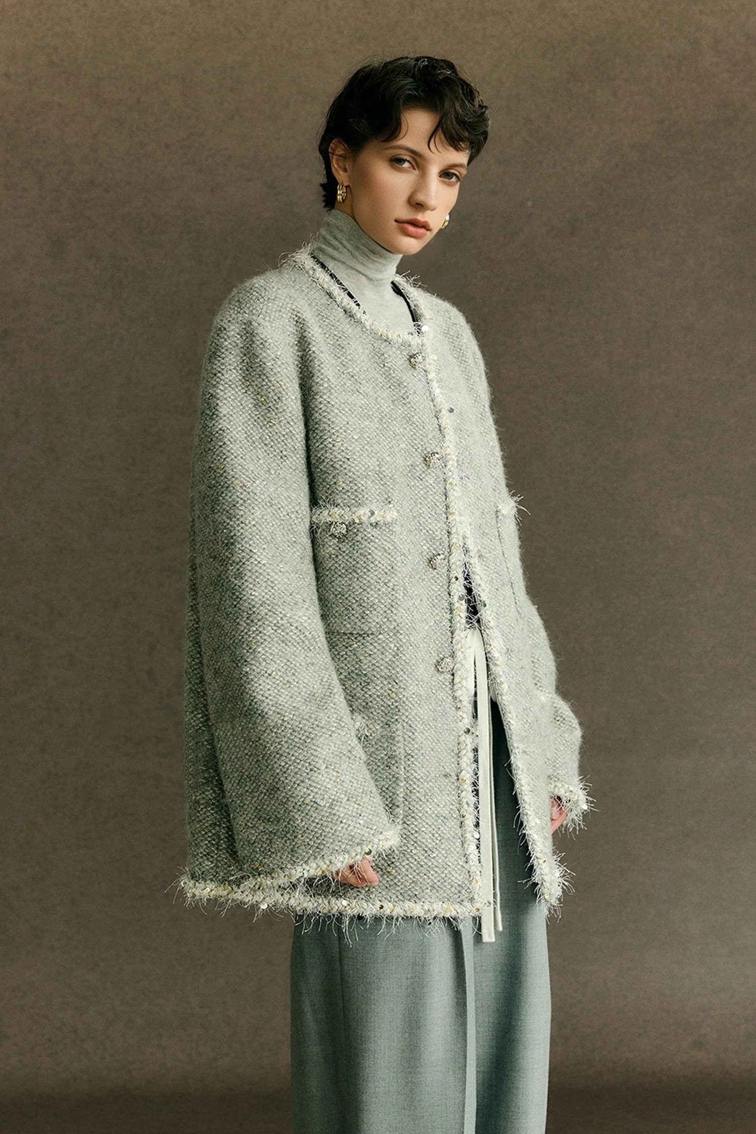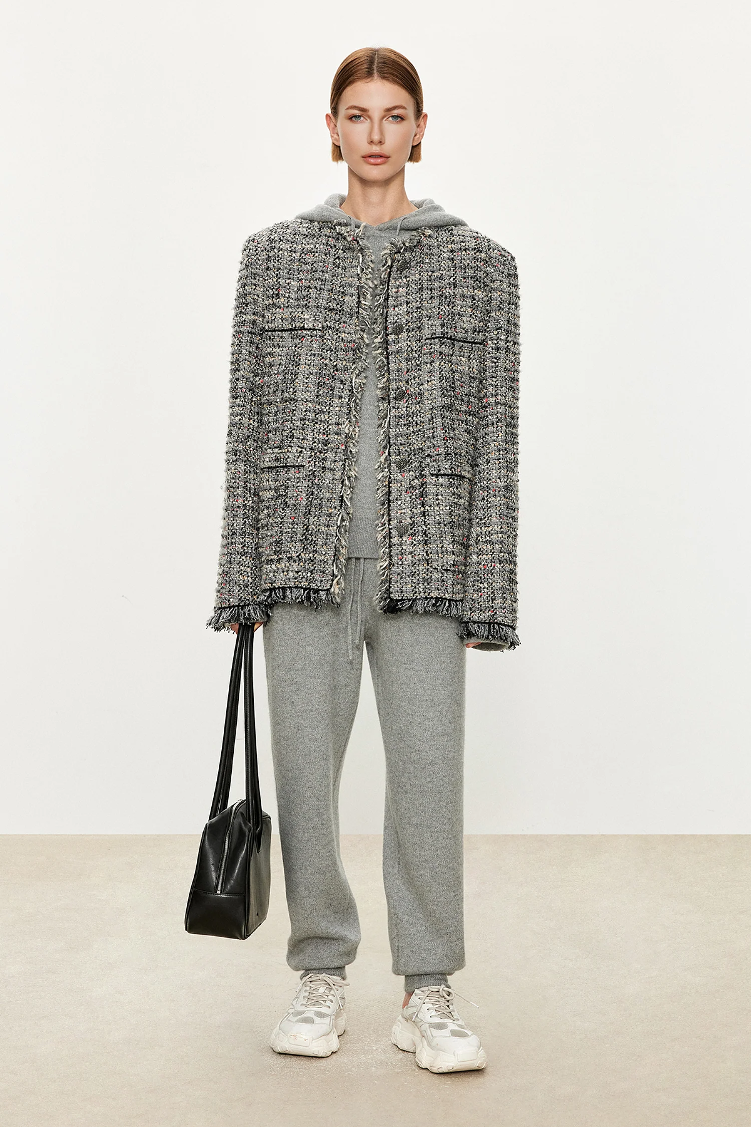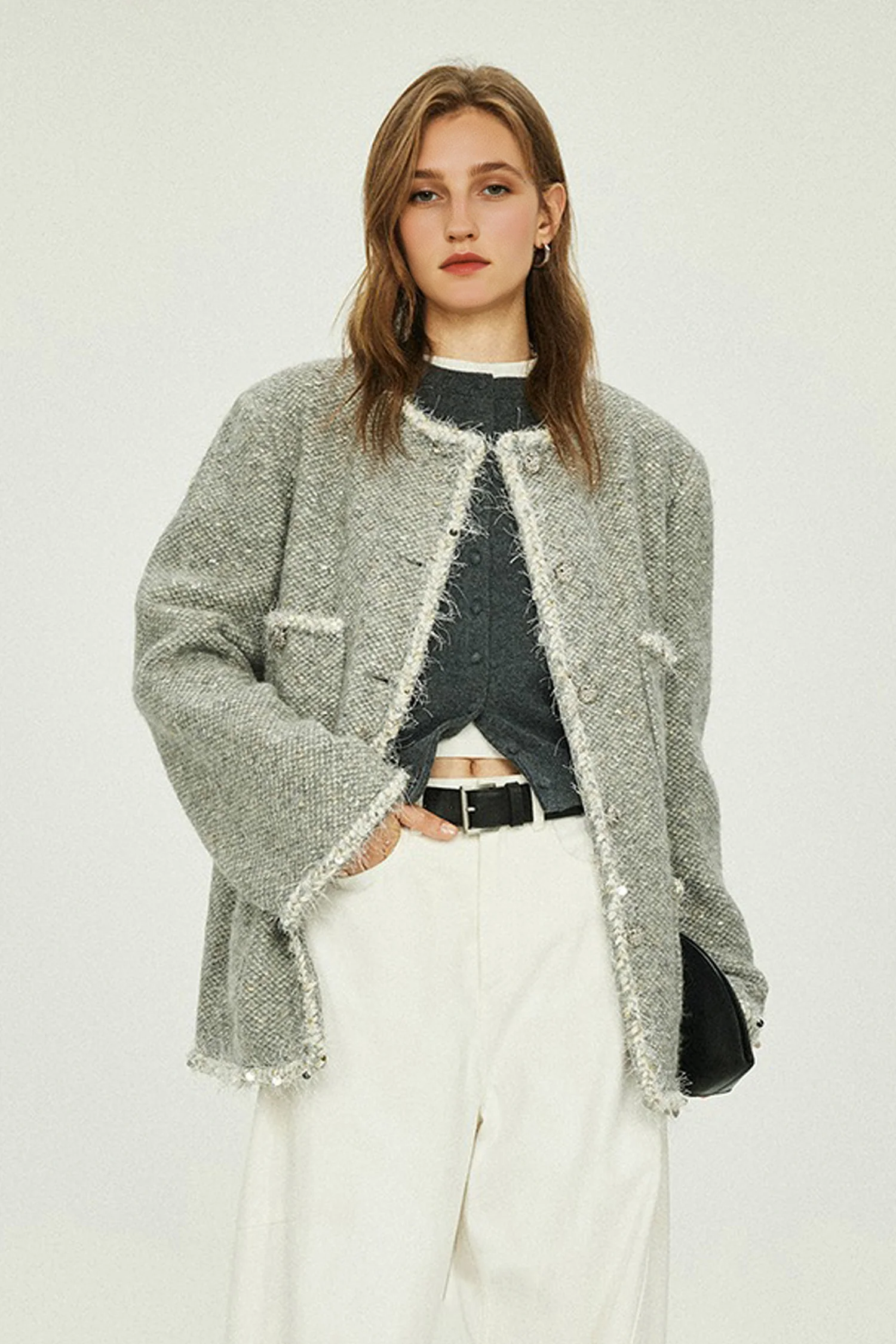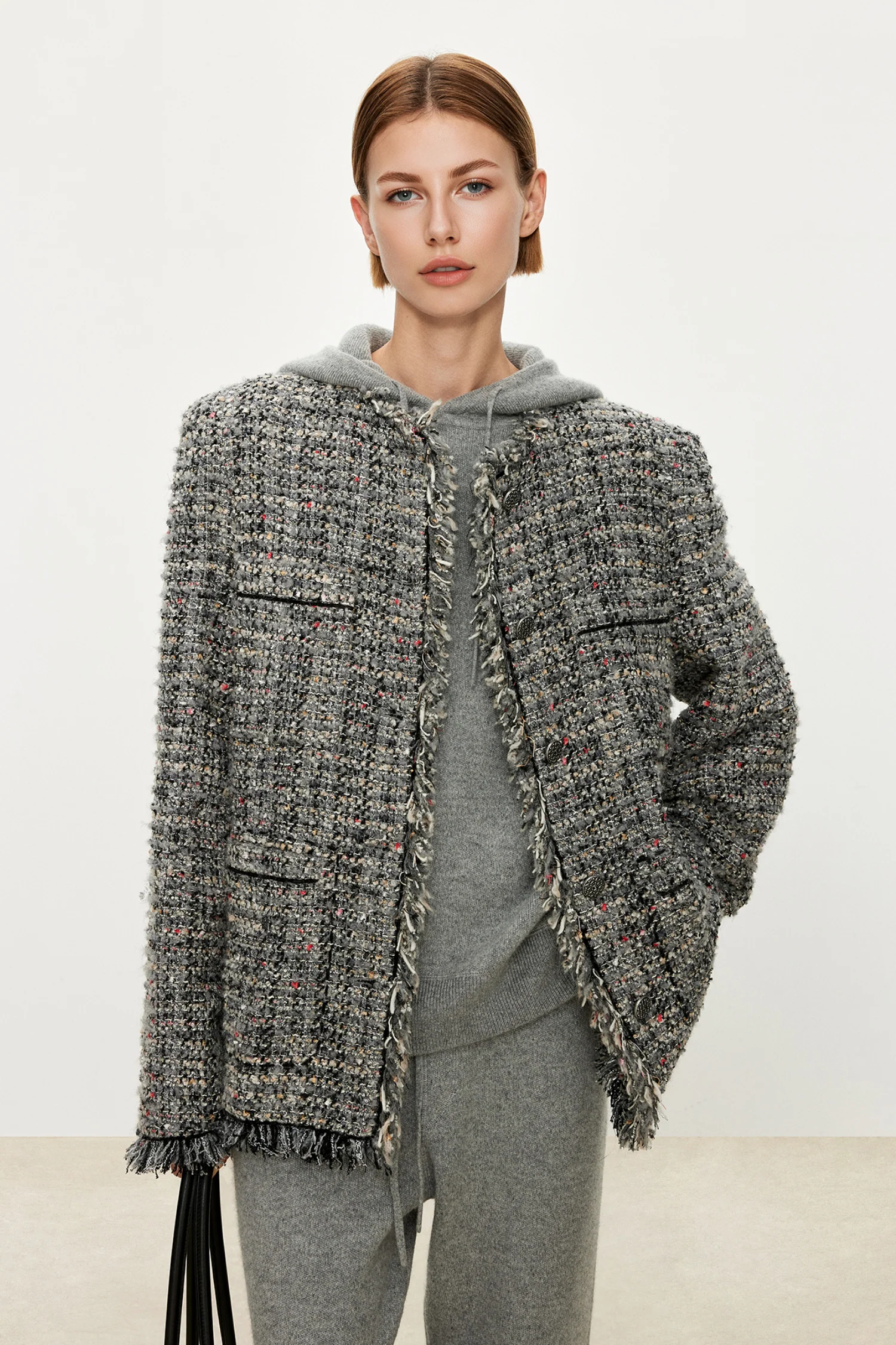 Oversized Wool Metallic Tweed Jacket with Braided Trim