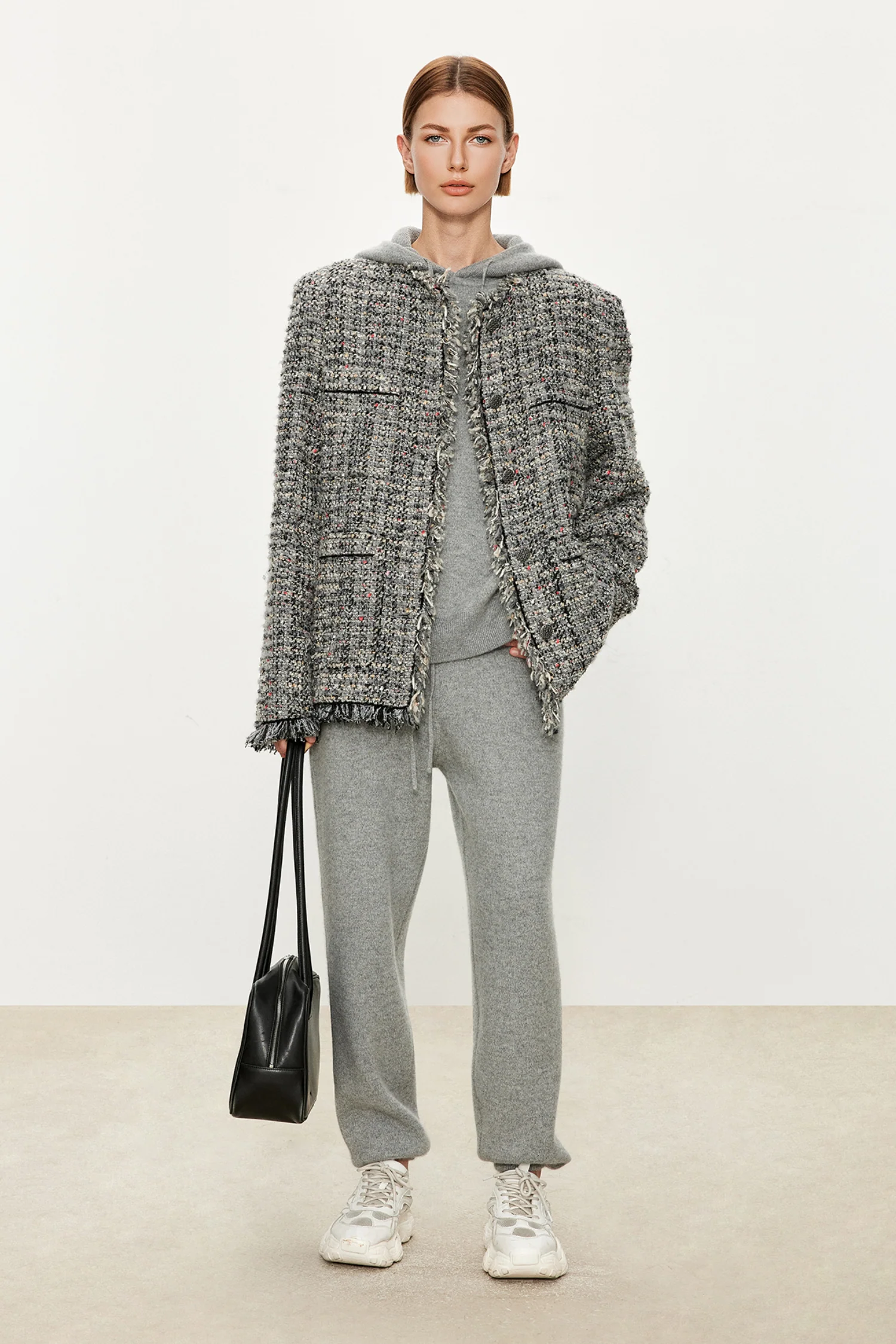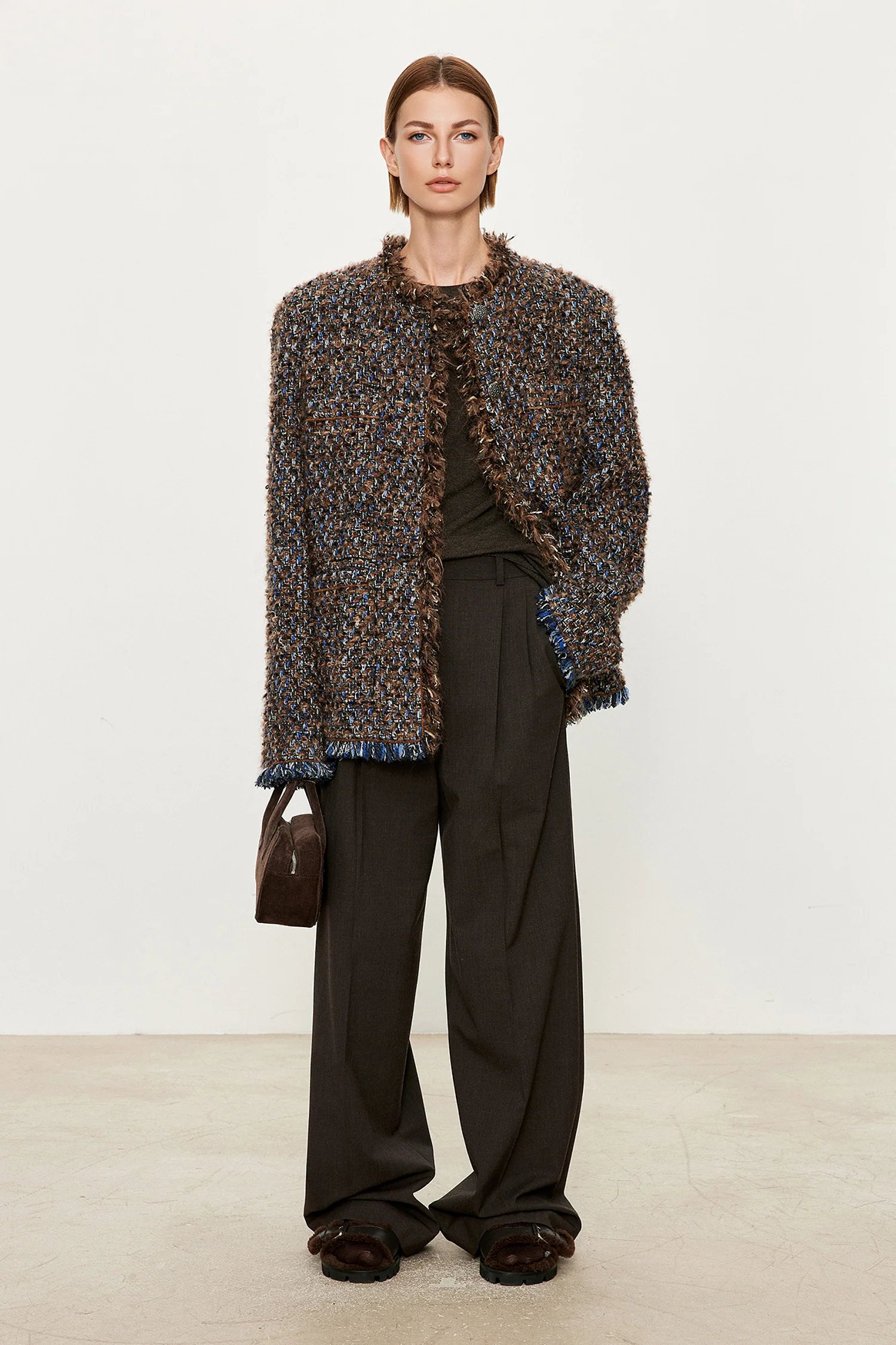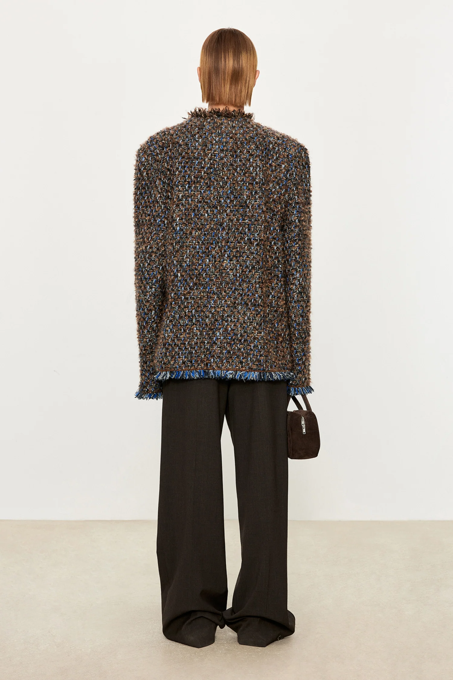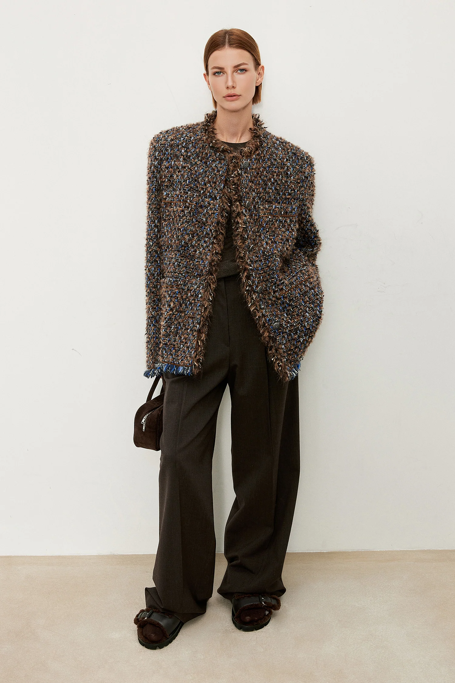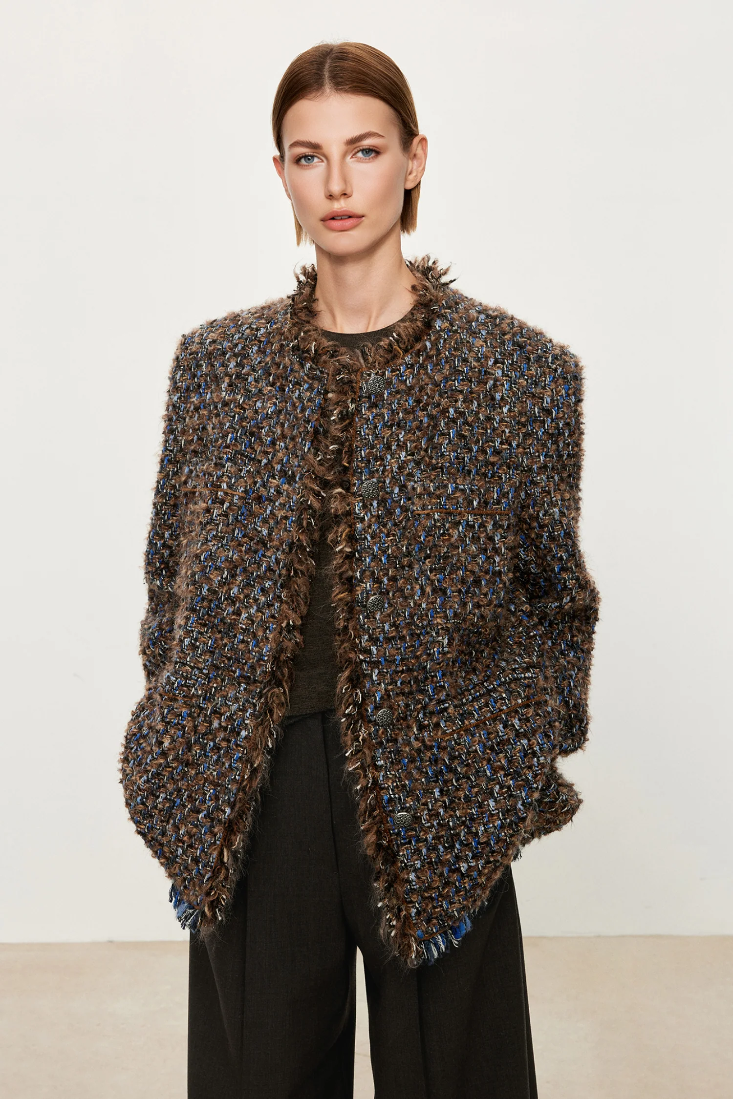 Oversized Wool Metallic Tweed Jacket with Braided Trim