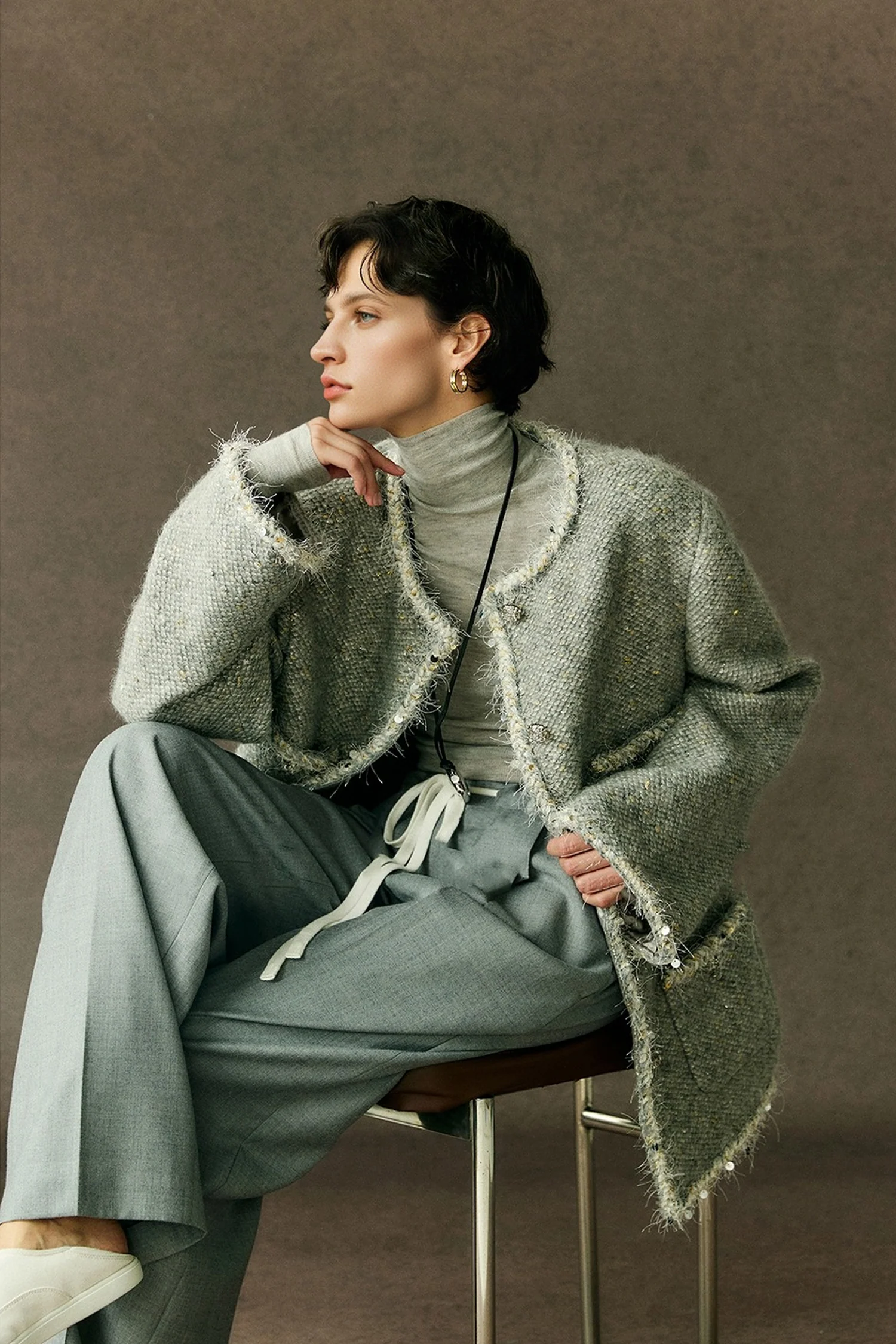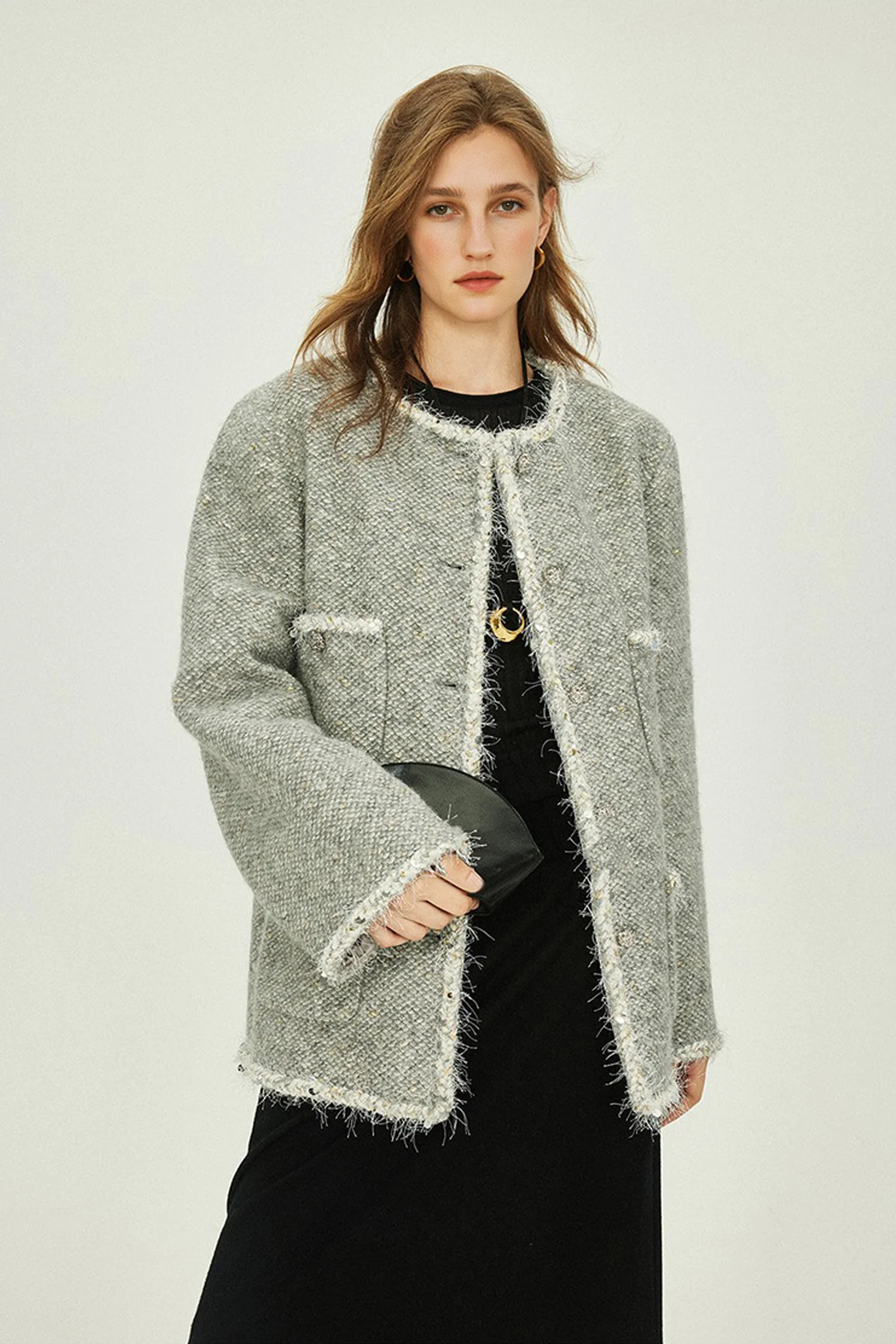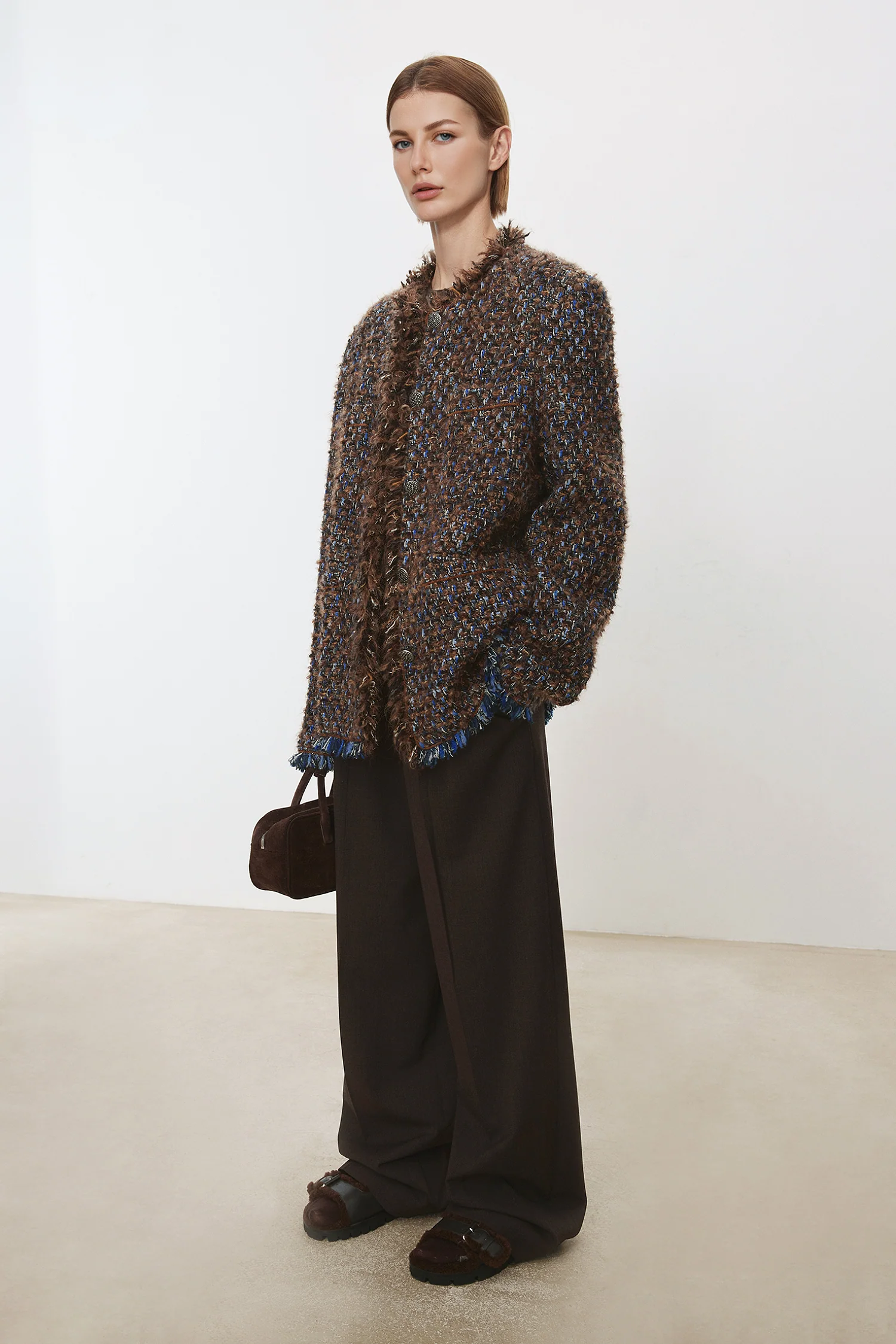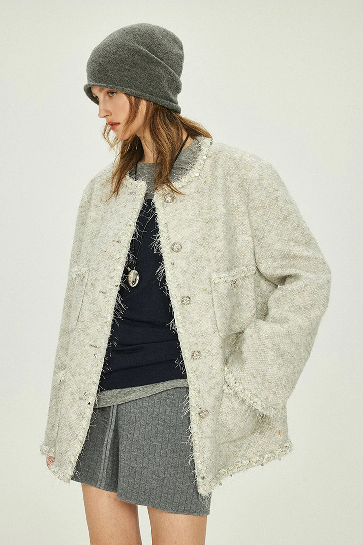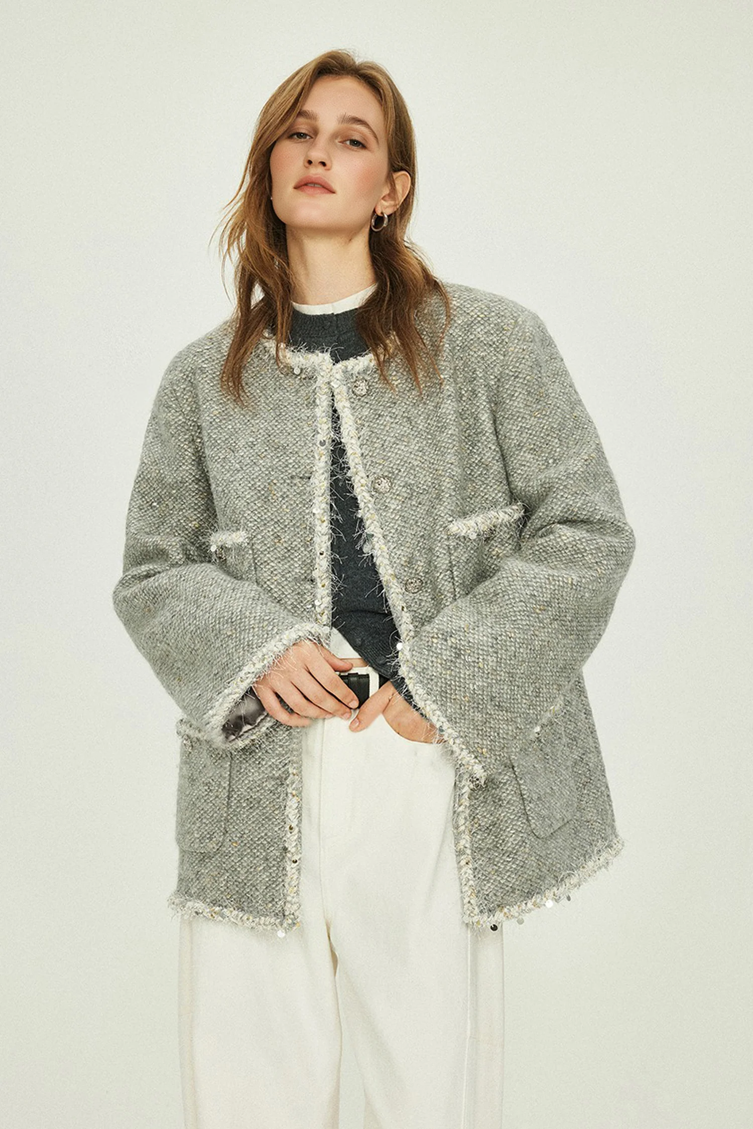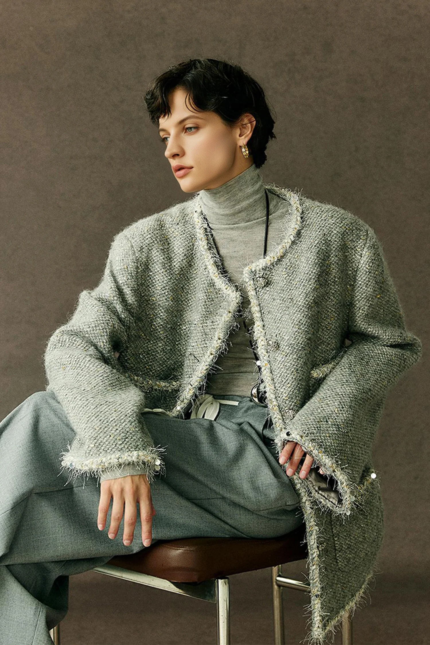 Oversized Wool Metallic Tweed Jacket with Braided Trim
