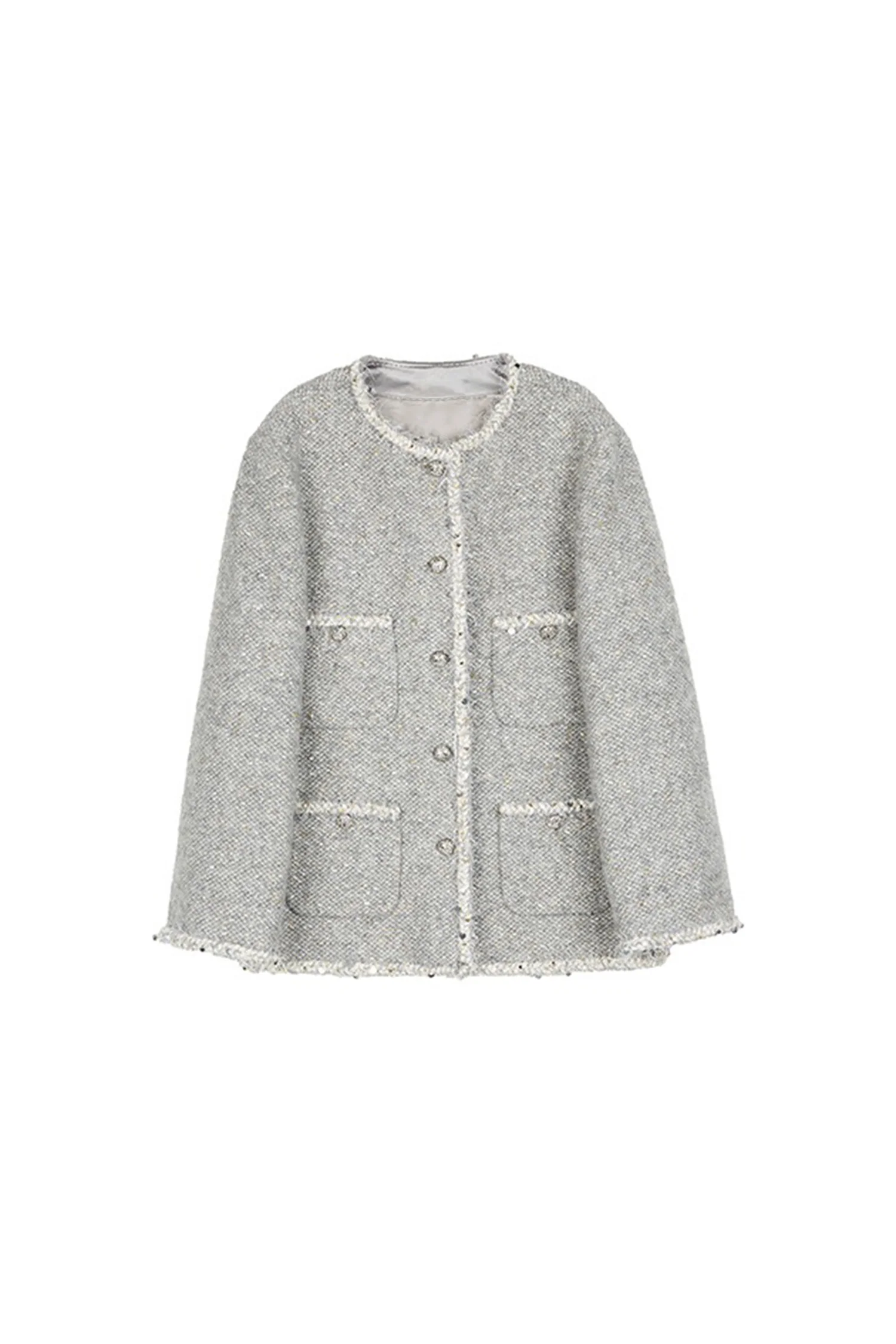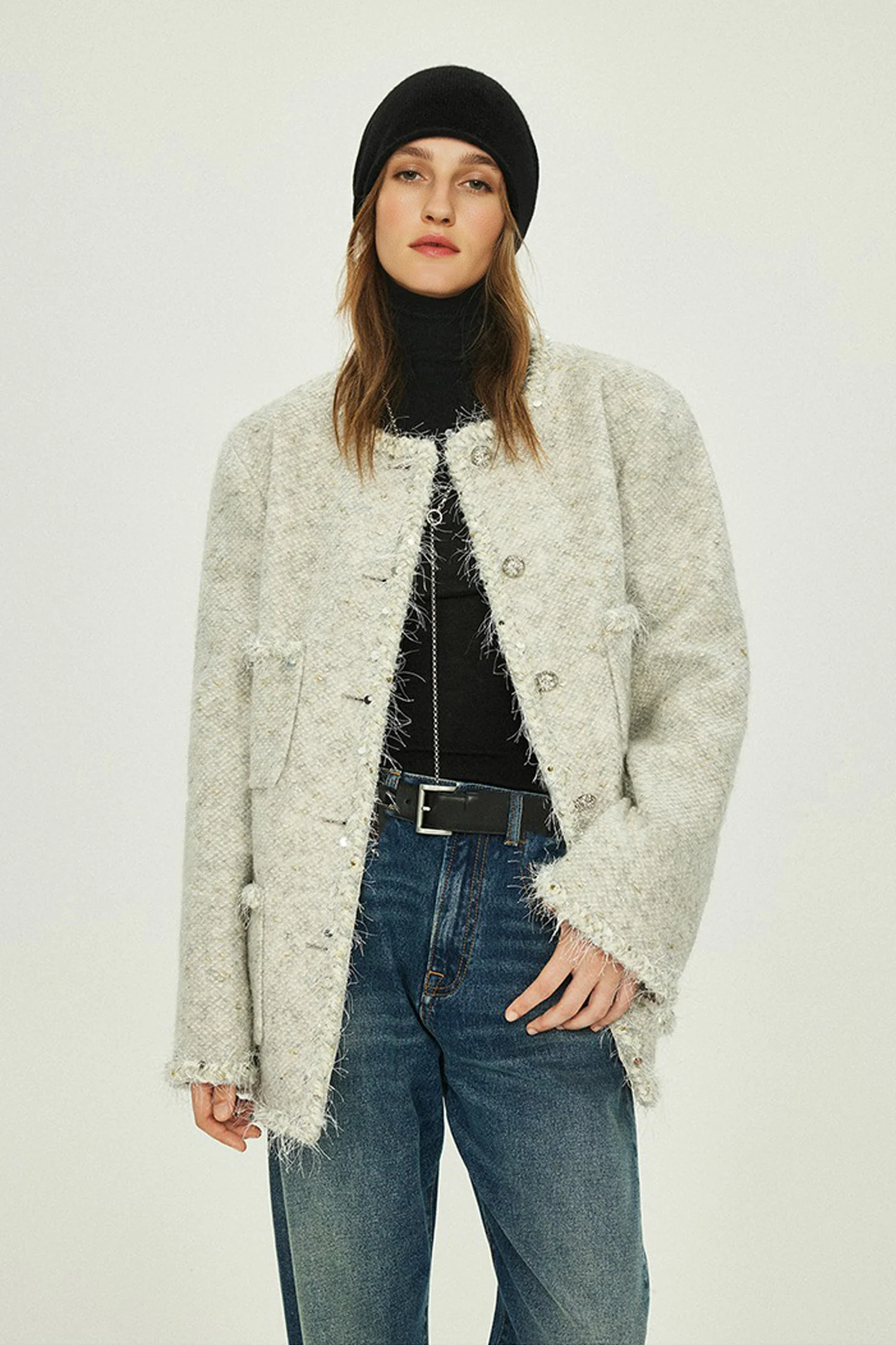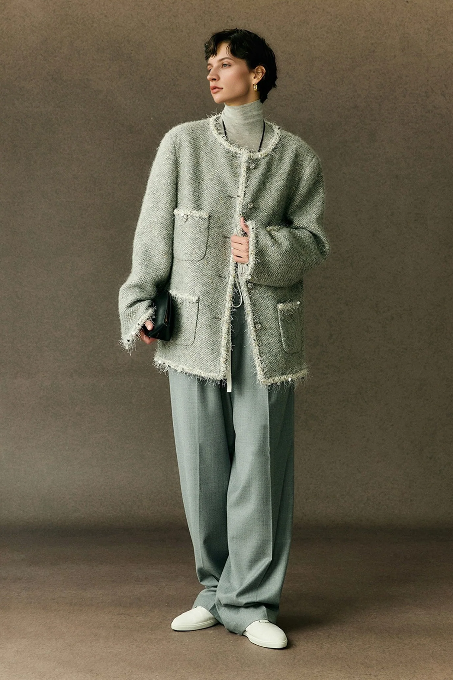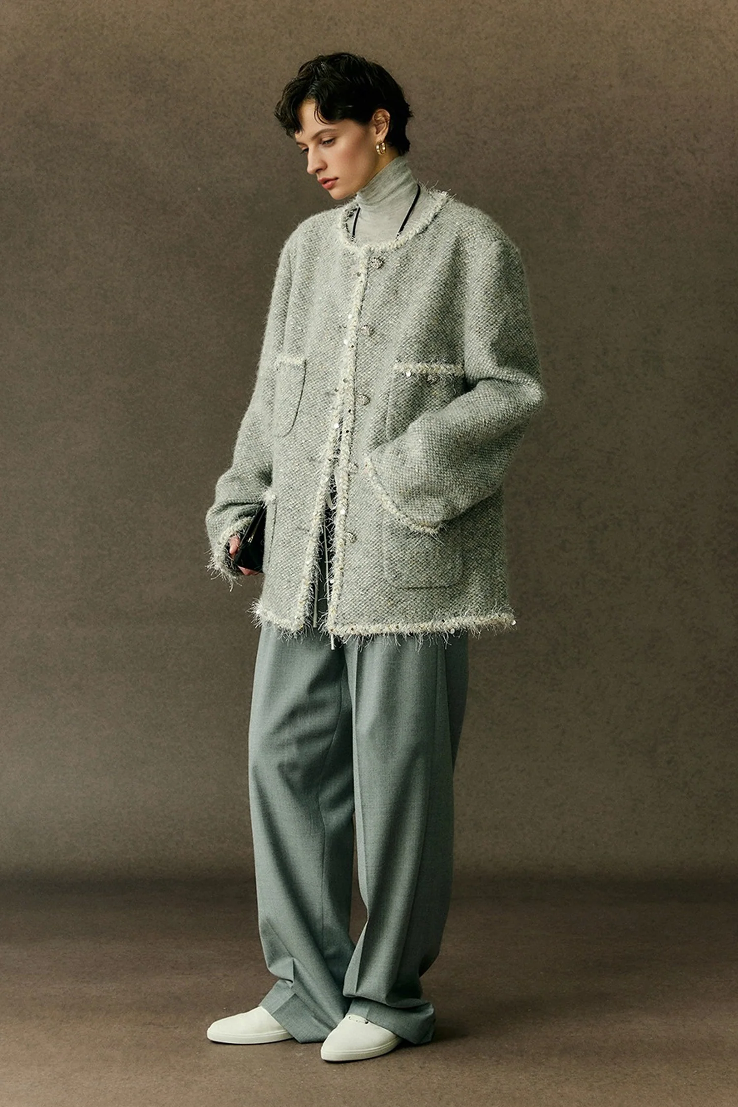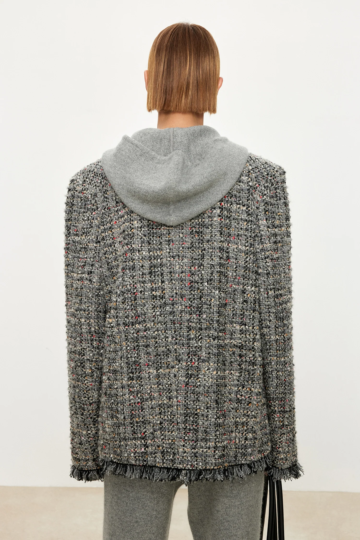 Oversized Wool Metallic Tweed Jacket with Braided Trim