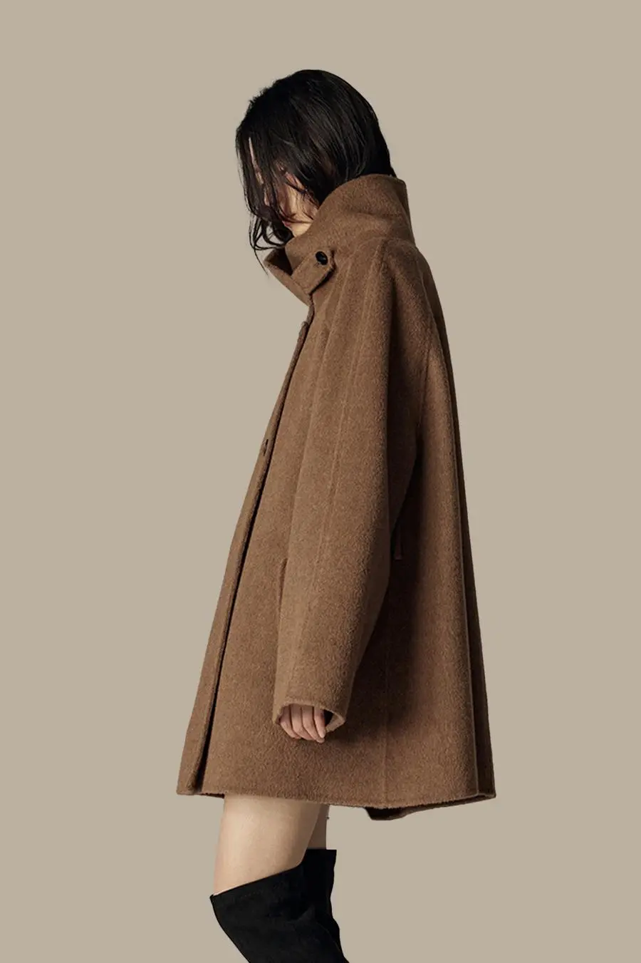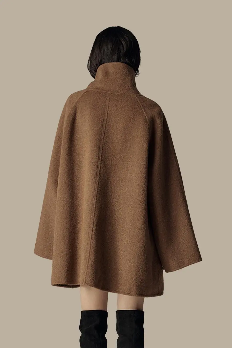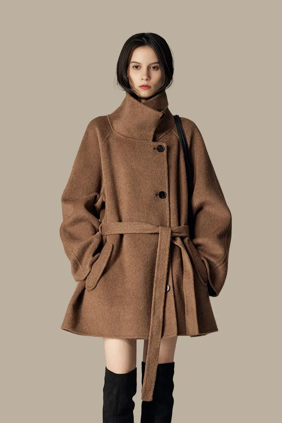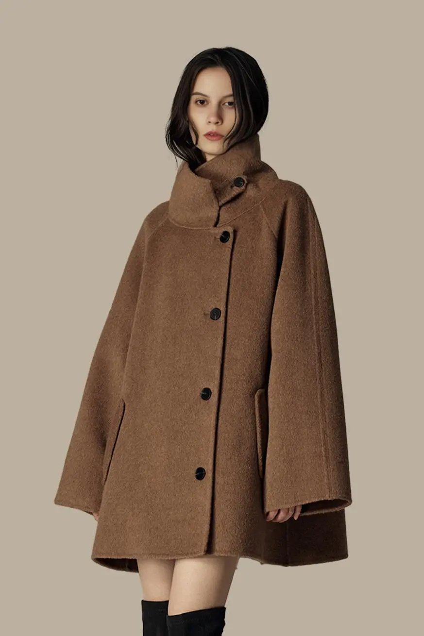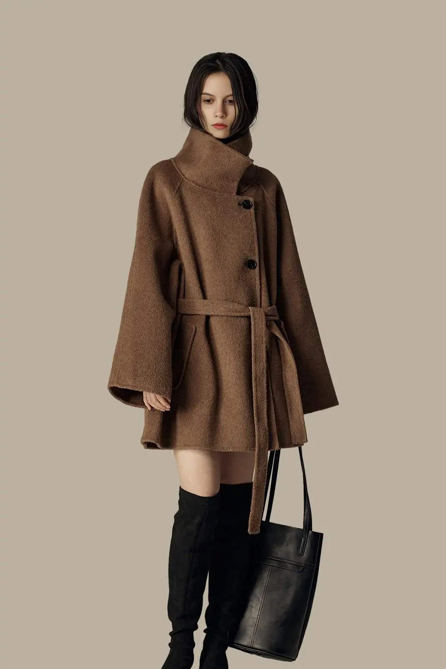 Oversized Wool Alpaca Stand Collar Cape Coat with Belt