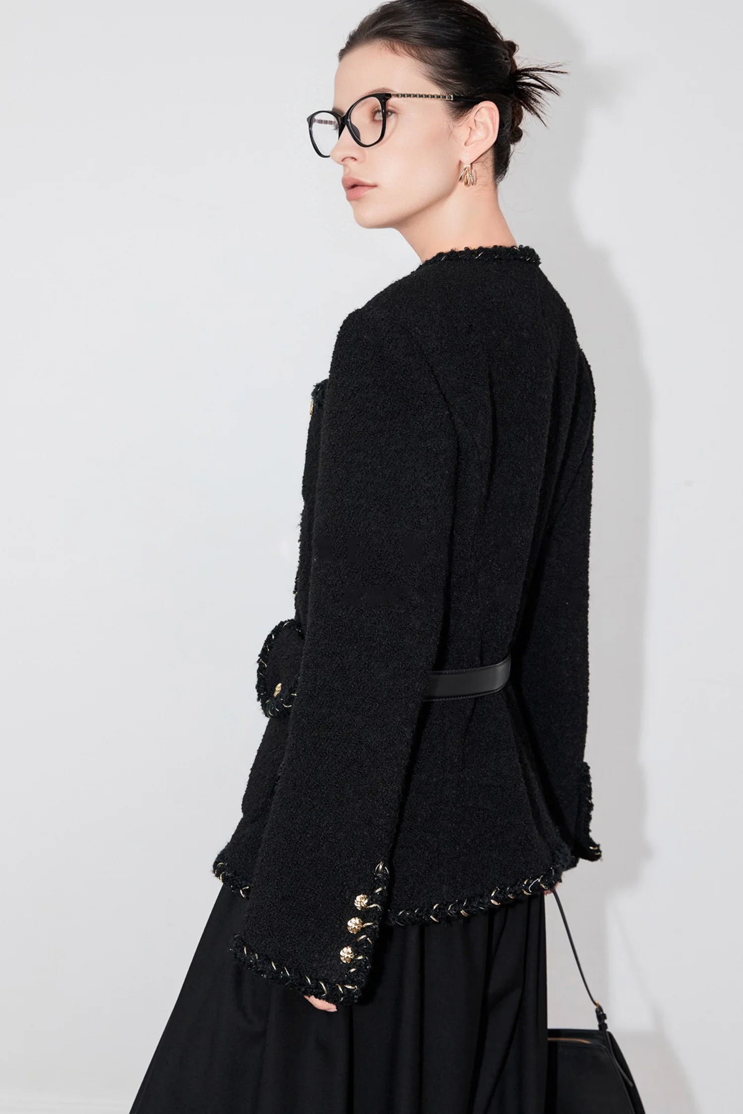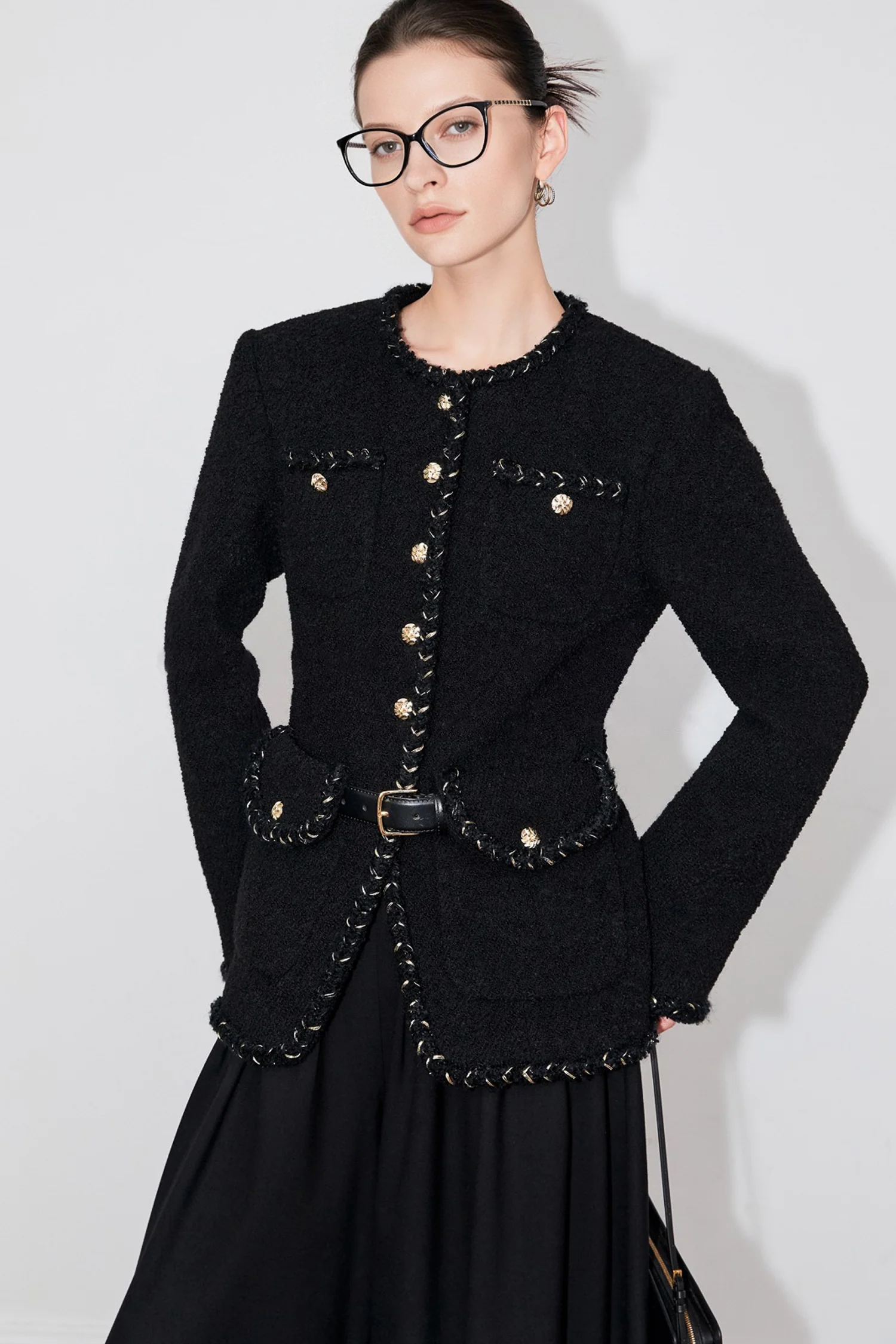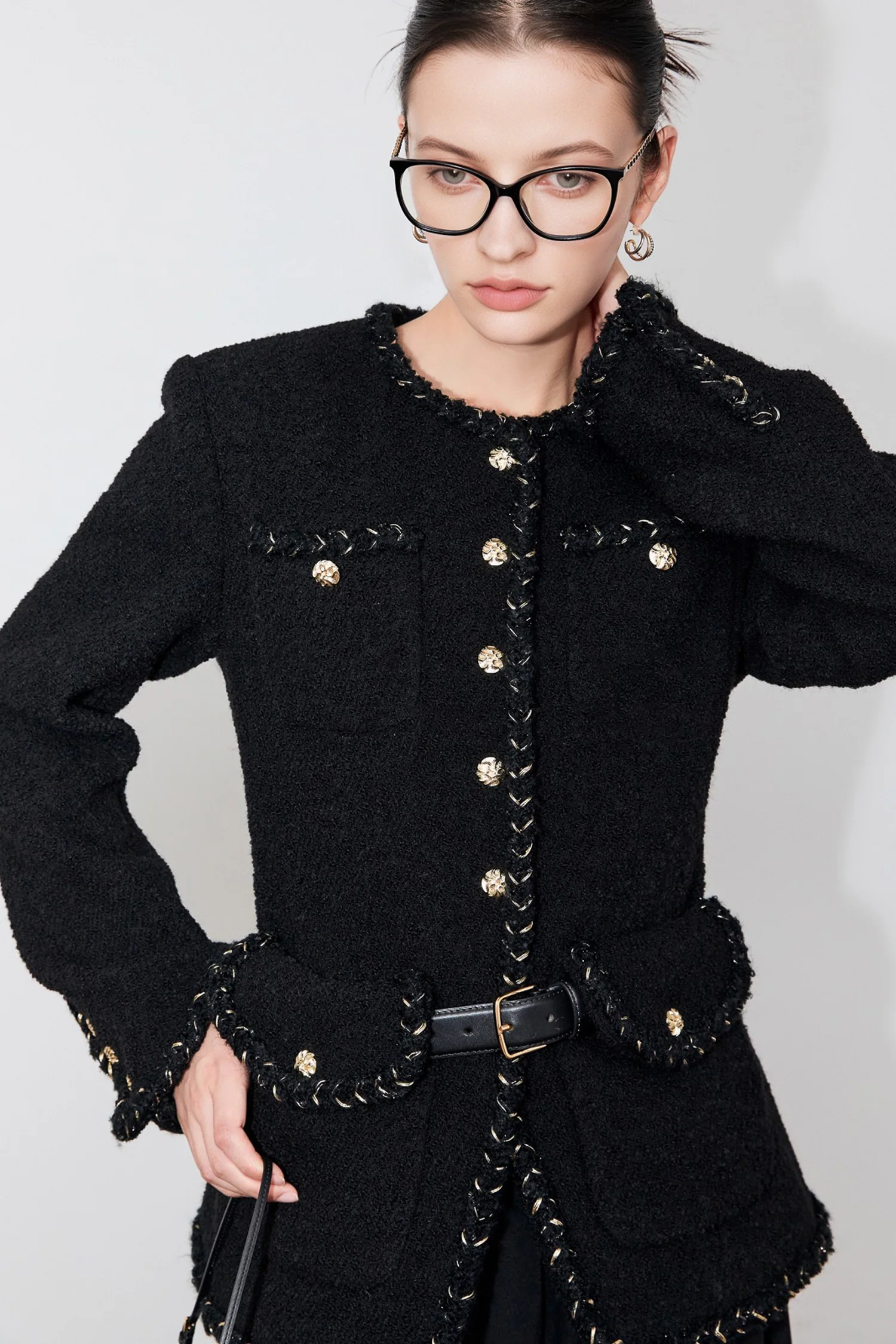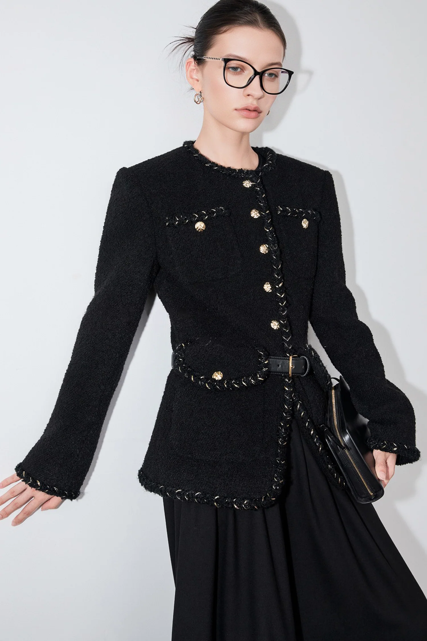 Chic Wool Tweed Braided-Trim Belted Jacket