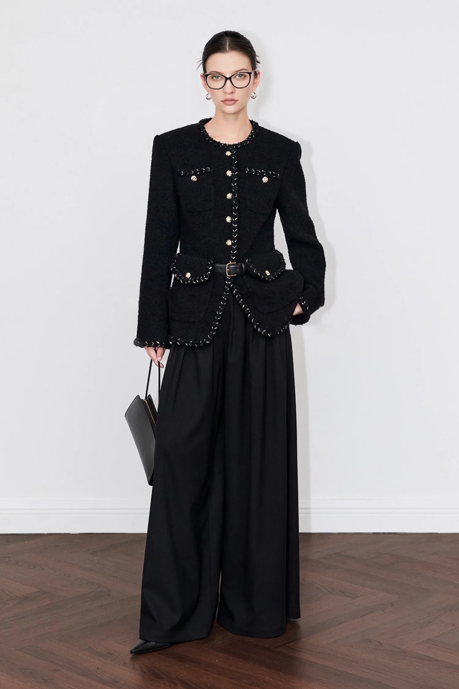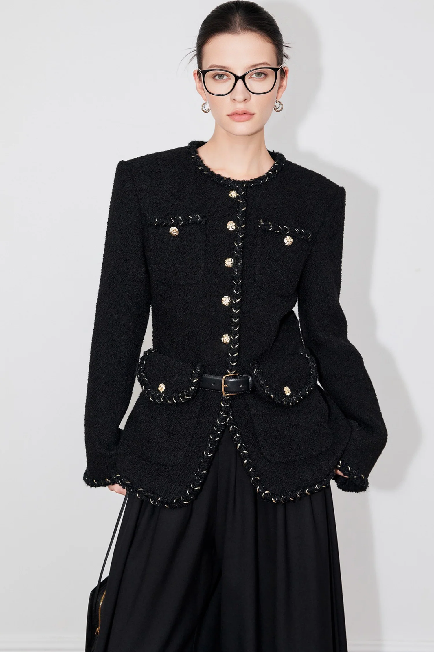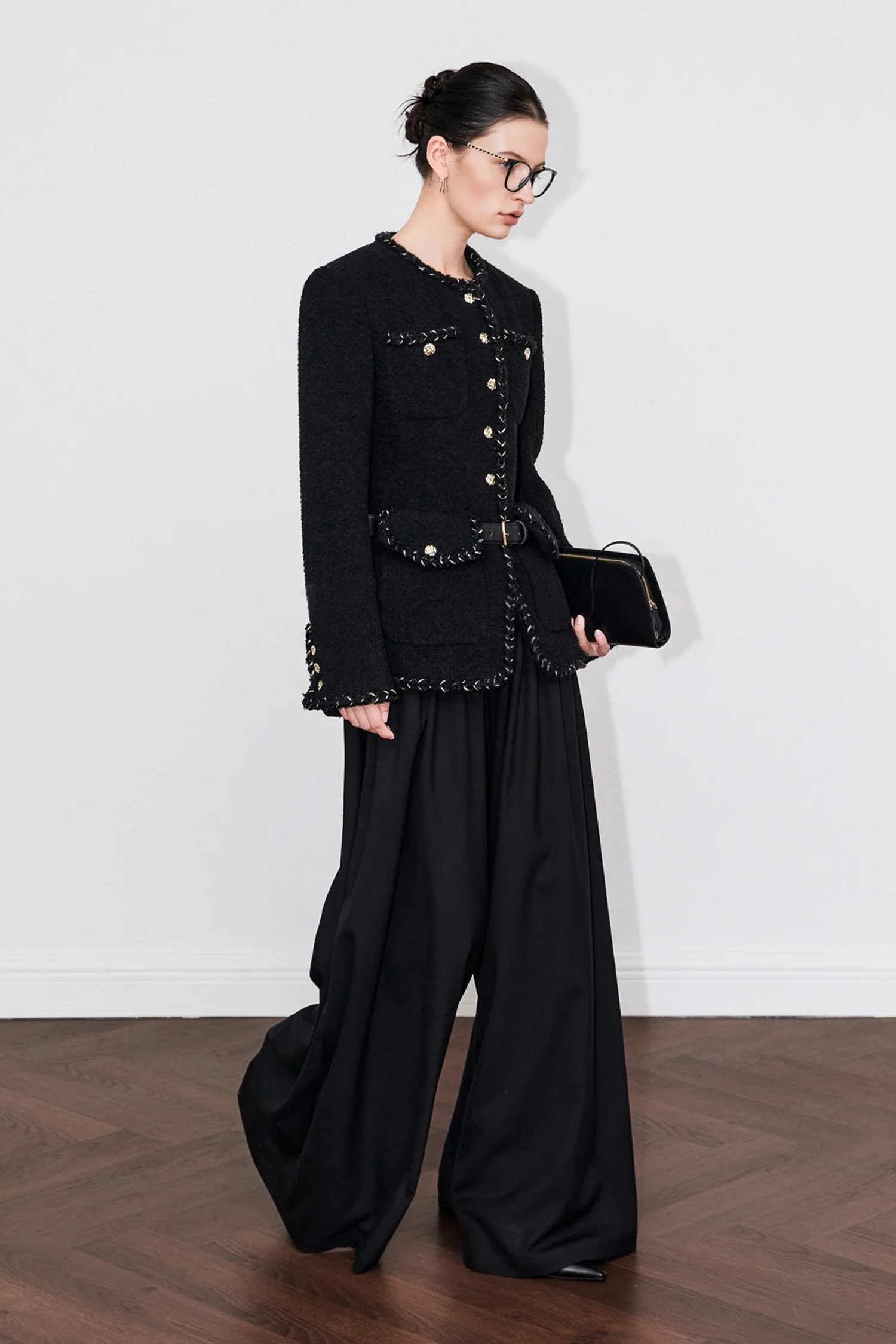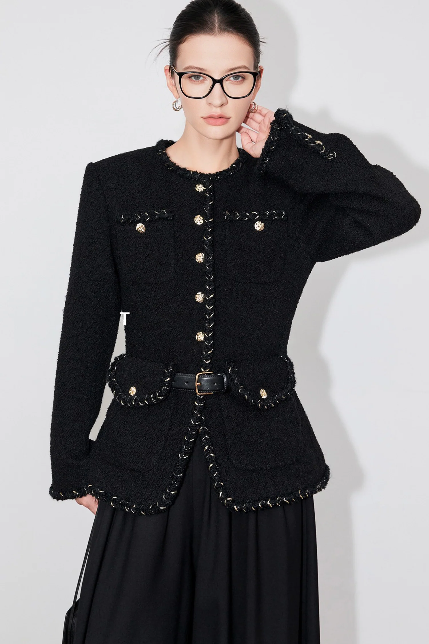 Chic Wool Tweed Braided-Trim Belted Jacket
