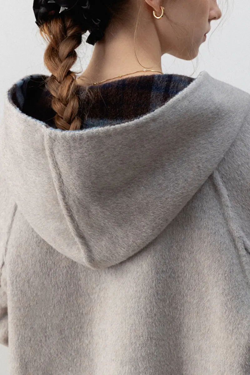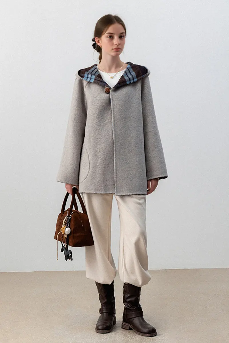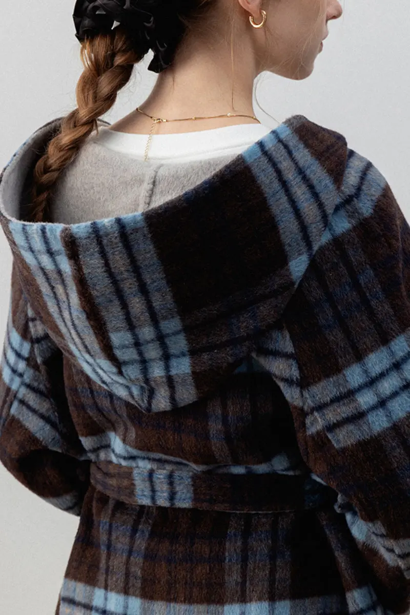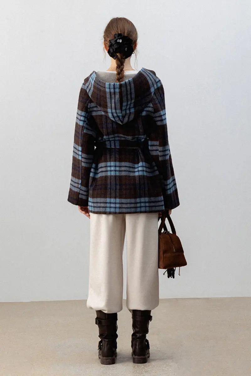 Reversible Vintage Short Plaid Wool Coat with Hood and Belt