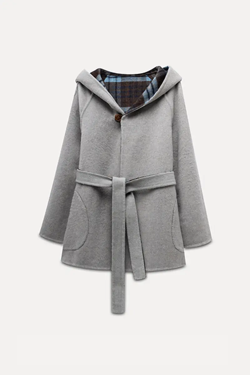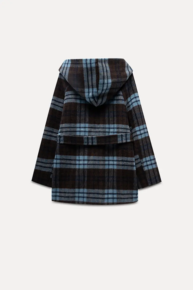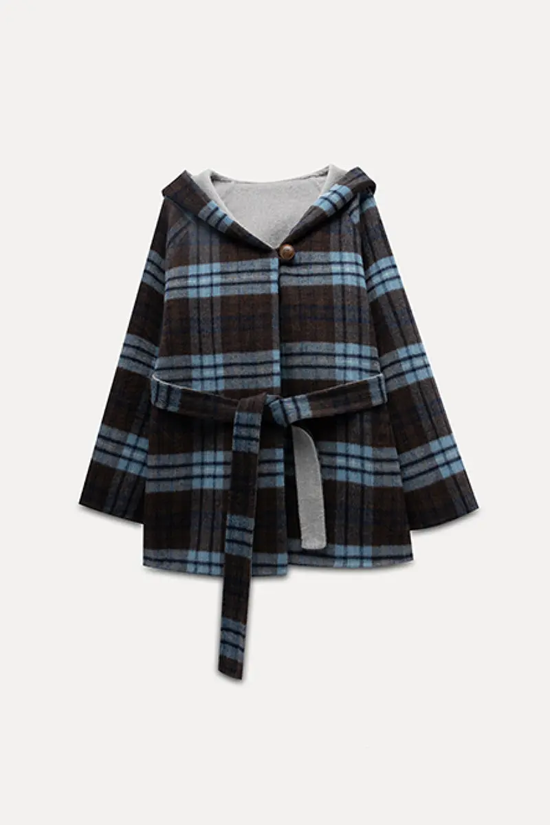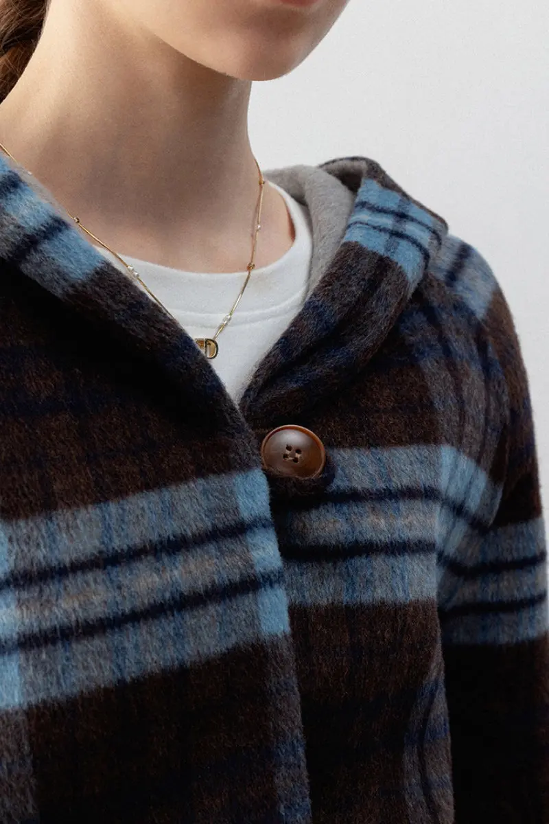 Reversible Vintage Short Plaid Wool Coat with Hood and Belt