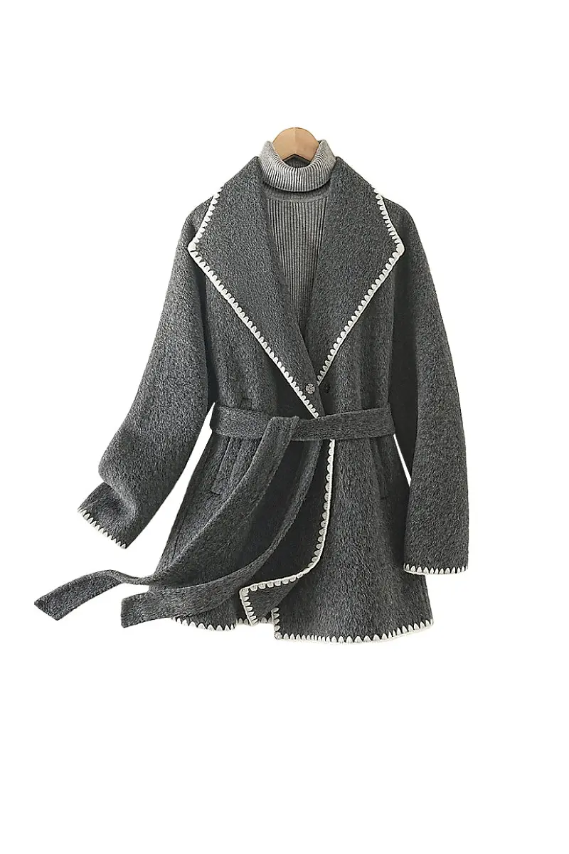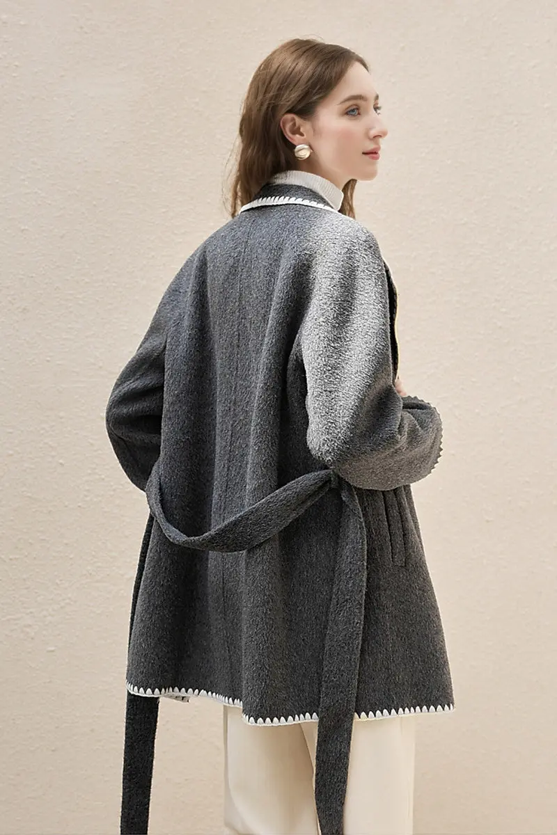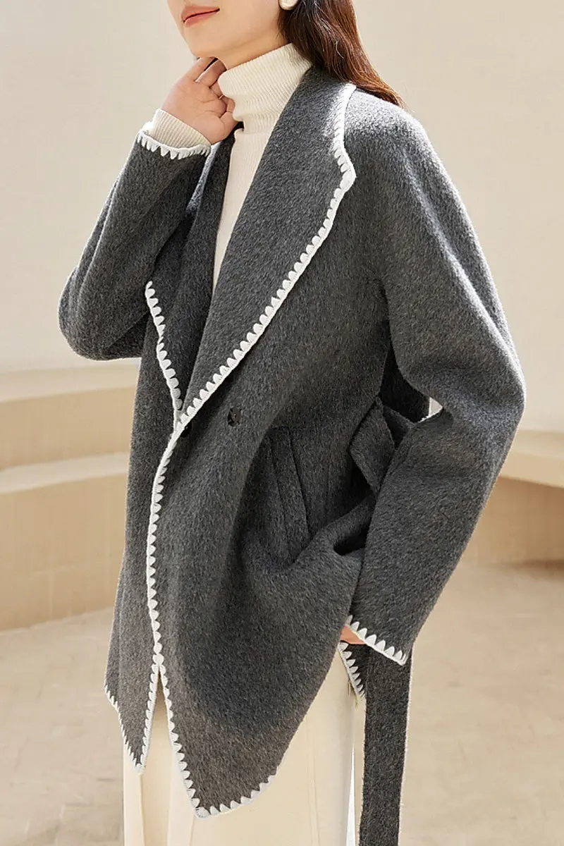Oversized Wool Belted Wrap Coat With White Contrasting Stitch