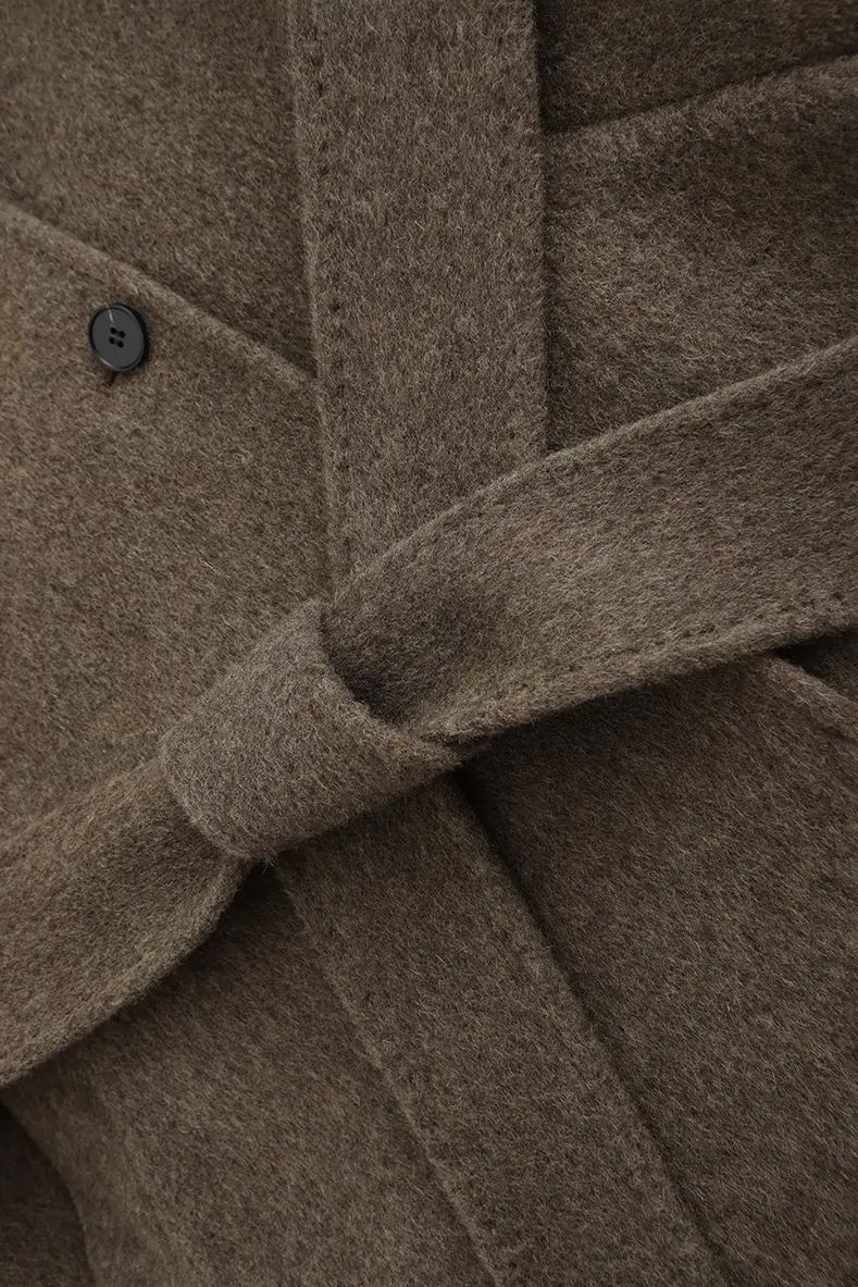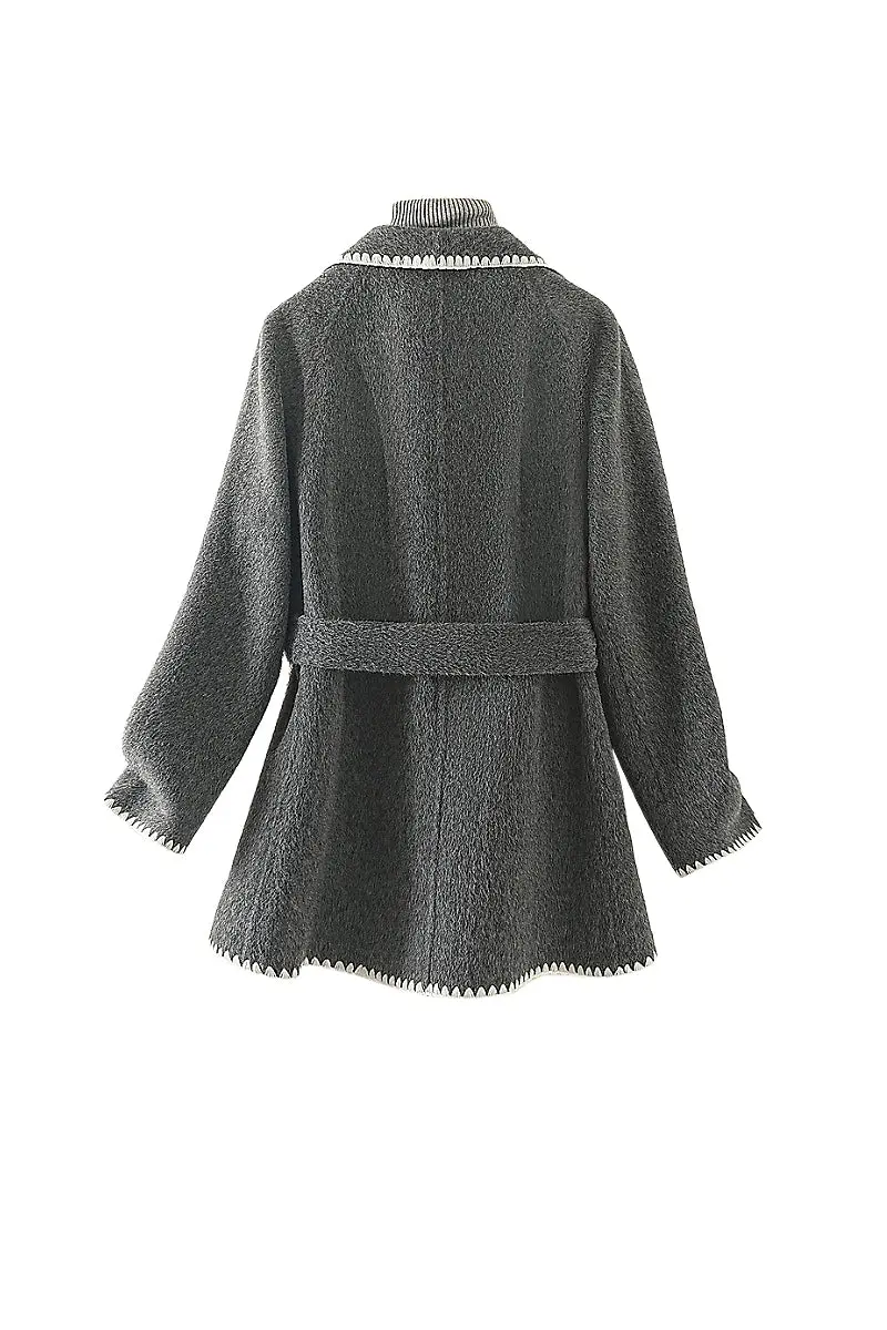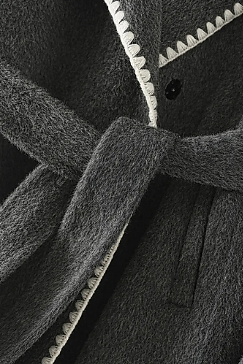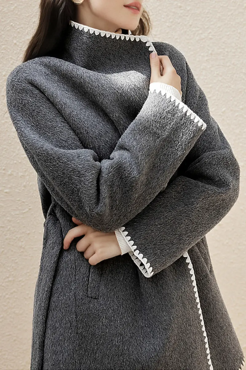 Oversized Wool Belted Wrap Coat With White Contrasting Stitch