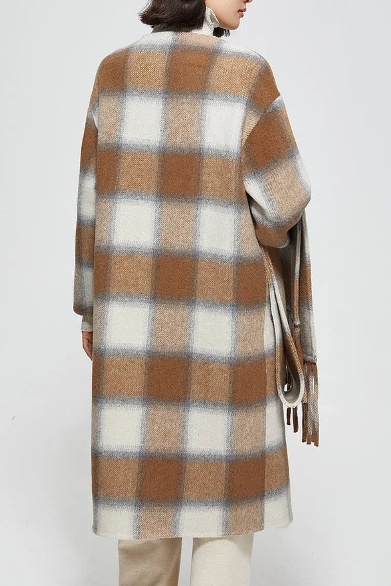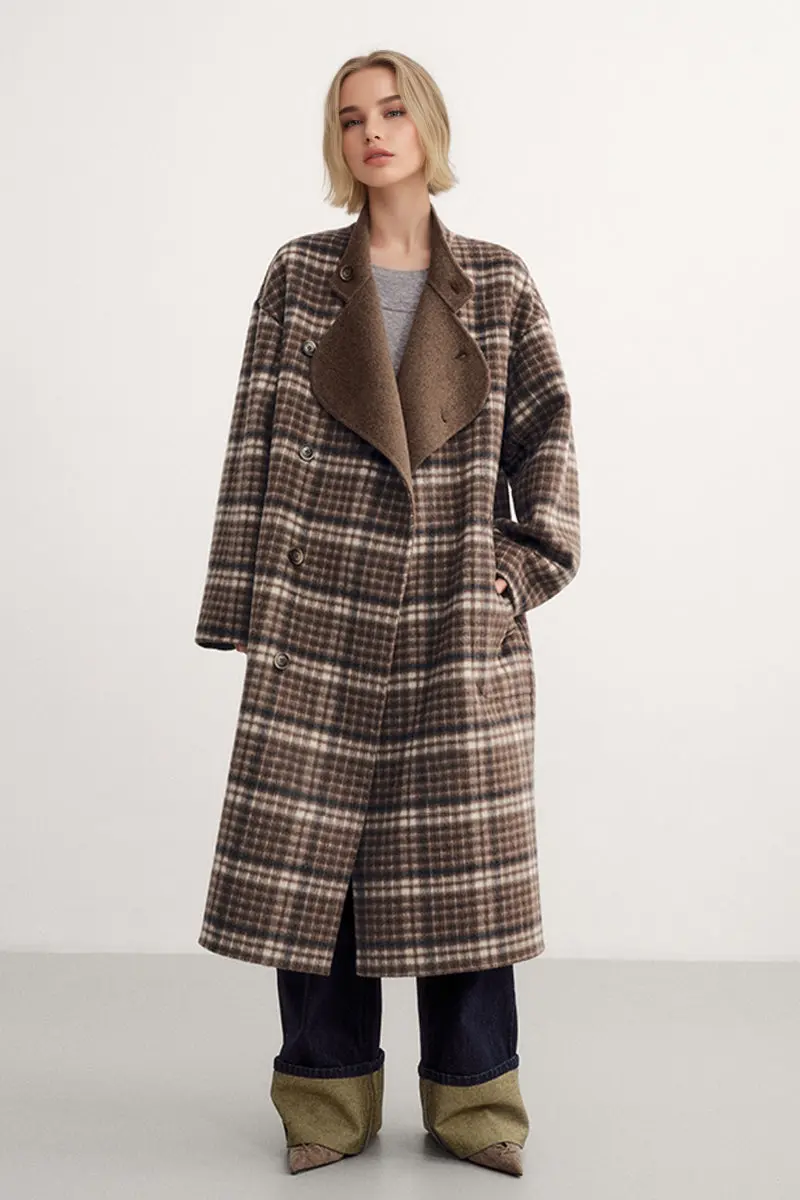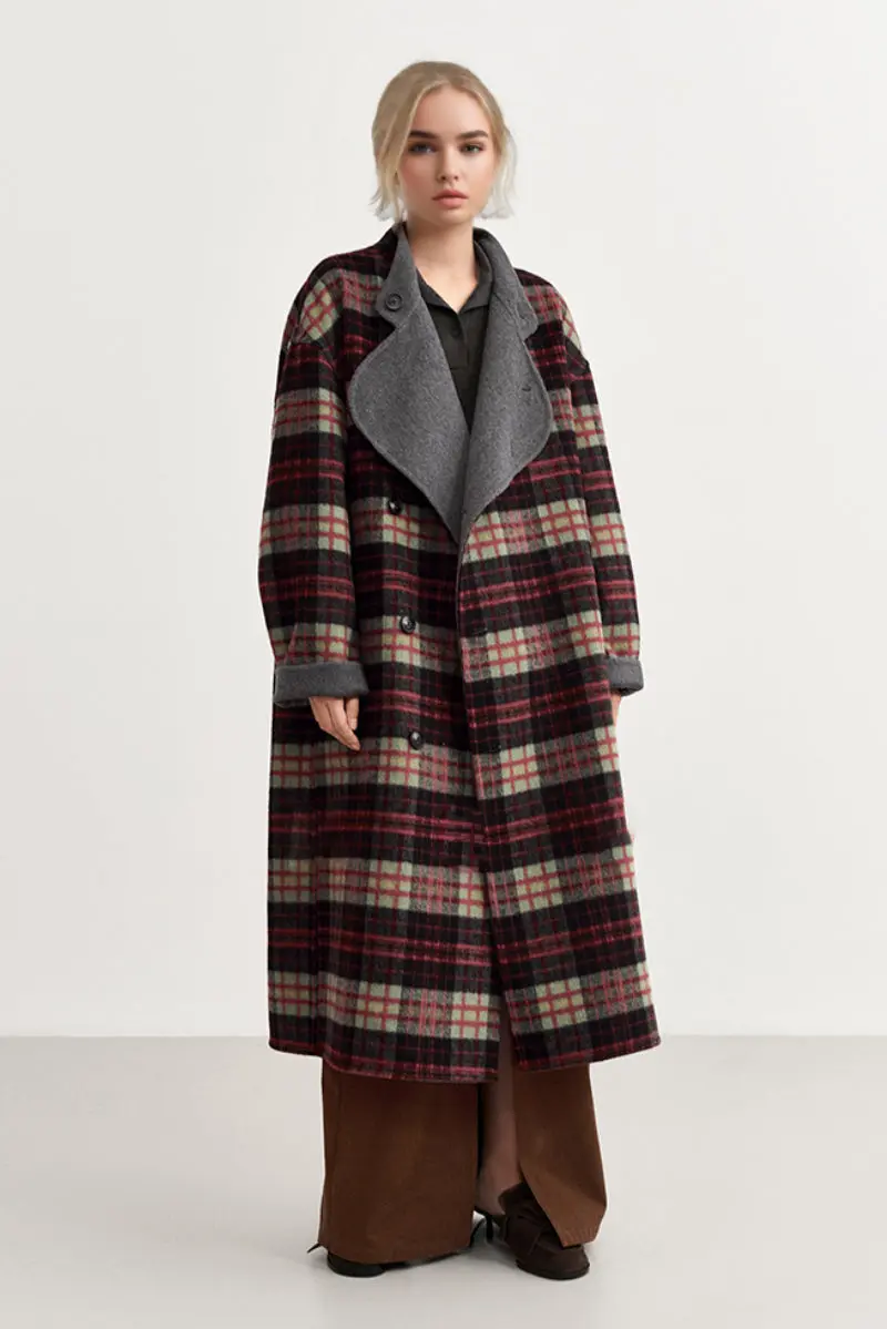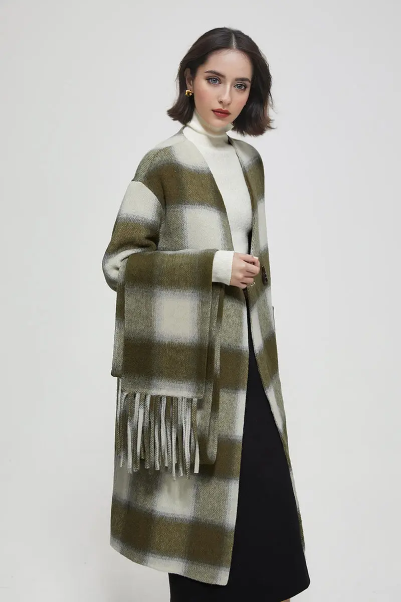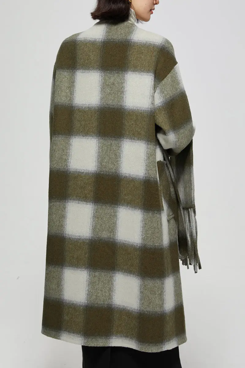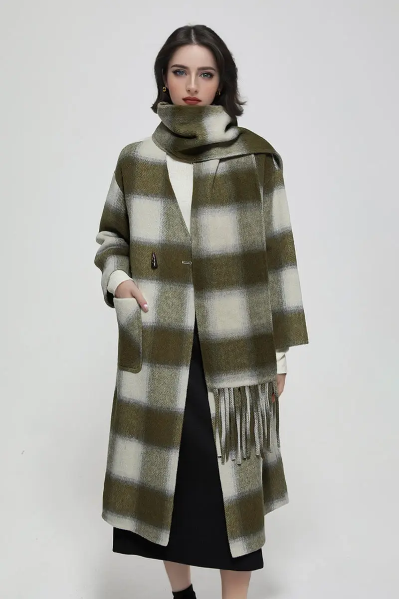 Reversible Double-Face Wool Blend Plaid Coat with Scarf